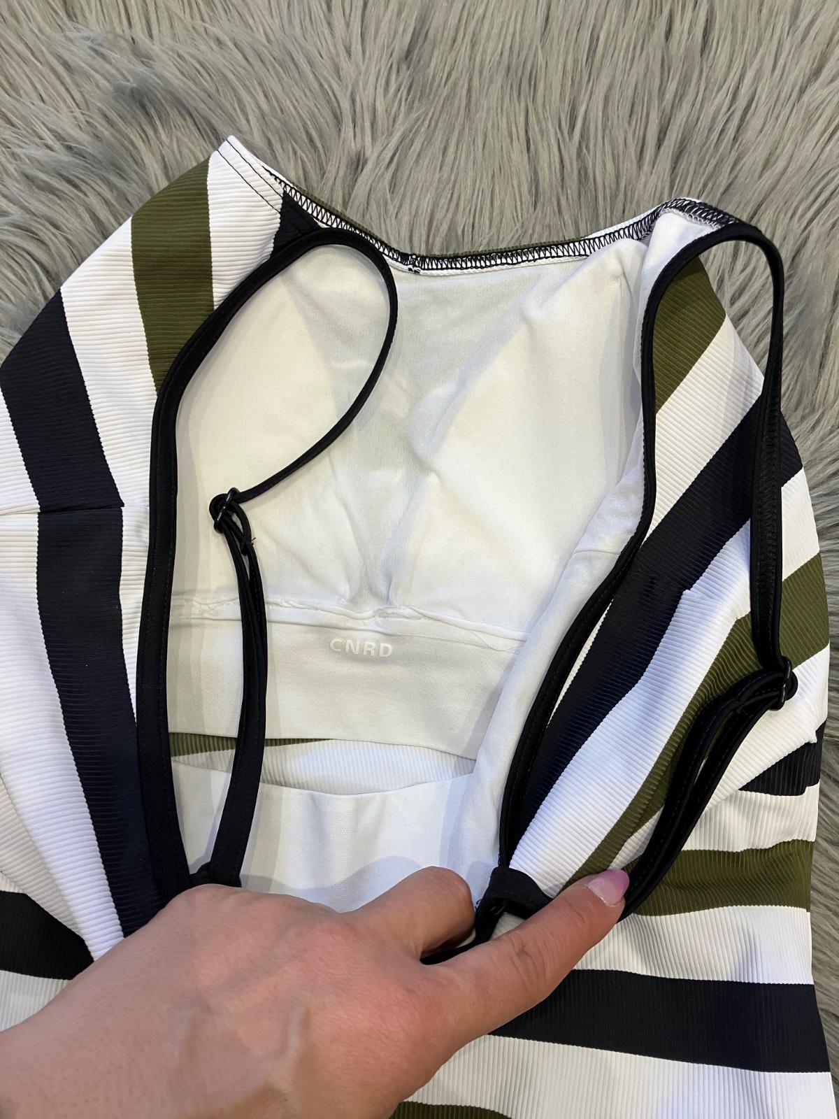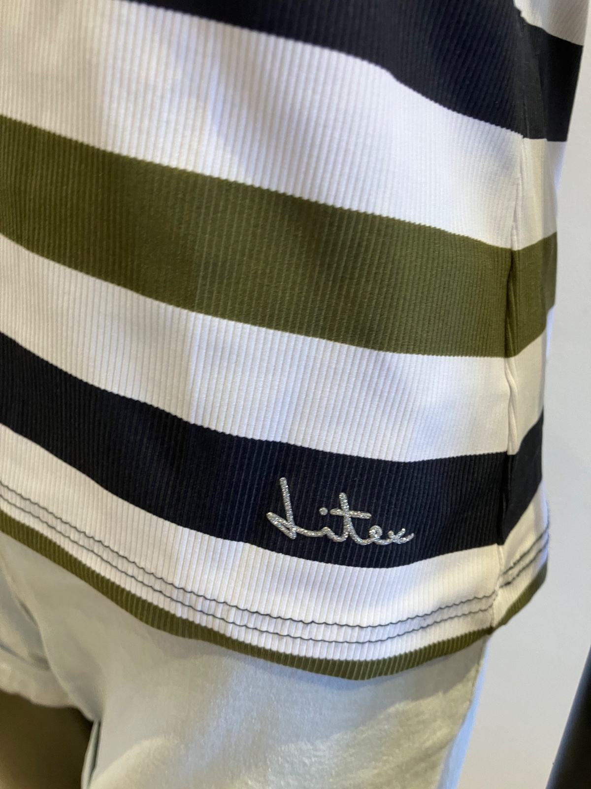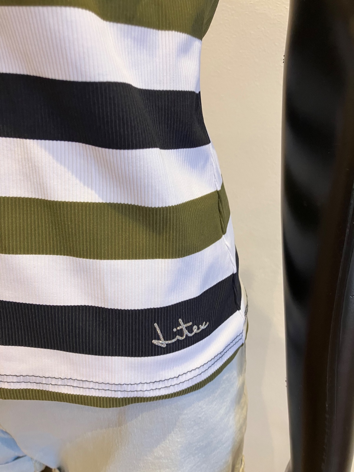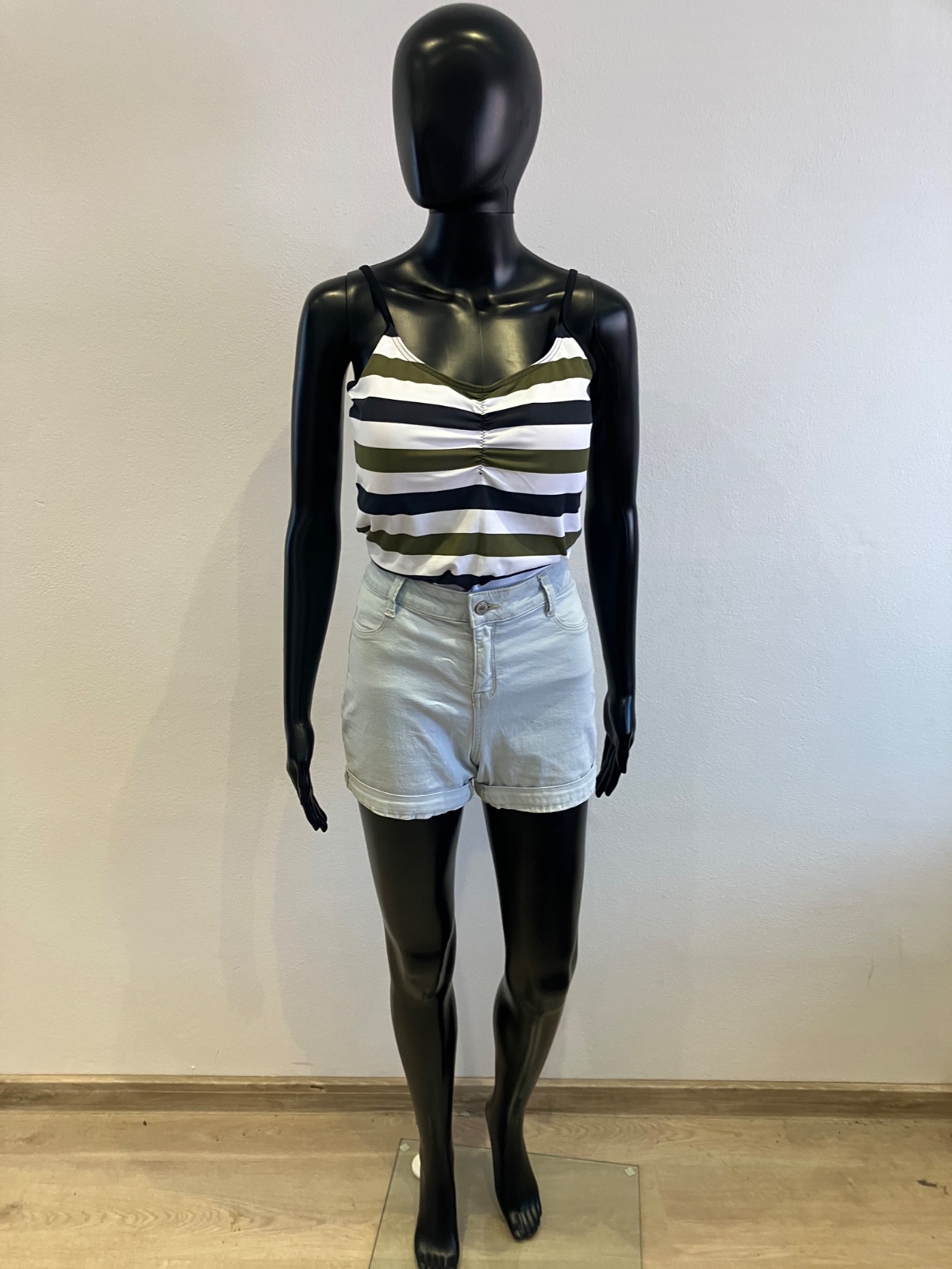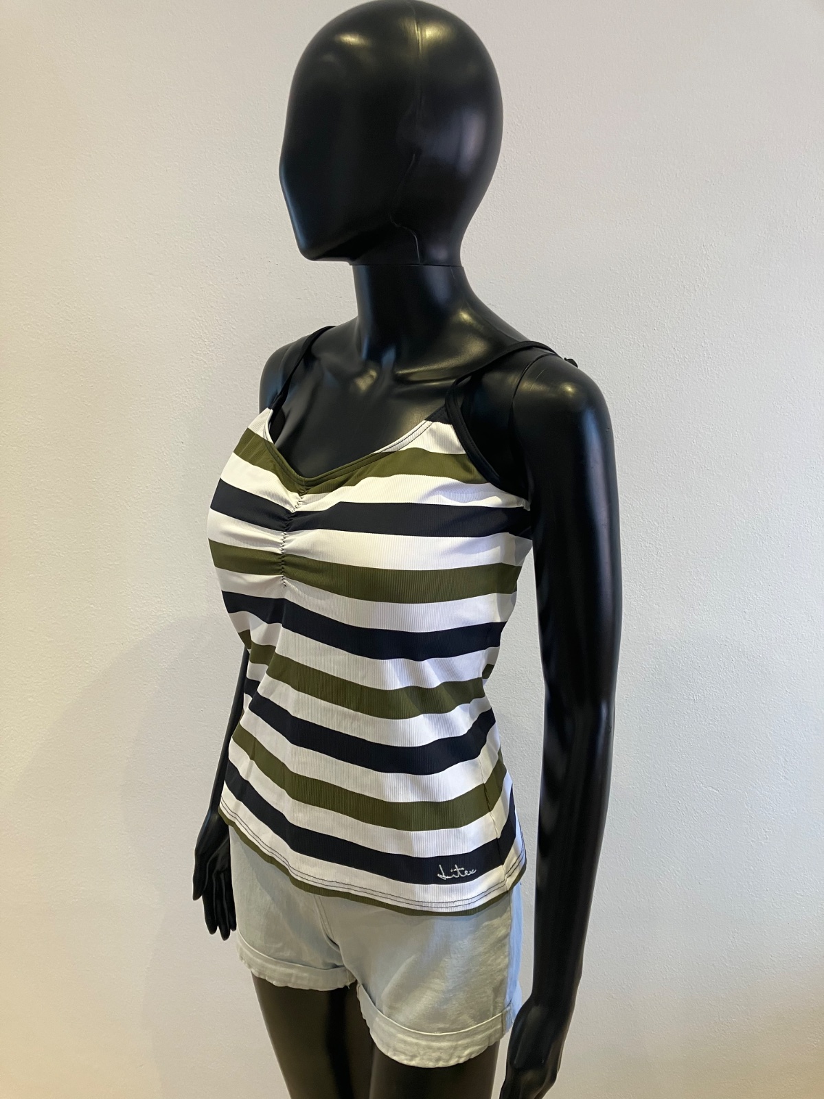 Dámsky top na tenké ramienka, vypchávkami na hrudi, elastický, rebrovaný, nastaviteľné ramienka, farba bielo-čierno-khaki, materiál 85%polyamid 15%elastan.