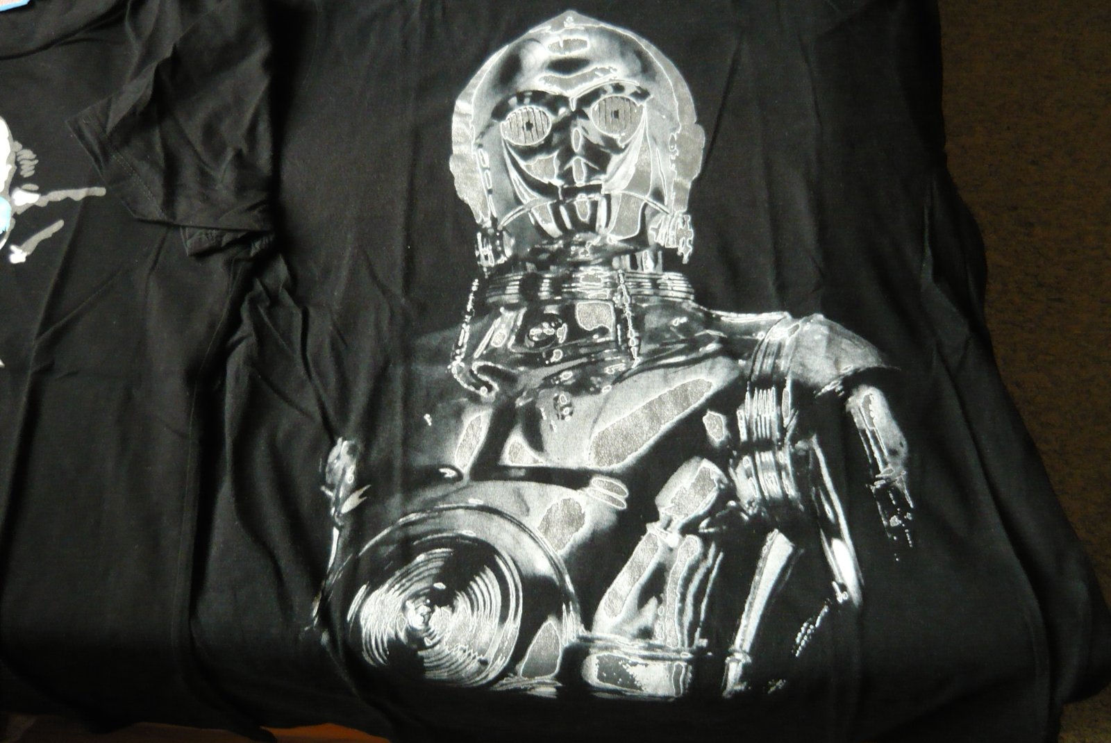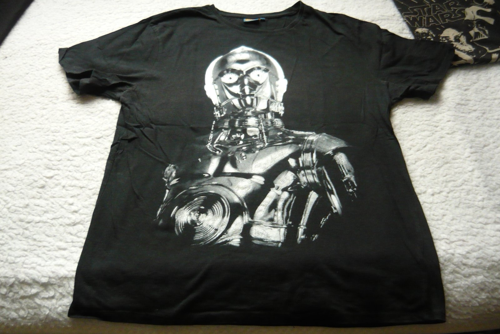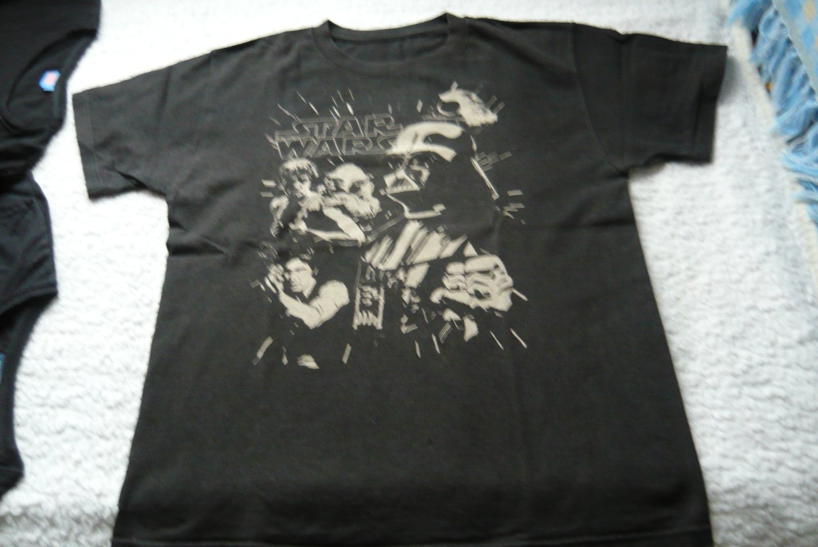 Vpravo : pánske tričko č.XL, zn. Star Wars. 100% bavlna. Cez prsia 55cm. Ako nové. Cena 7 eur.