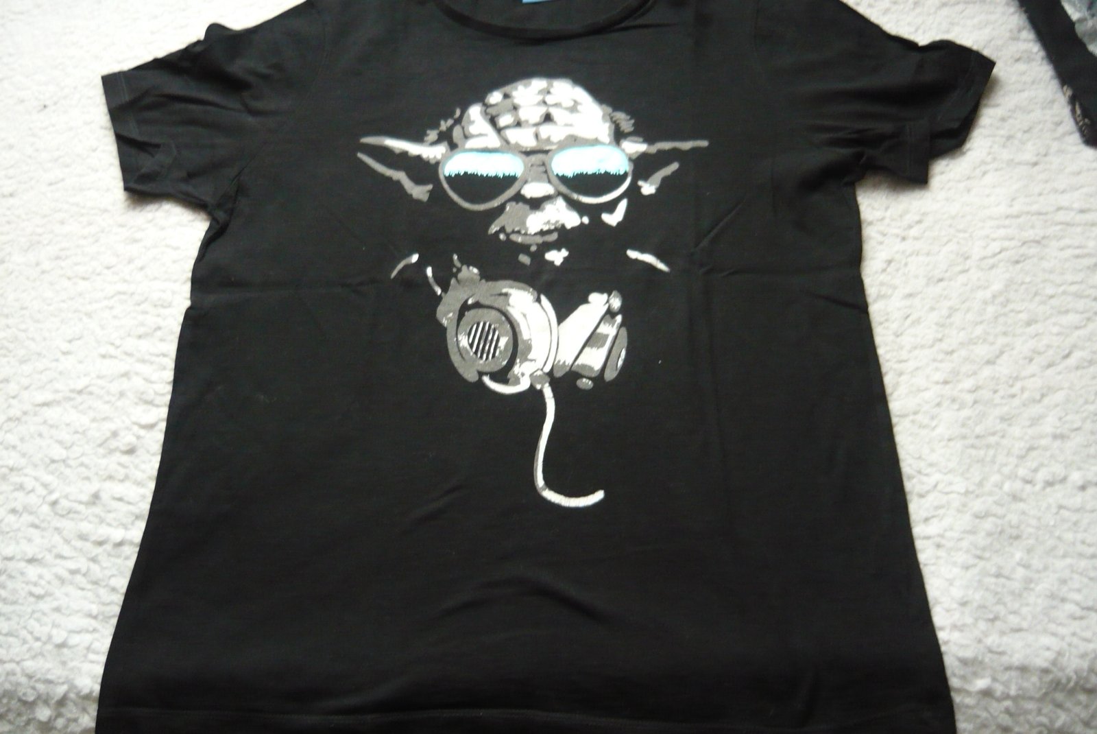zľava dole : pánske tričko č. L, zn.Star Wars, DJ Yoda. Málo nosené, ako nové. 100% bavlna. cez prsia 52 cm.Cena 5 eur.