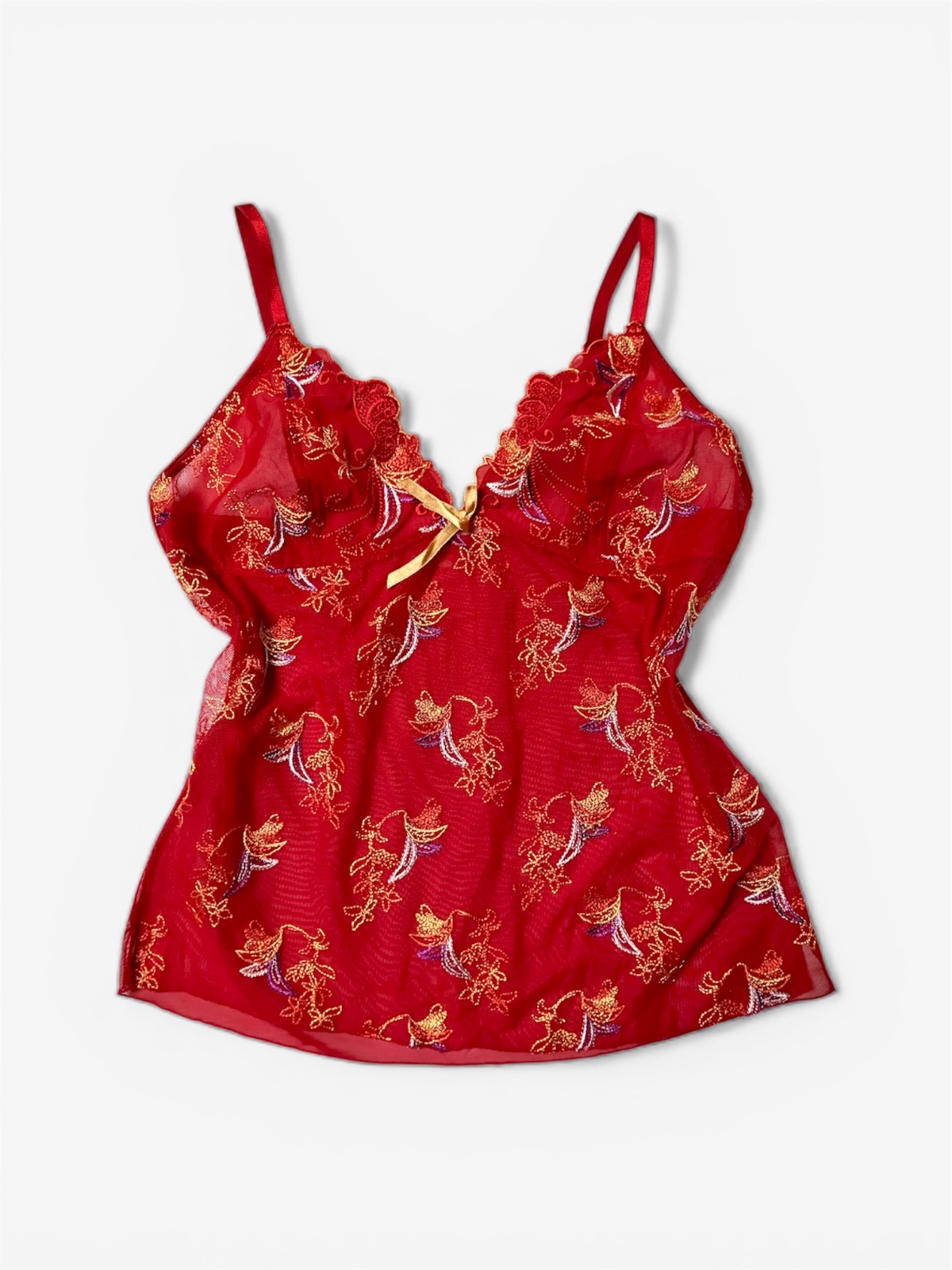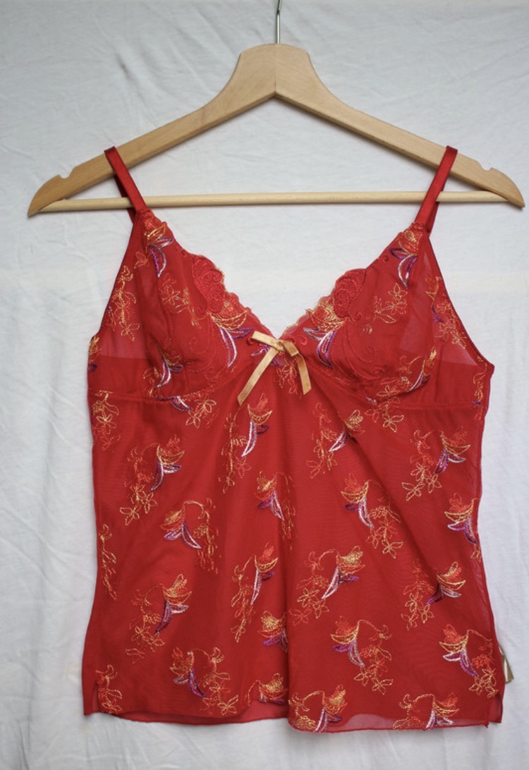 Originálne dámske červené tielko z jemného priehľadného (sheer) materiálu s bohatou zlatou výšivkou a nášivkami v 2000s estetike. Zlaté ornamenty vytvárajú luxusný, mierne exotický vibe – presne ten typ topu, ktorý by si videla na party v early 2000s 💿✨