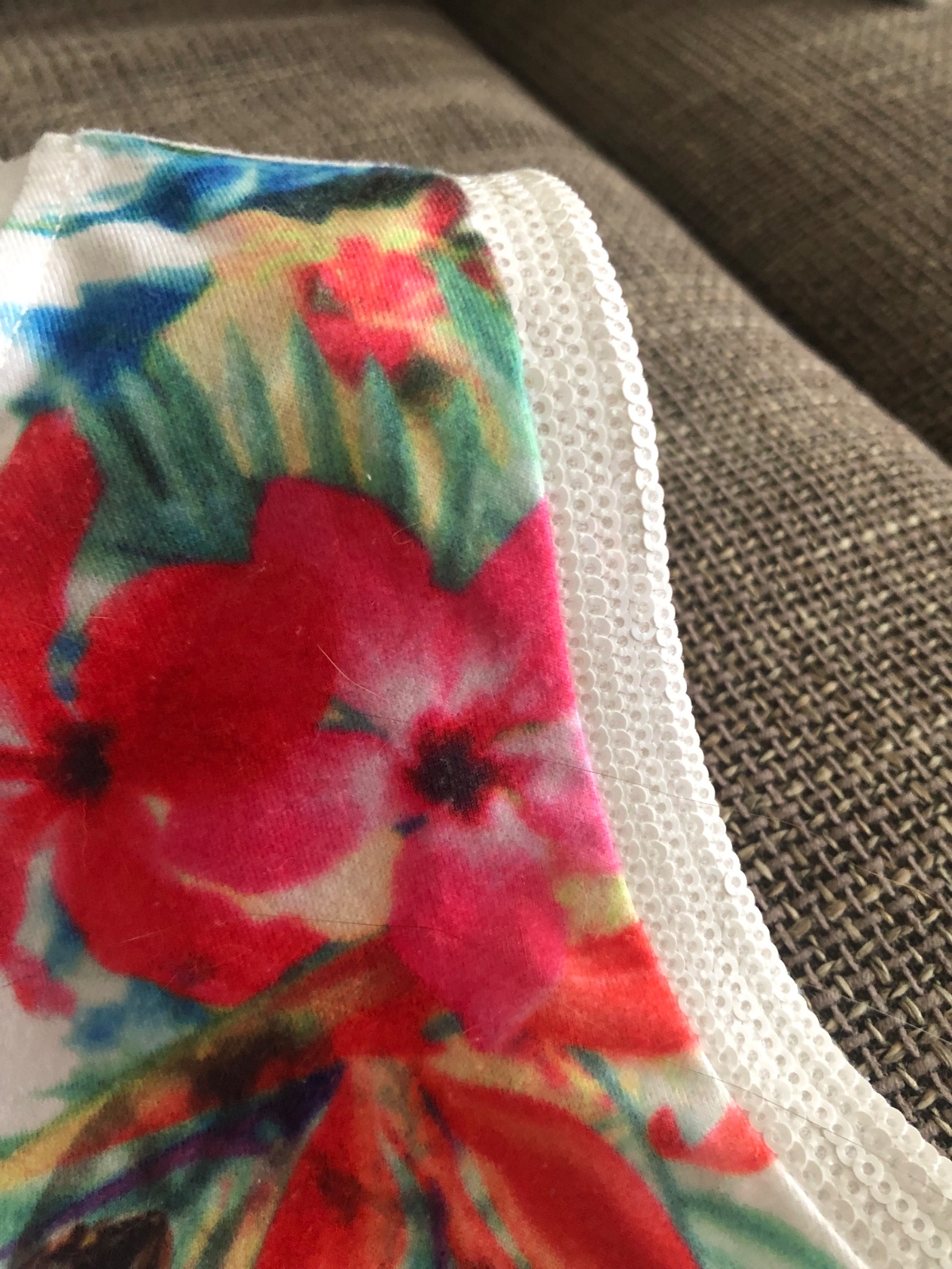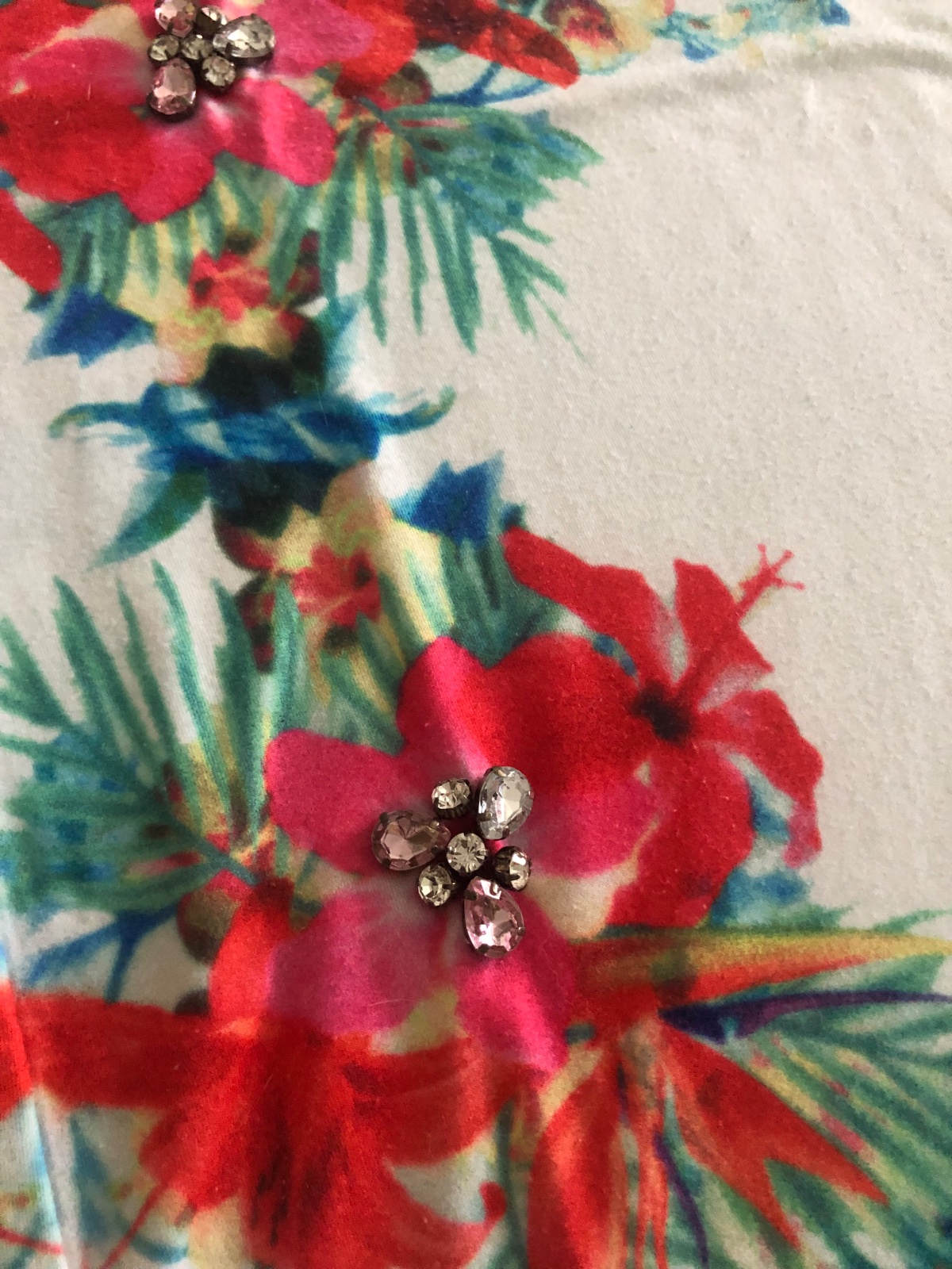 Prekrásne dizajnové tričko, alebo šatočky, biele bavlnené s pestrofarebným motívom kvetov a motýľov. Predné motýle sú aj s kamienkami.