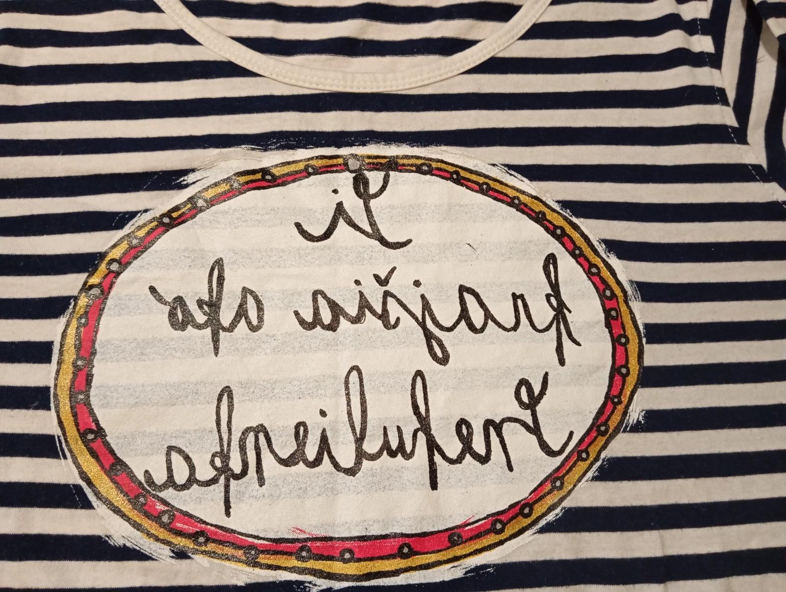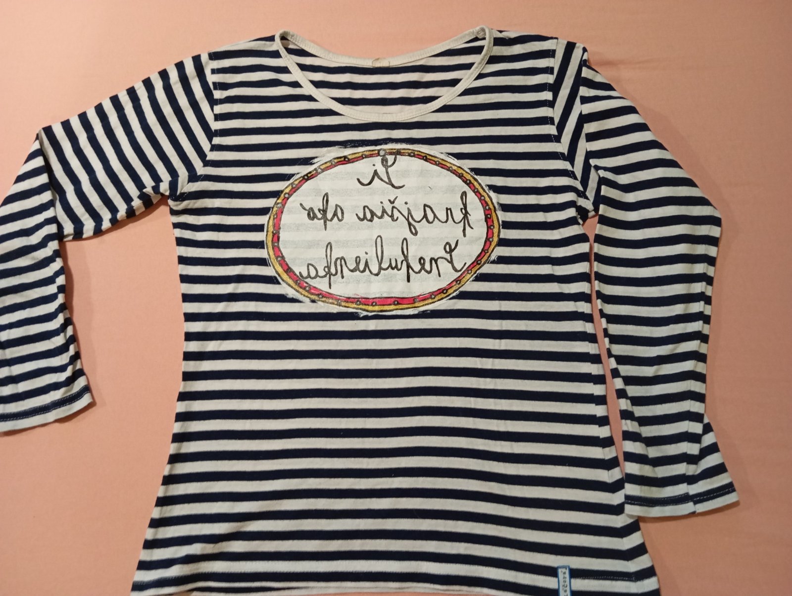 Veľ.S-M, dĺžka od pleca nadol 56cm, šírka cez prsia 2x45cm.Napis -Je krajšia ako snehulienka
