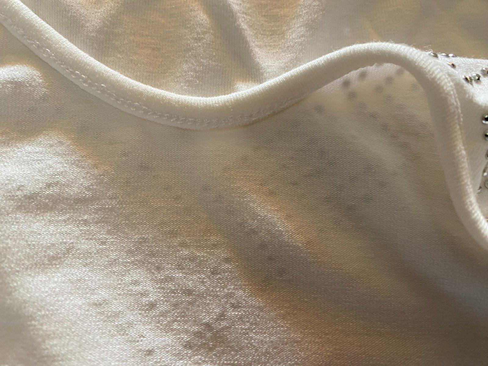 Kvalitné tričko s kamienkami Lau Ra bez udania veľkosti. Kupovali sme ako v. XL), dávam v. L/XL - premerajte, materiál 95% viskóza, 5% lykra - príjemný materiál na nosenie, pekná biela farba so striebornými kamienkami, v top stave. Miery merané v kľude, všade povolí: dĺžka od krku: 61cm, šírka v podpazuší: 50cmx2, je pružné, všade povolí.
