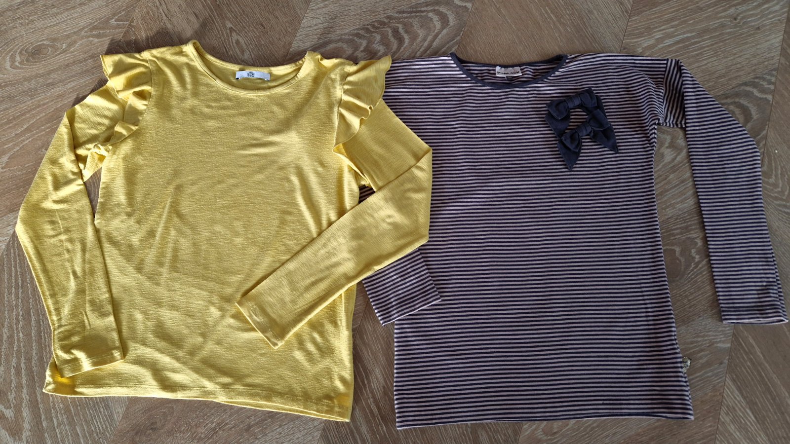 Tričká vo veľmi peknom stave. Veľkosť sedí 134/146. Žlté veľmi jemný tenký úplet. Dĺžka rukáva od pleca 53, vd. rukáva 40, šírka pazuchy 39x2, dĺžka chrbta 53cm. Pásikavé 3/4 rukav. Dĺžka rukáva od krku 57, šírka pazuchy 43x2, dĺžka chrbta 54cm. K cene plus poštovné podľa taríf SP.