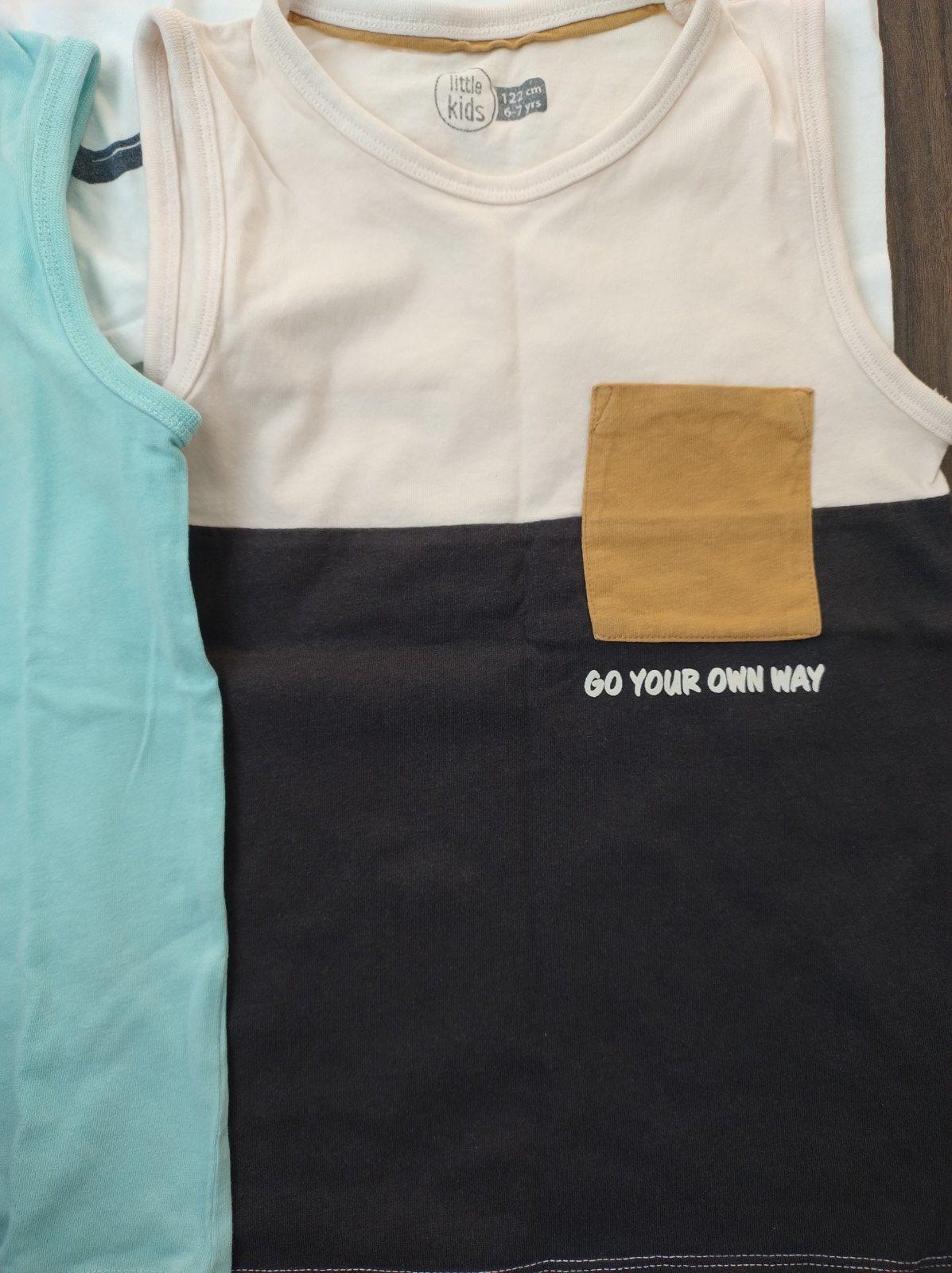4 ks letných tielok pre chlapca. Tmavomodré je H&M, veľkosť 110/116, ostatné Pepco v. 122. Dĺžka je rovnaká u vsetkých. Nosené, bez poškodení. Cena je uvedená spolu, samostane 2 € za kus.