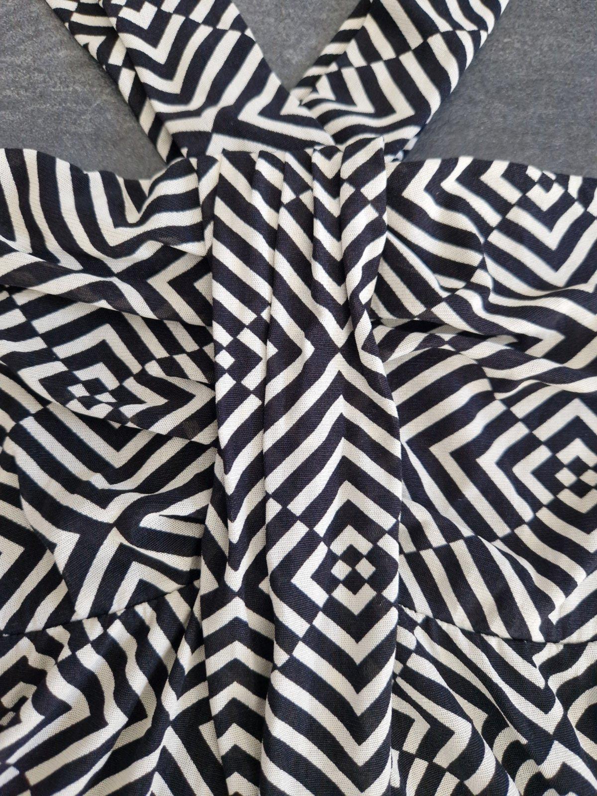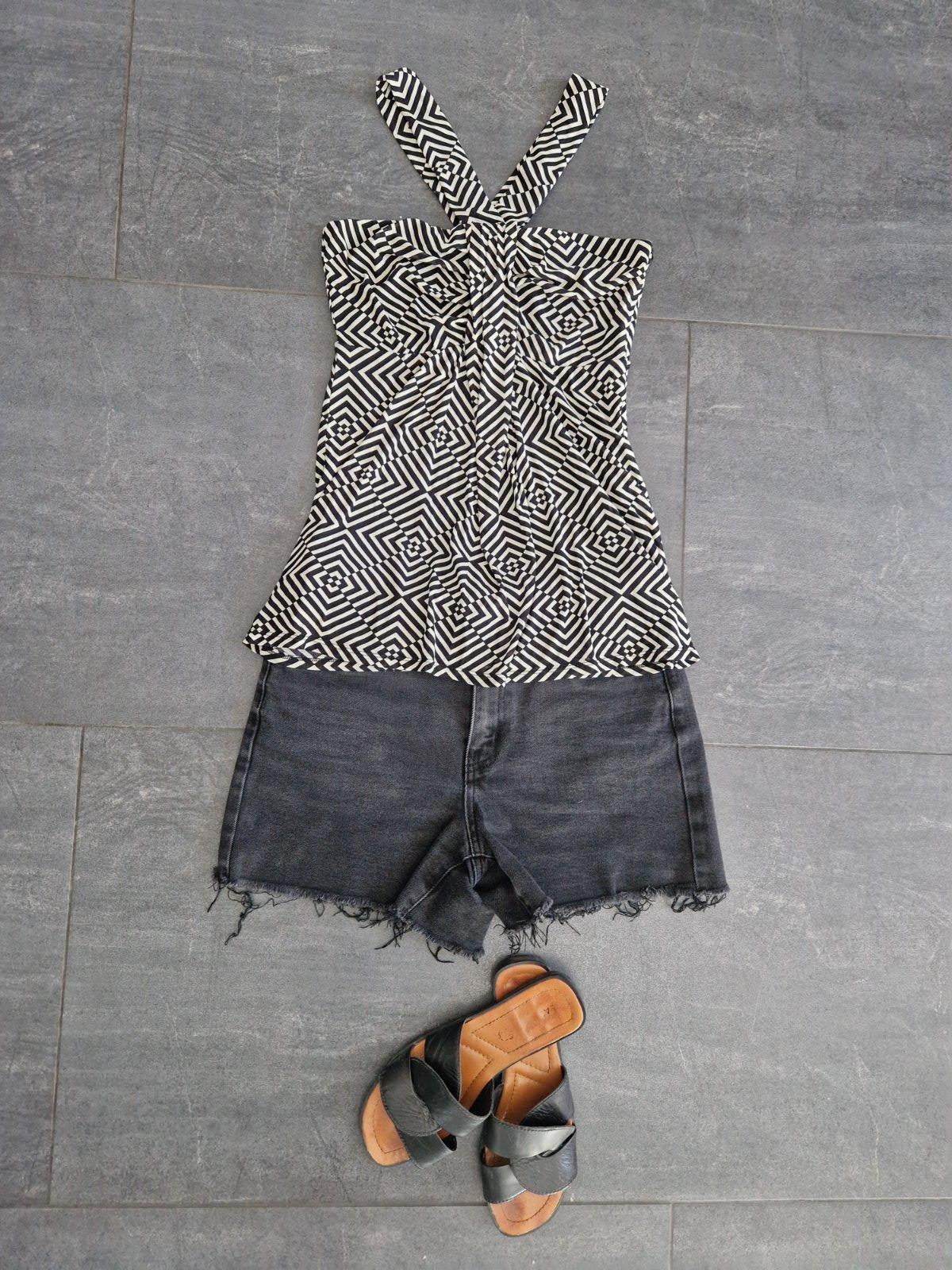 Výborný nosený stav. Zaujímavo riešený vo vrchnej časti. Na boku zips. Na tej vrchnej hrudnej časi zvnútra gumka. Šírka tej vrchnej časti 36, dĺžka na foto 46