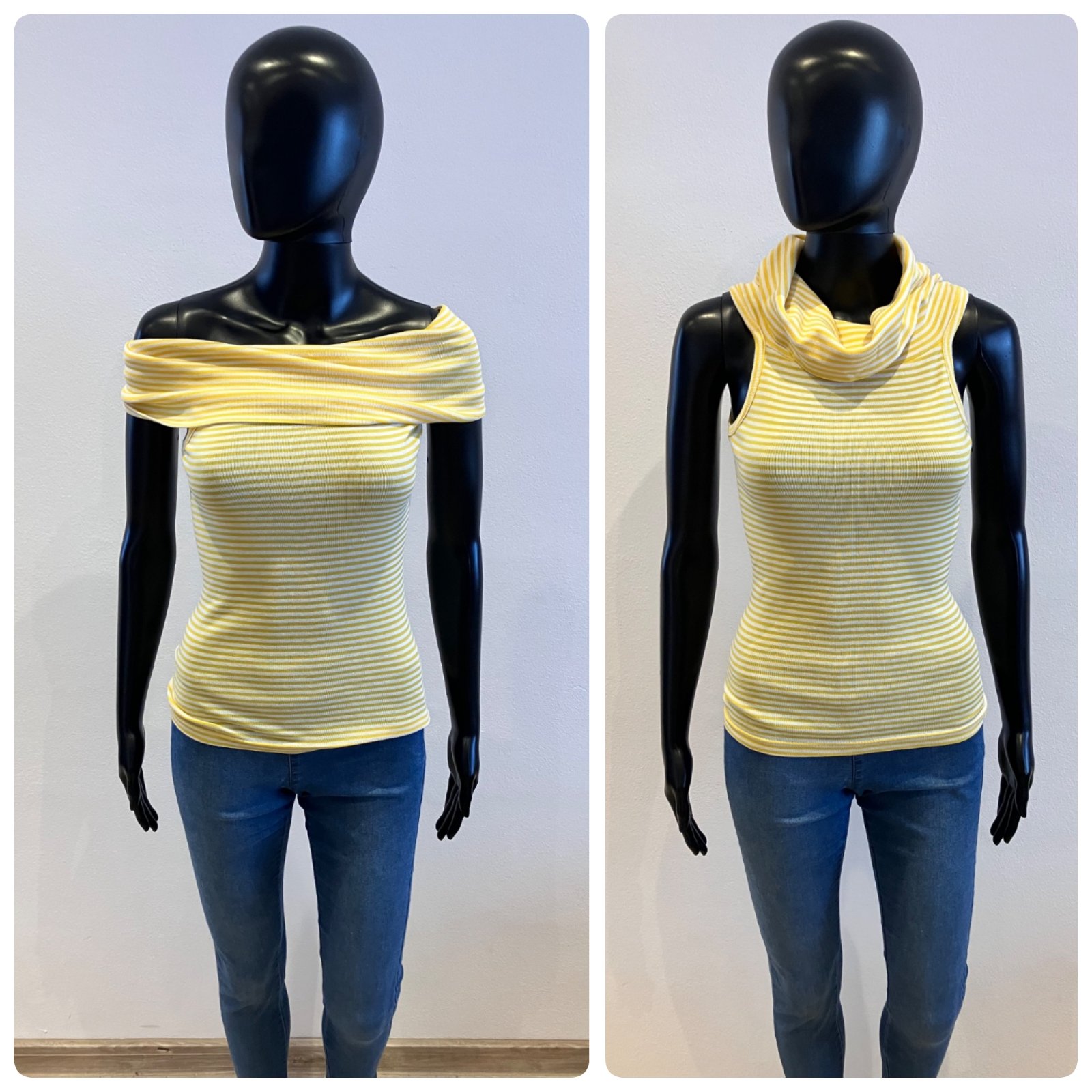 Pruhované tričko bez rukávov s rolákom, elastické, materiál 55% bavlna,35%viskoza,10%polyamid.