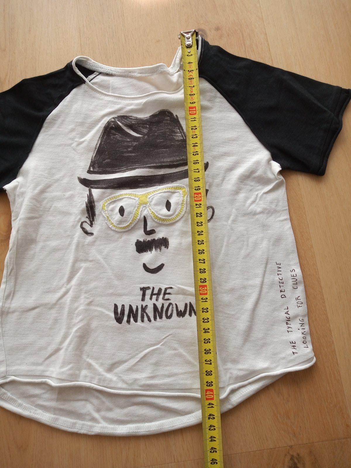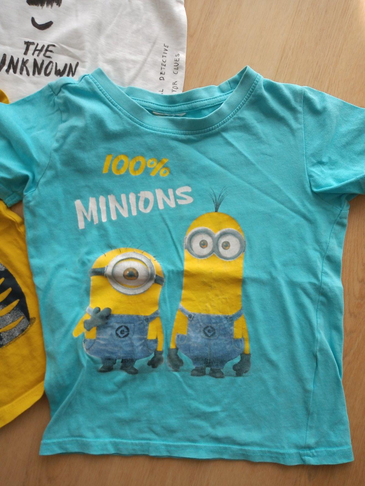 Tričko mimoni nosené najviac. Mimoni popraskaná aplikácia vzadu fliačik (viď foto), neskúšala som vyprať. Pásikavé a žlté top stav. Zara detektív úplne tenučké ľahké, má 3 fliačiky. Cena za všetky spolu 2,50€.