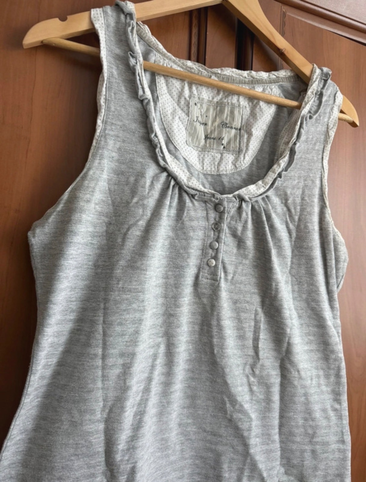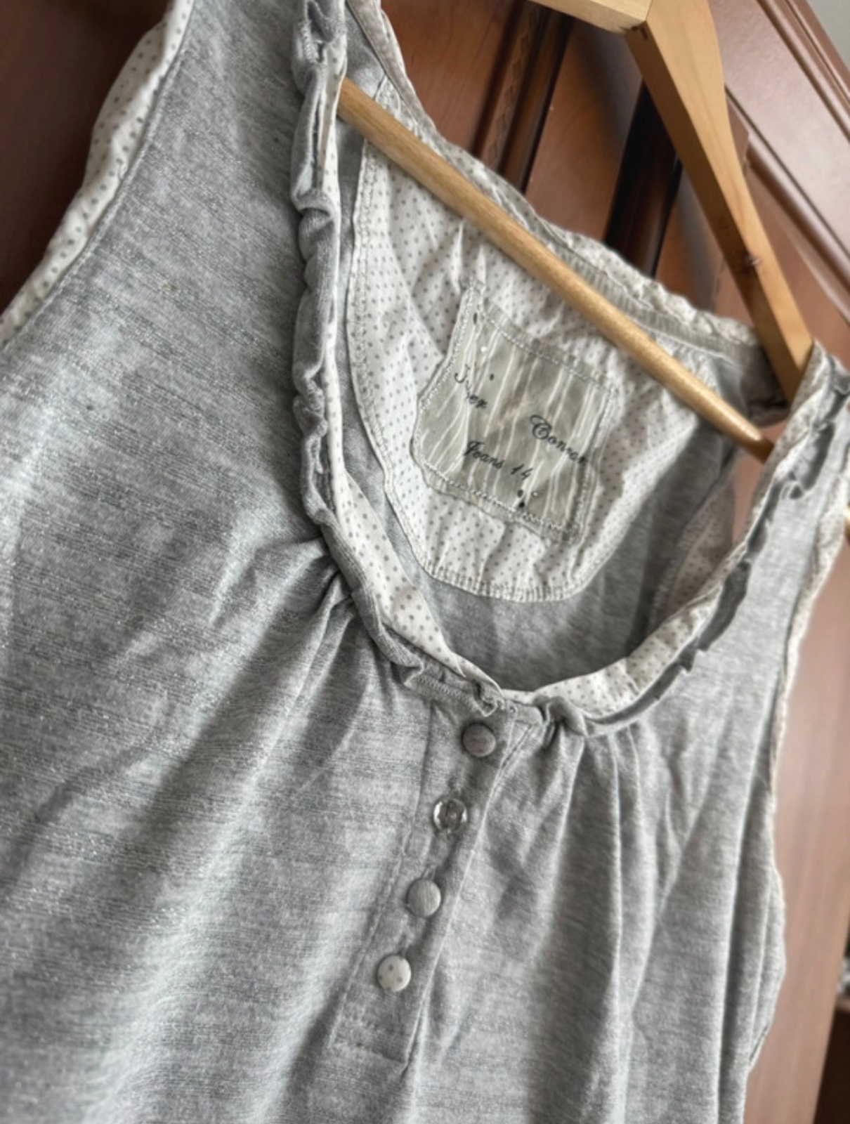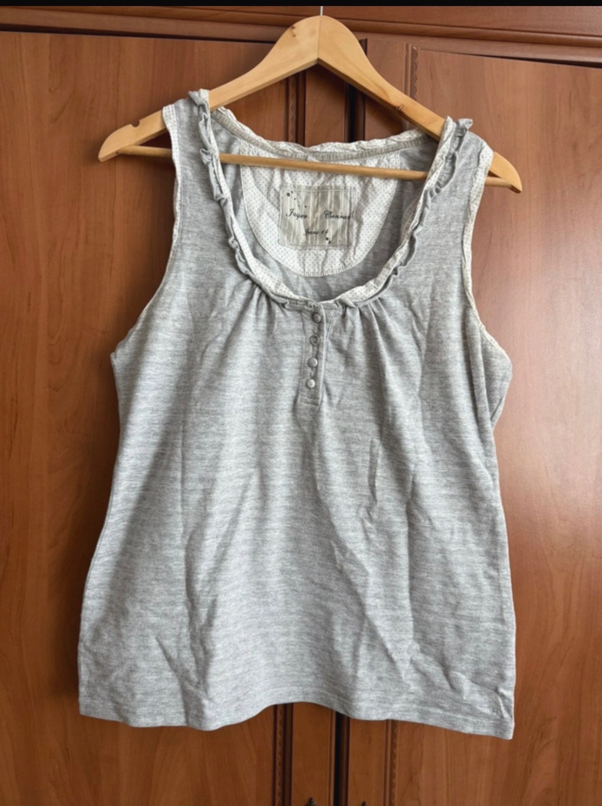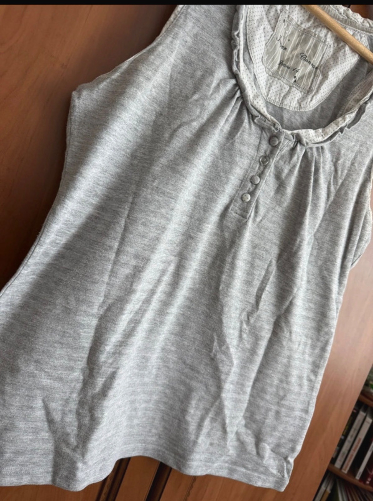 Toto sivé tielko má jednoduchý, ale elegantný dizajn.☀️Je vyrobené z ľahkého materiálu a je v príjemnom nosenom stave.🤩