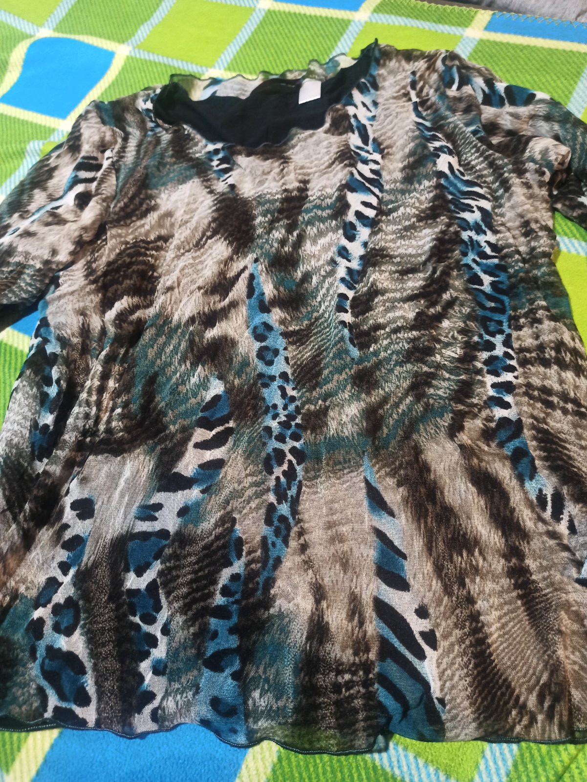 Nosené menej, triko tenké akoby položenie a na Tom take tenšie tričko s leopardie vzorom v modrom, skôr na zimu a jeseň, dĺžka 66cm, cez prsia 58/59 CM*2, 97 percent viskóza, práce a veľmi príjemné na tele