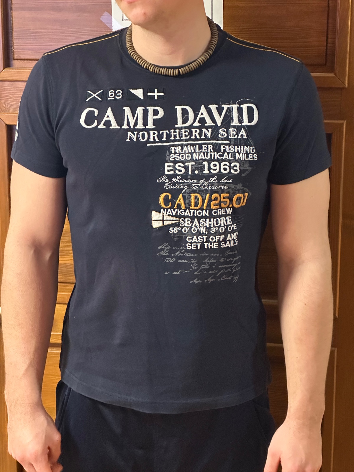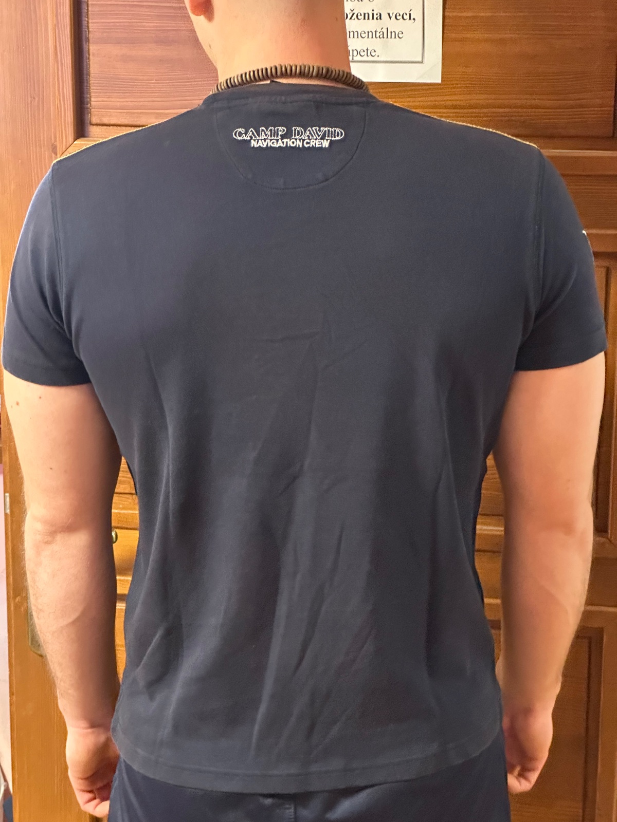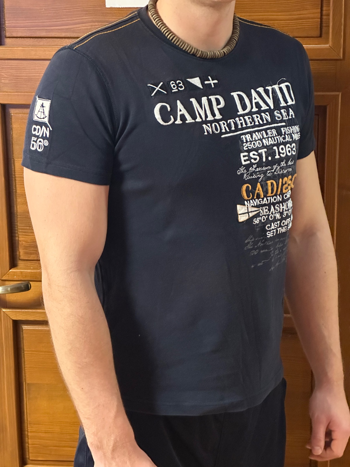 Na rukáve sa nachádza menšia aplikácia. Na zadnej strane pri krku je menší vyšívaný nápis Camp David Navigation Crew.