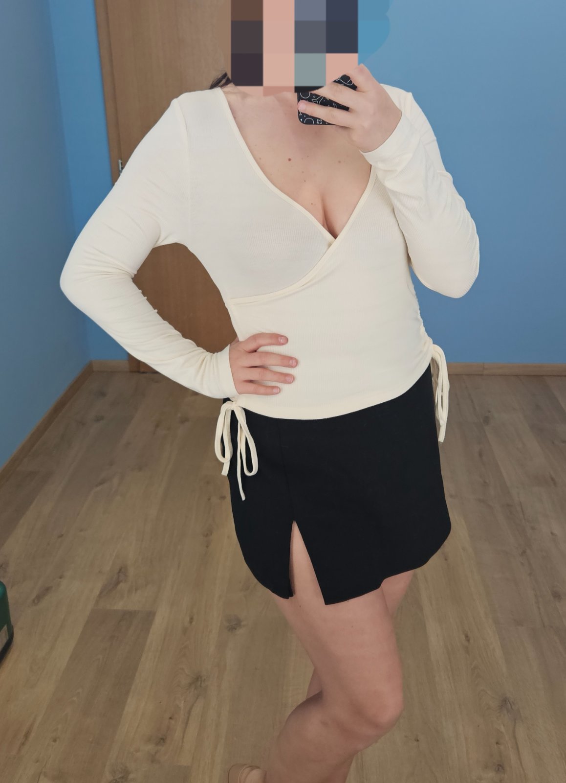 Nove elasticke tricko s vystrihom do V smotanovej - kremovej farby. Sadne na S-M. Dlzka cca 45 cm, rukav 62 cm. Dlzka sa da prisposobit vdaka snurkam naboku.