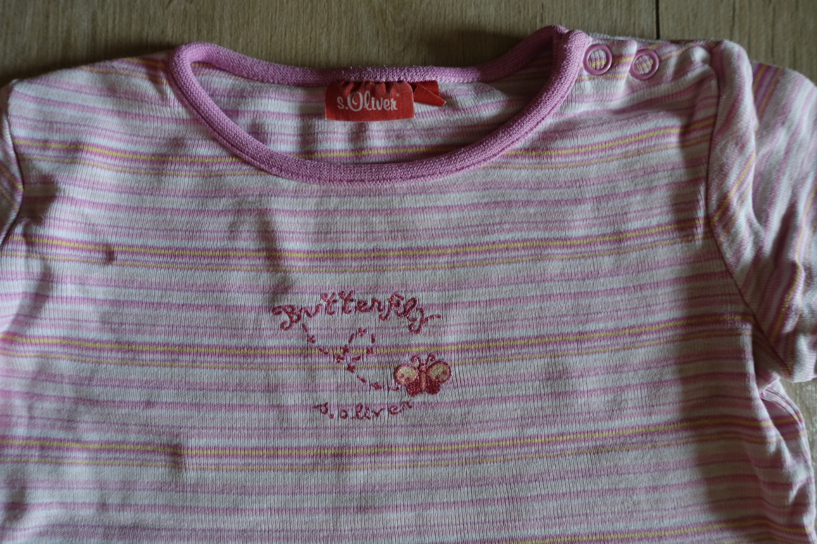 Predám krásne bavlnené tričenko s trblietajúcim sa motýlikom. V skutočnosti je krajšie ako na foto. Bolo nosené, ale je v peknom nosenom stave. Nemá fľaky, ani diery, ani žmolky, či iné poškodenia. Trolinka akoby sa chcel začať robiť pri naklonení chĺpoček z prania, ale nie je žmolkavé. Je mäkučké a príjemné na nosenie. Na pliecku sa rozopína pukačkami na ľahšie prevlečenie hlavičky. Krásne. Celková dĺžka je 31 cm. (G)