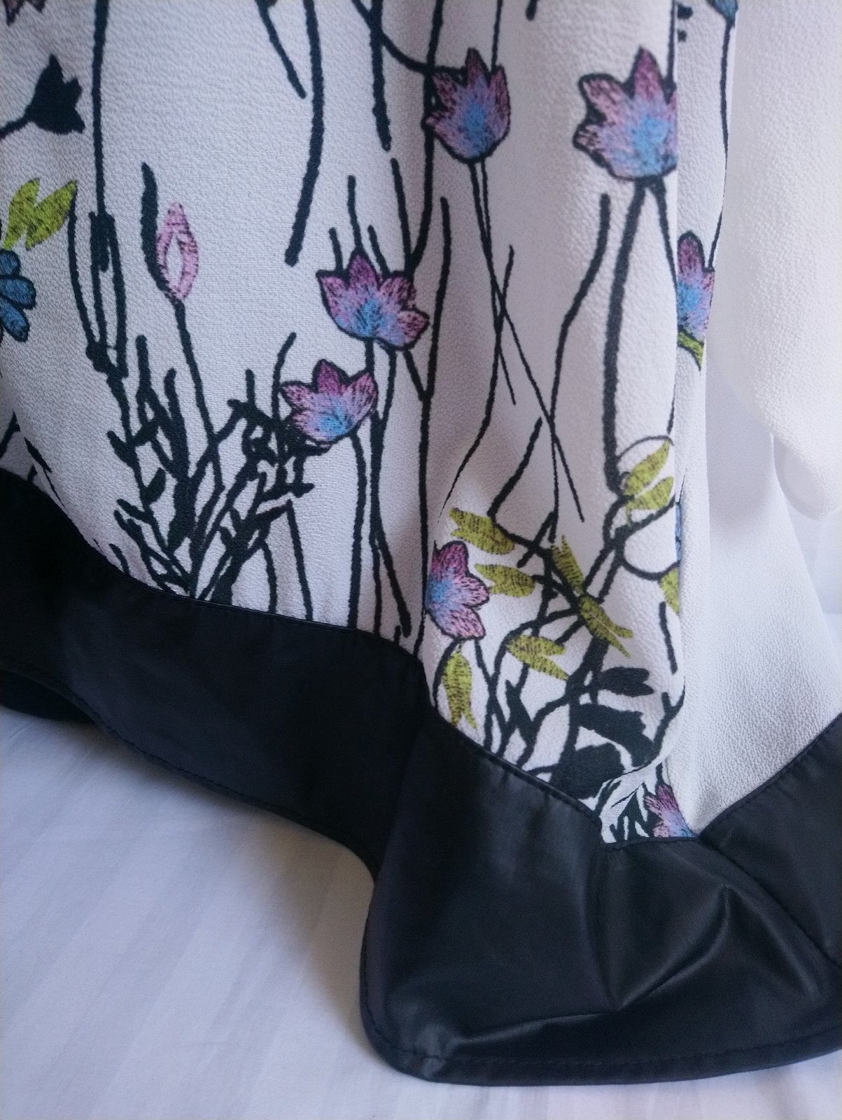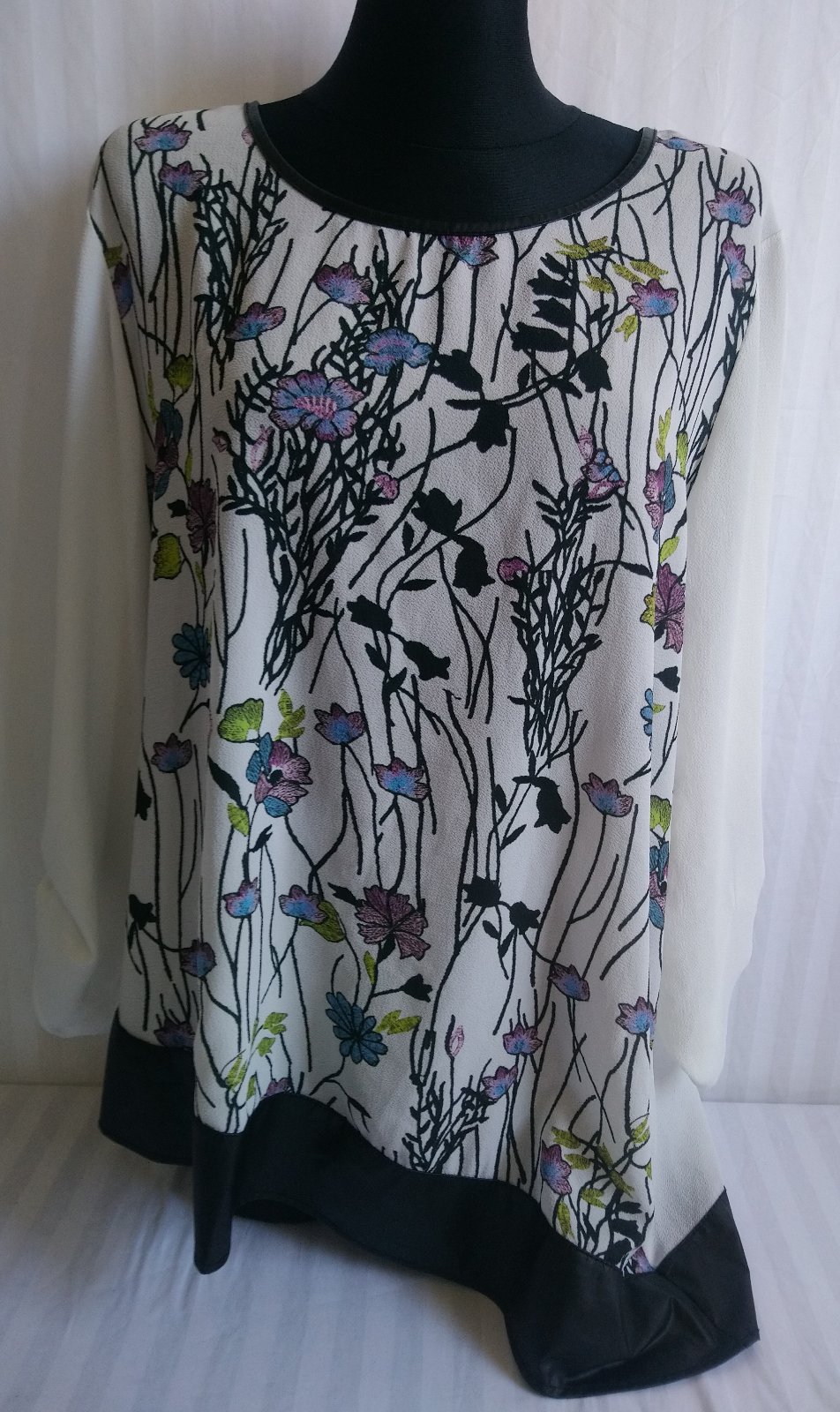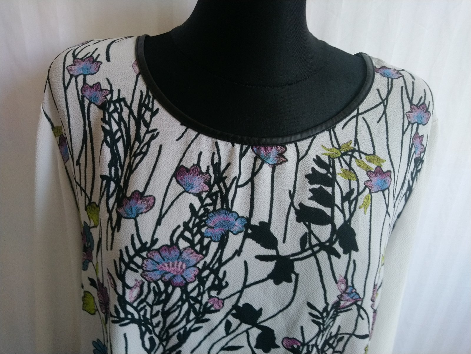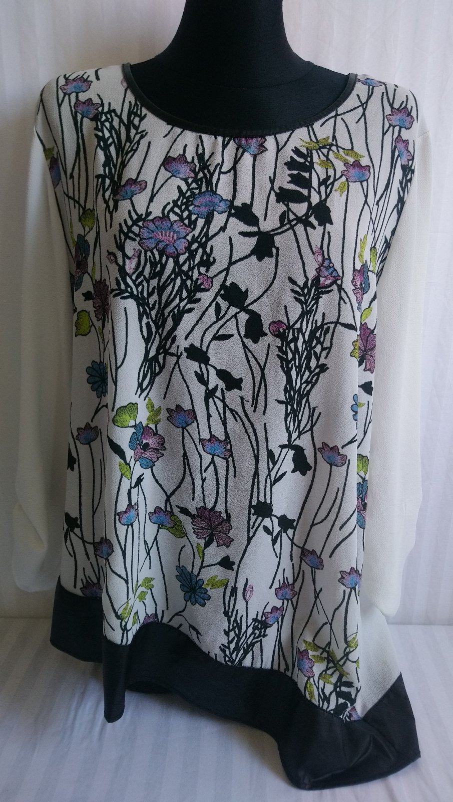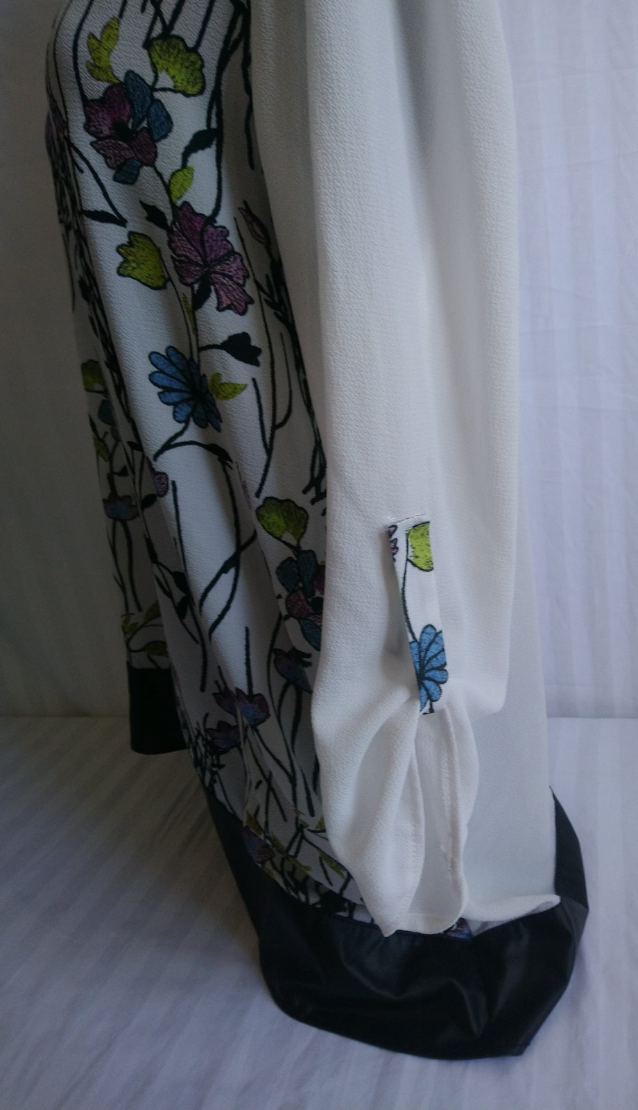dámsky top s farebným vzorom, čierne lemovani, asymetrická dĺžka, 3/4 rukáv,