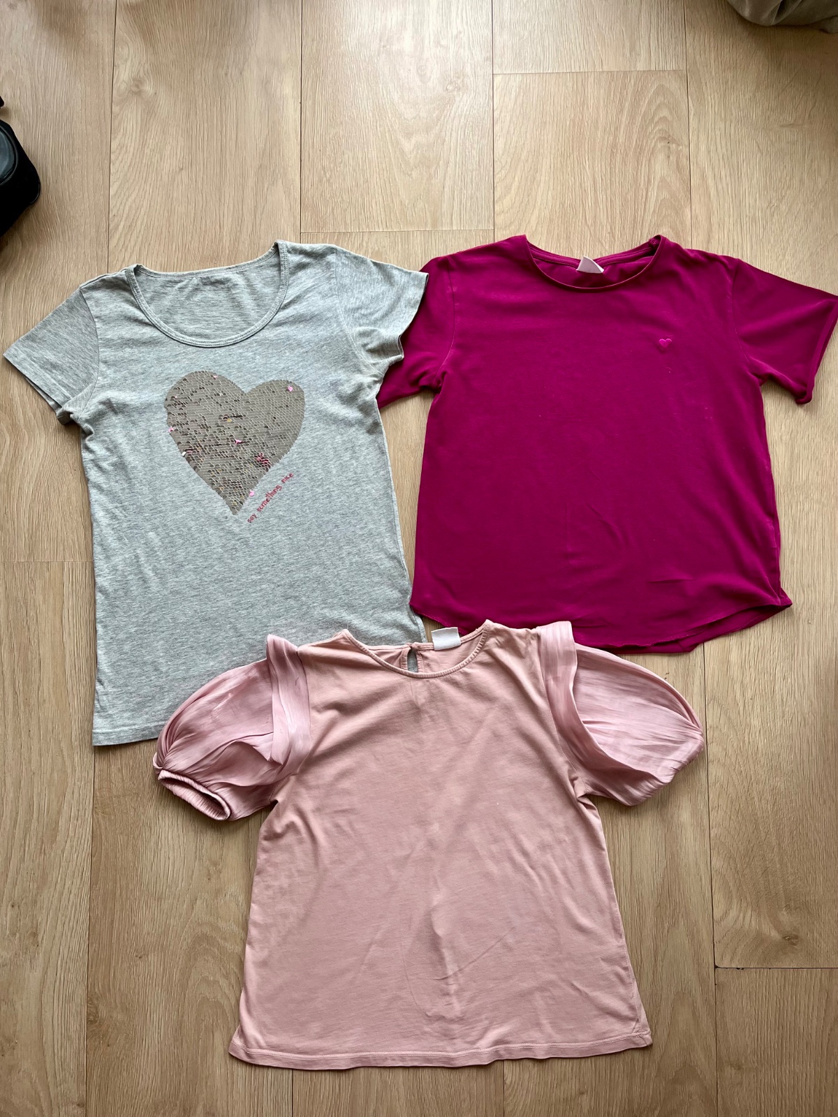 Svetlosiva so srdcom designual, flitrove srdce sa premiena na strieborne alebo ruzove.( vid foto). dalsie dve Zara prikladam zdarma, lebo maju nejake nenapadne chybicky. Sedia na Velkost 146-152