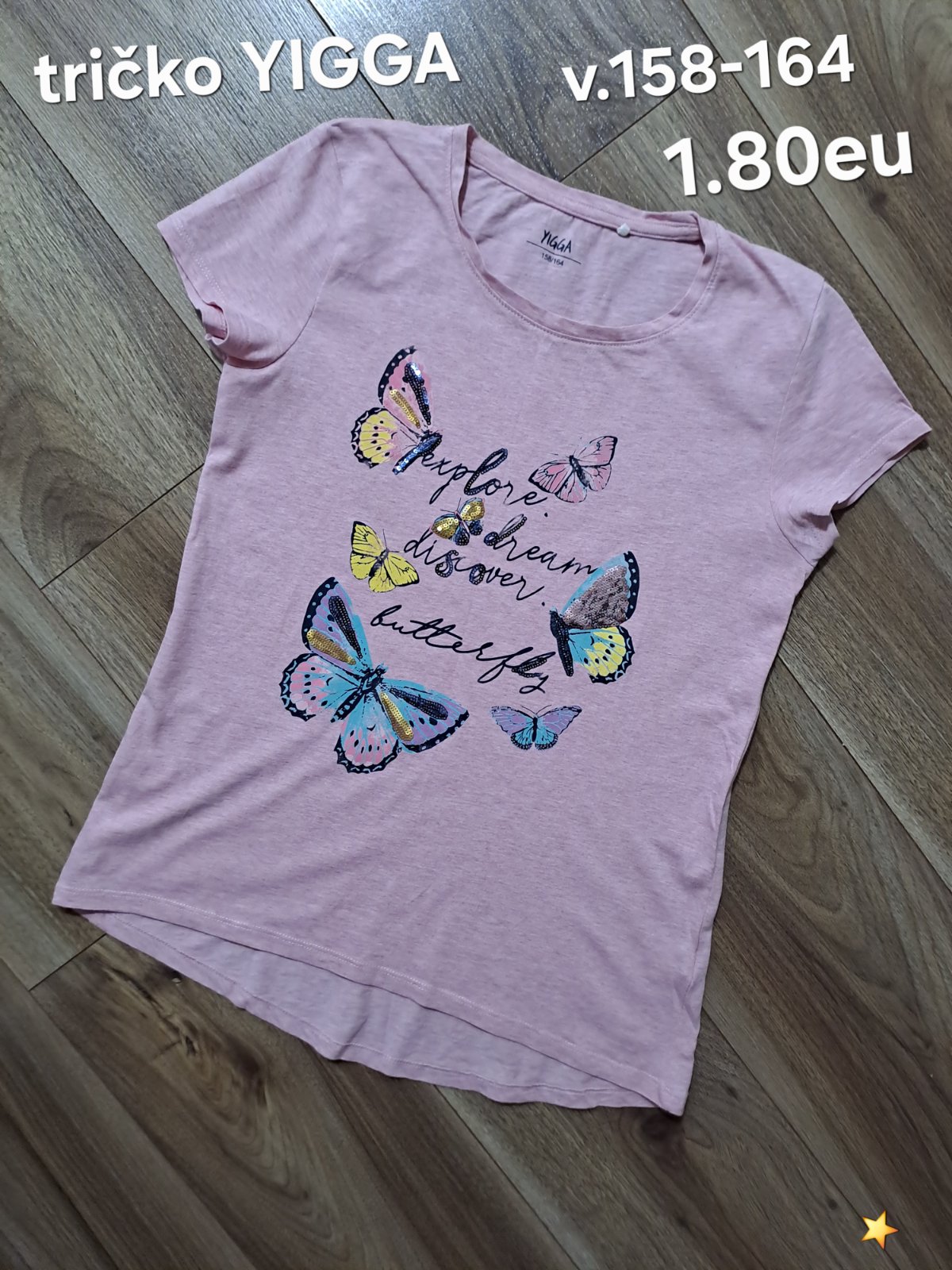 Predám dievčenské tričko veľkosť 158/164 s čipkou na spodnom leme hrudník 2 x 43 cm pás 2 x 41 cm boky 2 x 44 cm dĺžka 57 cm rukáv od krku 65 cm