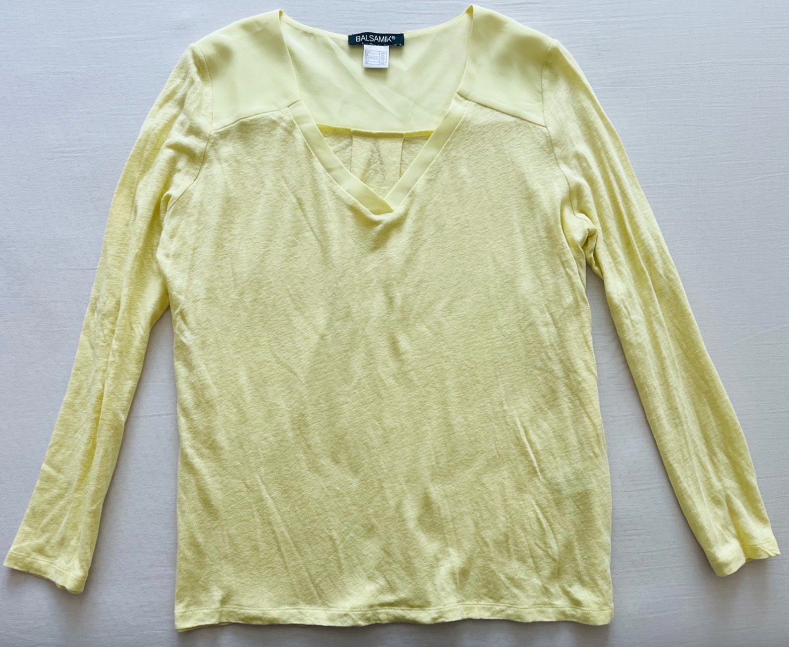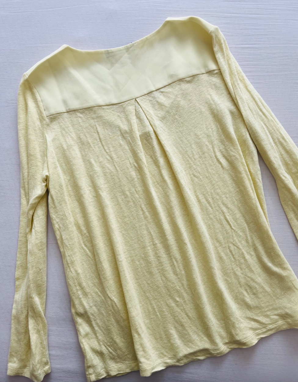 139a. zlte tricko, velk. S/M, 60% bavlna, 35% polyester, 5% elastan, dlzka 56cm, rukav 58cm, cez prsia 40x2cm