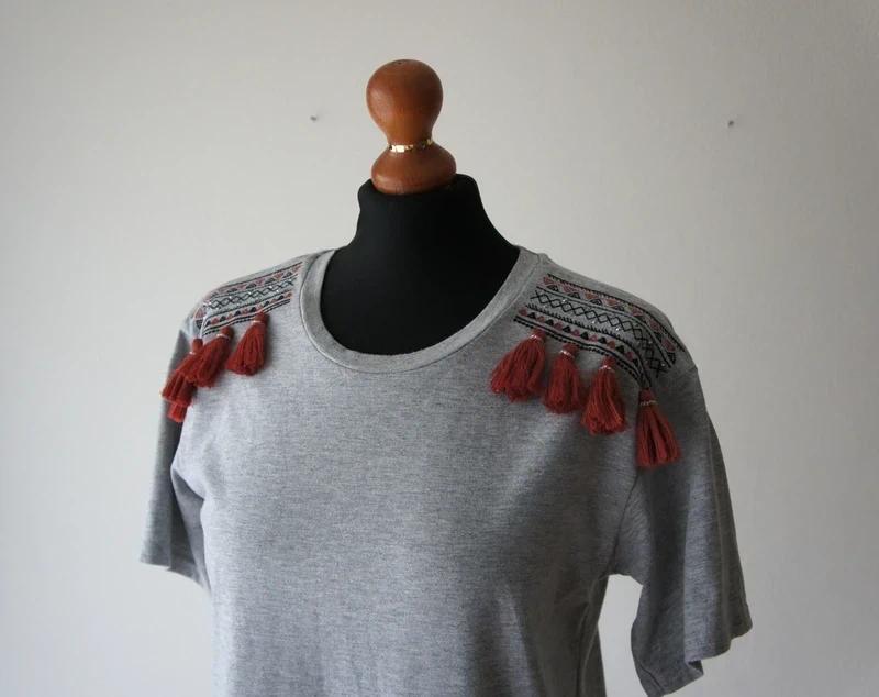 Predám trendové dámske tričko v melírovanej sivej farbe so zaujímavým „spraným“ efektom. Tričko je výnimočné vďaka detailnej kvetinovej aplikácii/výšivke na oboch ramenách, ktorá mu dodáva originálny a romantický vzhľad.