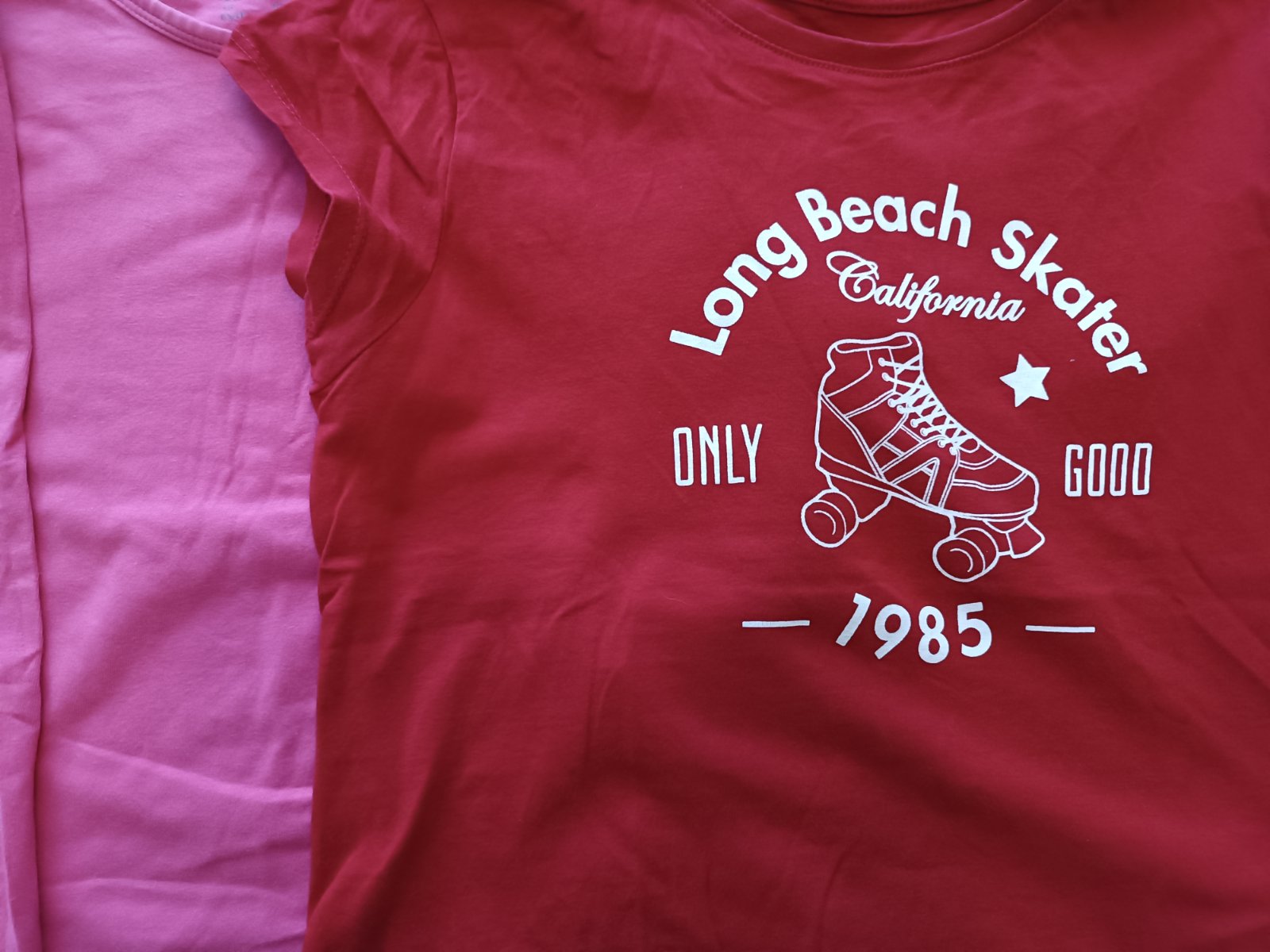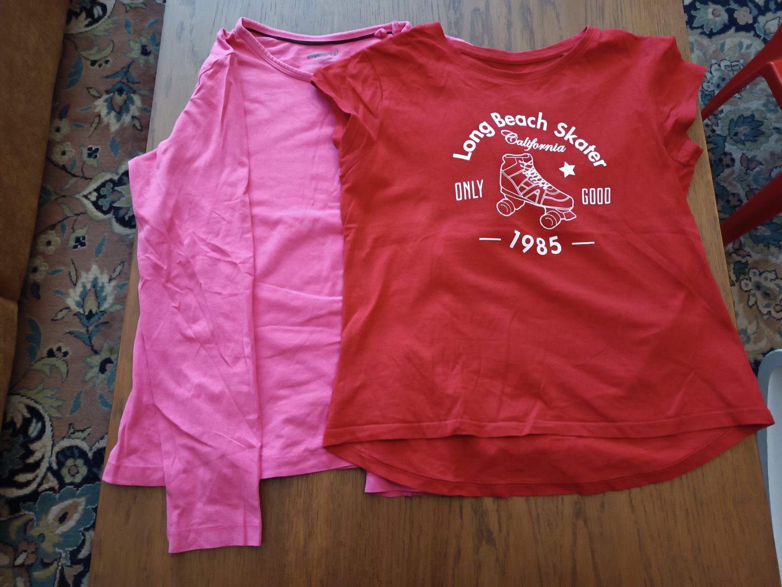 Ponúkam na striedačku nosené tričká. Ružové s dlhým rukávom a červené s krátkym rukávom. Bežný nosený stav, na ružovom minimálny chĺpok z prania.