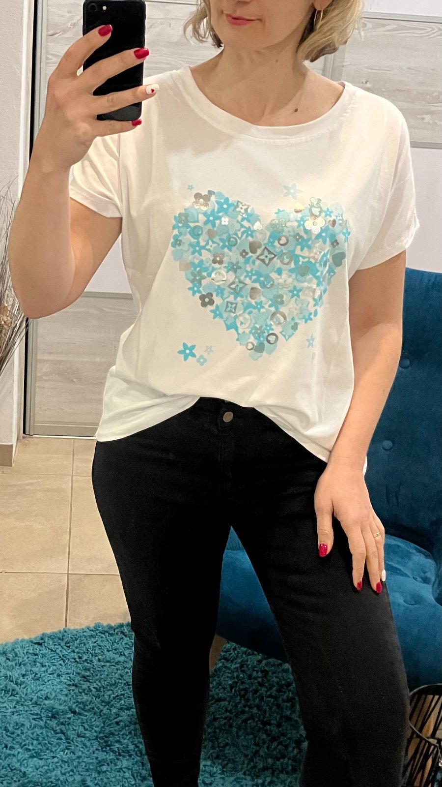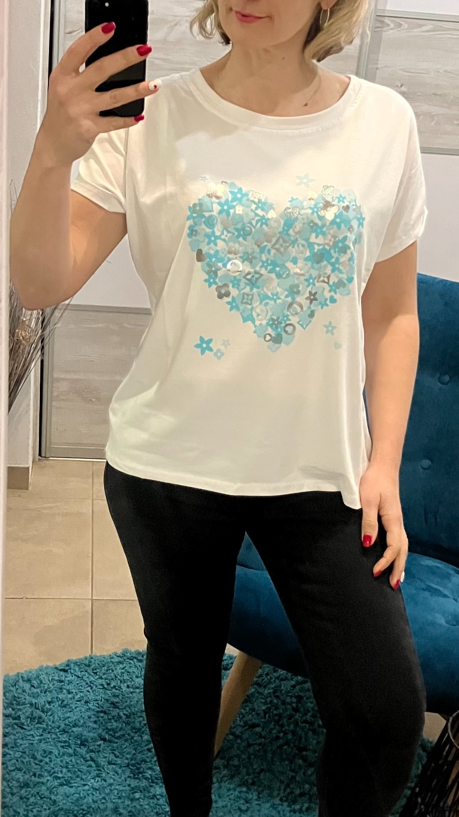 Pohodlné dámske tričko s krátkym rukávom a modro-striebornou potlačou. Elastické. Materiál:95%bavlna,5%elastan. Veľkosť UNI (vhodná pre S,M,L,XL). Krajina pôvodu: Taliansko.