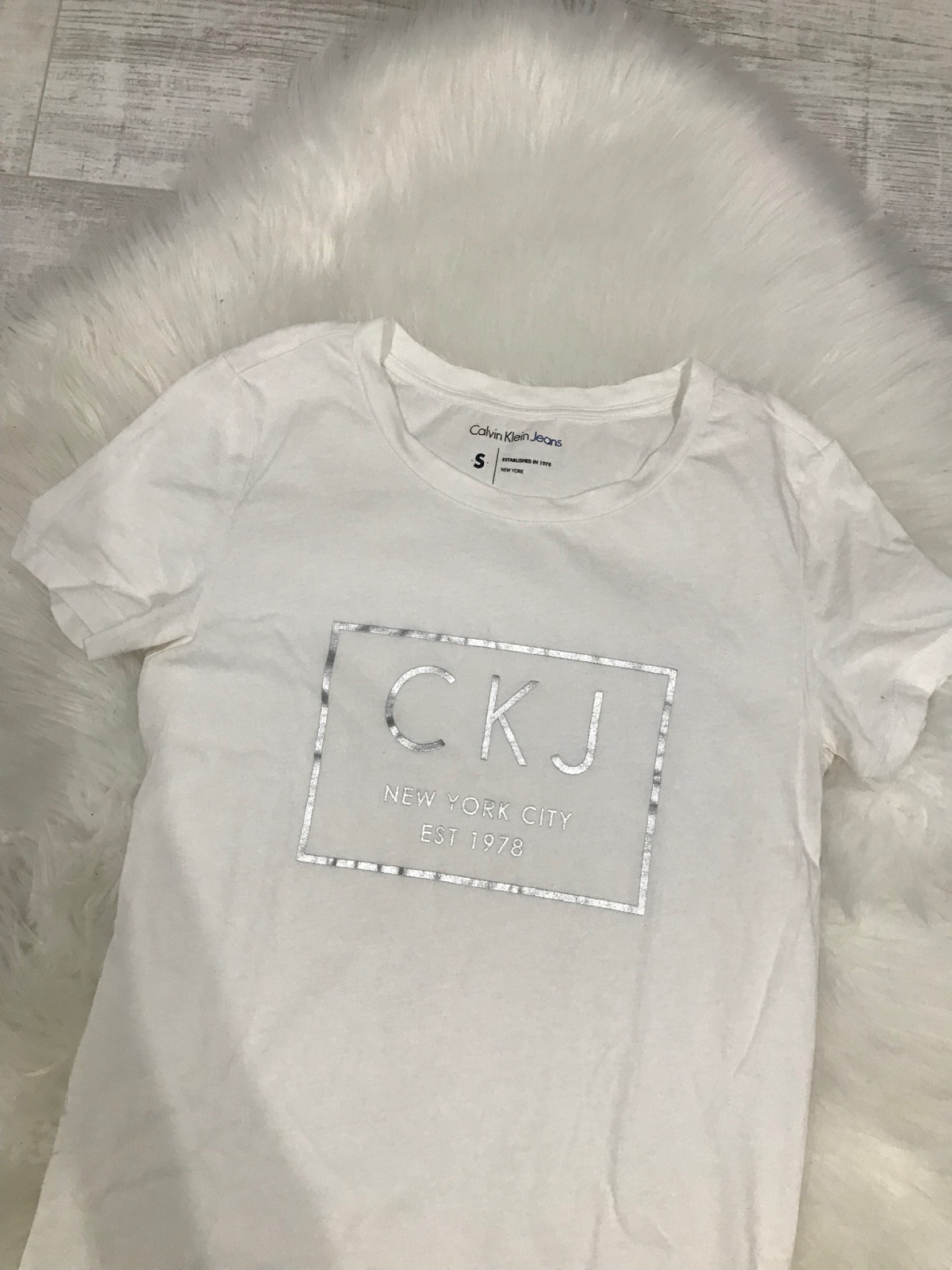 Predám krásne biele tričko calvin klein jeans so strieborným nápisom , 2 krát oblečené , pc bola 35 e predám ho za 12 e