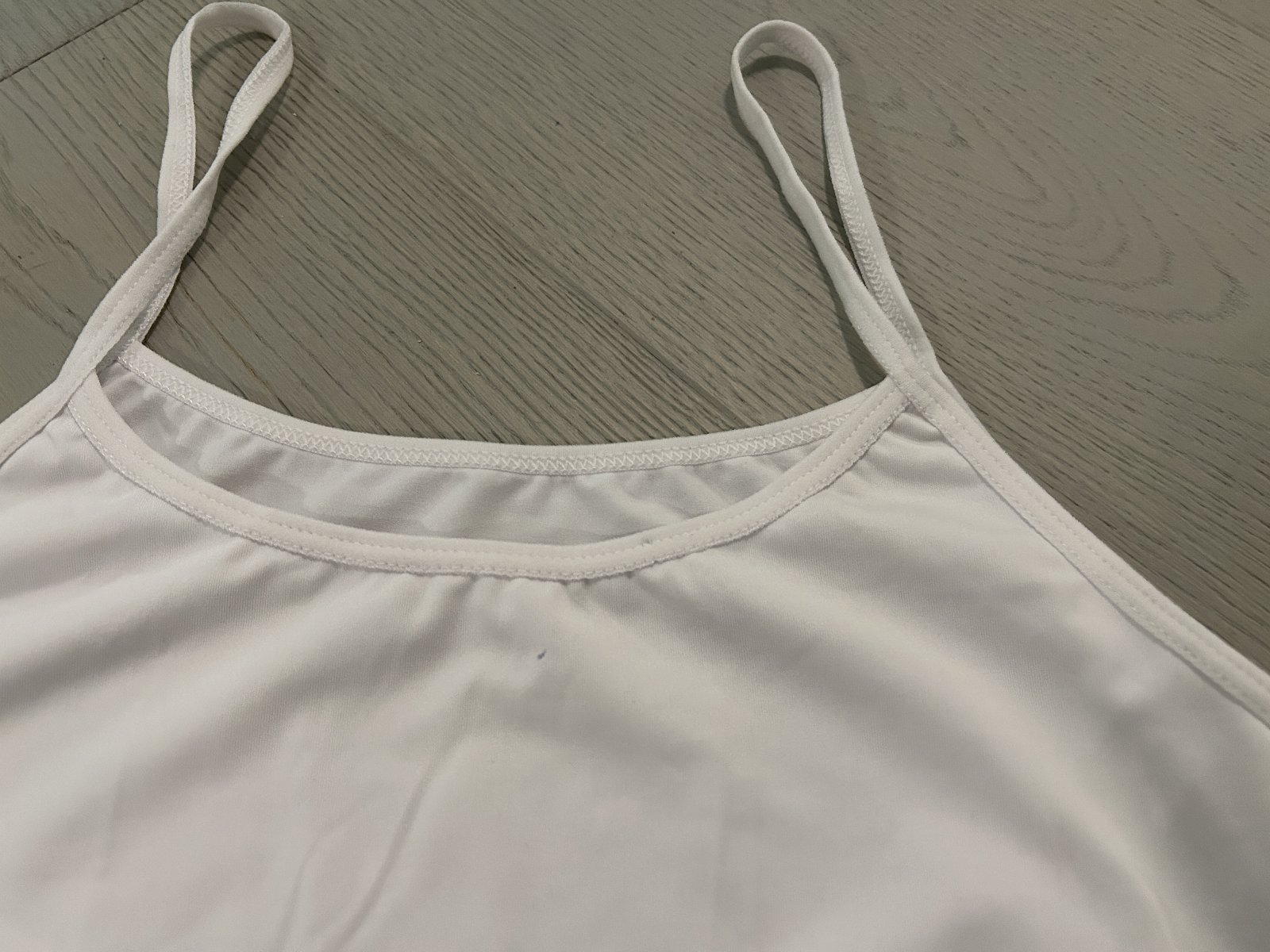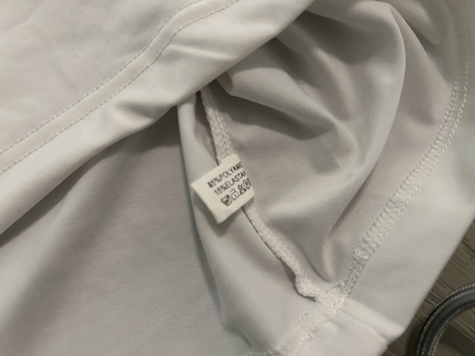 tielko bielej farby, materiál- 85% polyamid, 15% elastan. Veľkosť uvedená L/XL, ale maximalne M/L