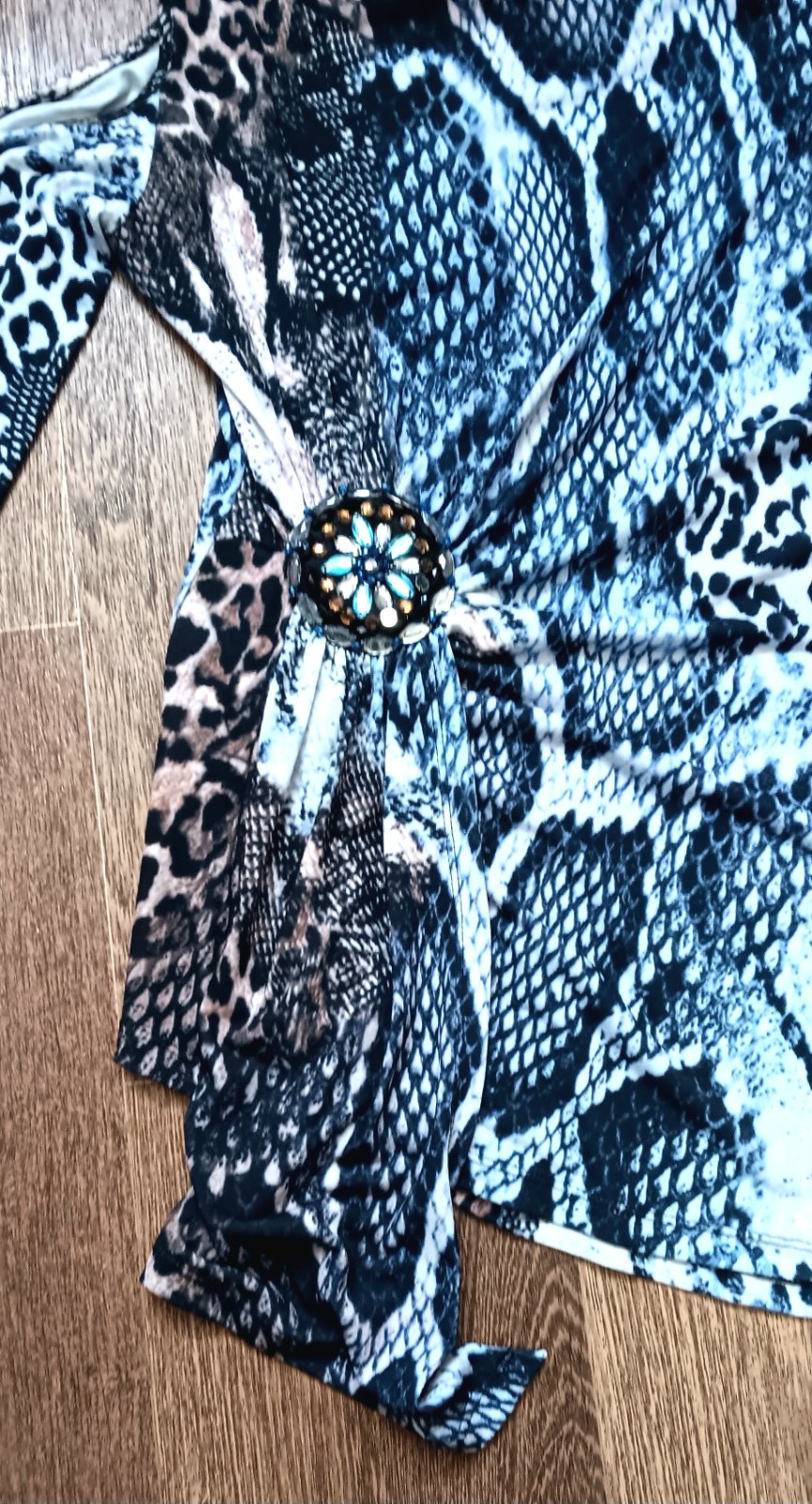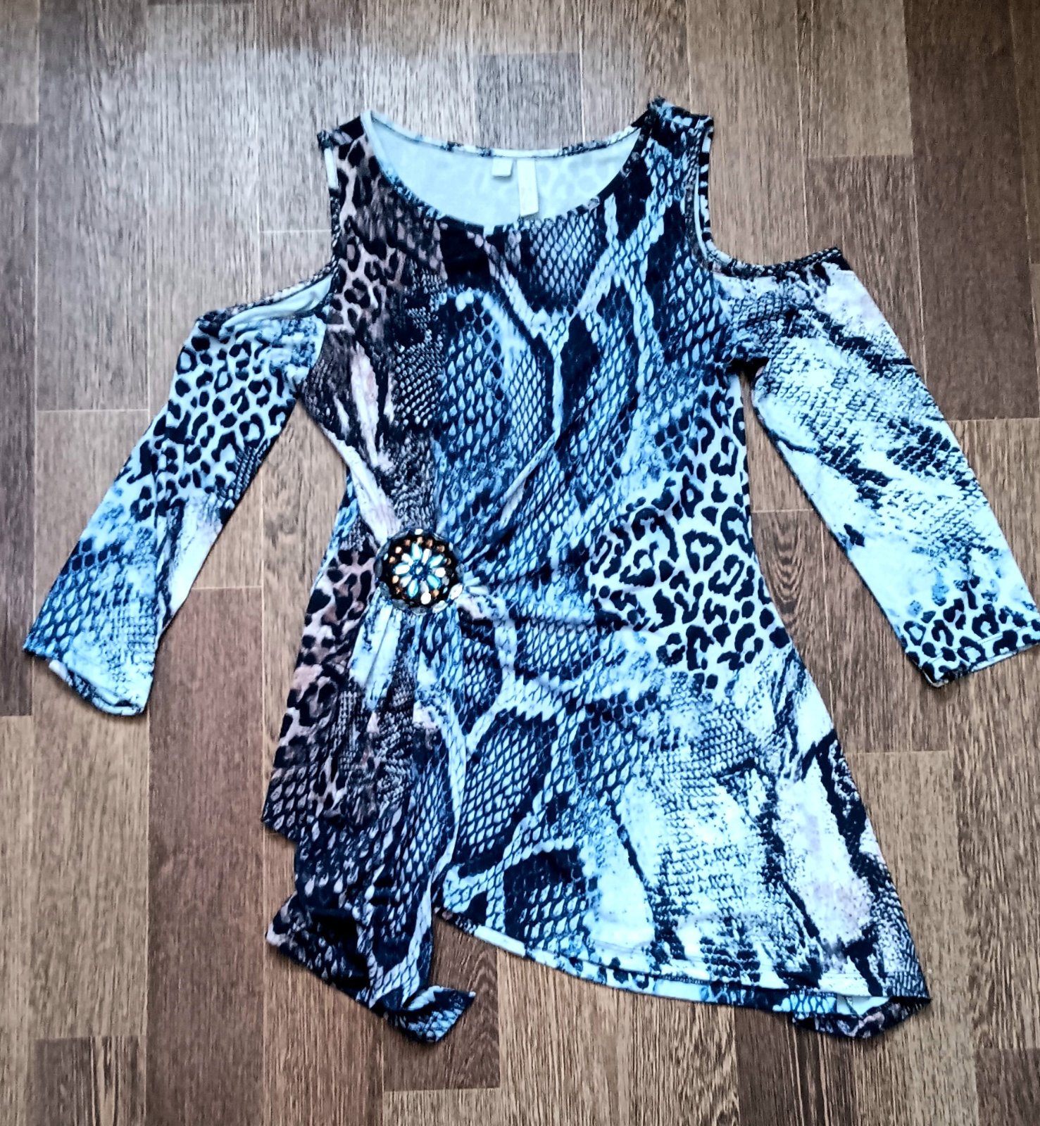 Predám 2x oblečenú predĺženú tuniku kupovanú dávnejšie v Bonprixe,bez poškodení....bohužiaľ pribrala som,už sa mi nehodí...veľkosť 36/38....asymetrický strih,otvory na pleciach,3/4 rukávy, vpredu pekná brošňa....95% polyester, 5% elastan.....šírka 41-51cm, najdlhšia dlžka 80cm....cena plus poštovné