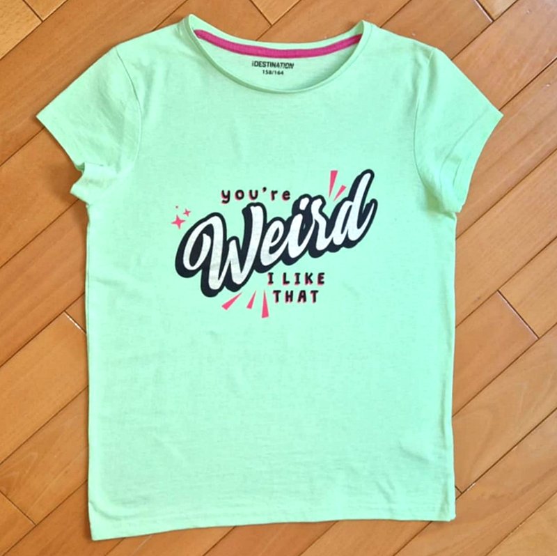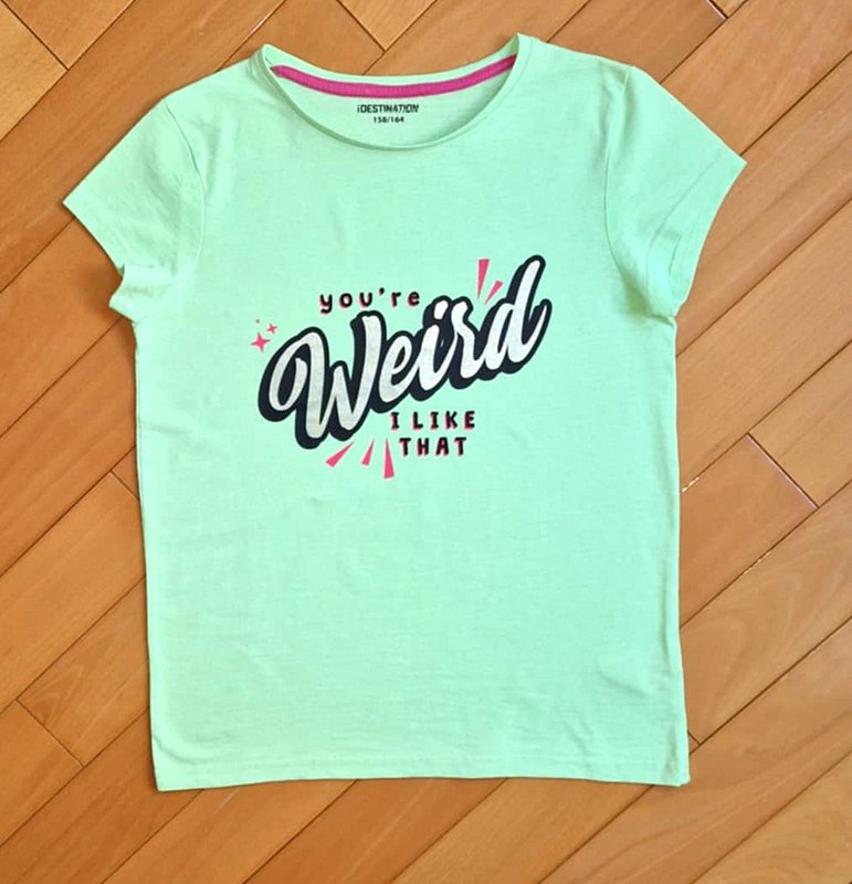 Veľkosť 158/164, ale je nositeľné skôr, preto zaraďujem ako 152. Dlžka trička 57-58cm, šírka pod pazuchami cca 41-42cm.