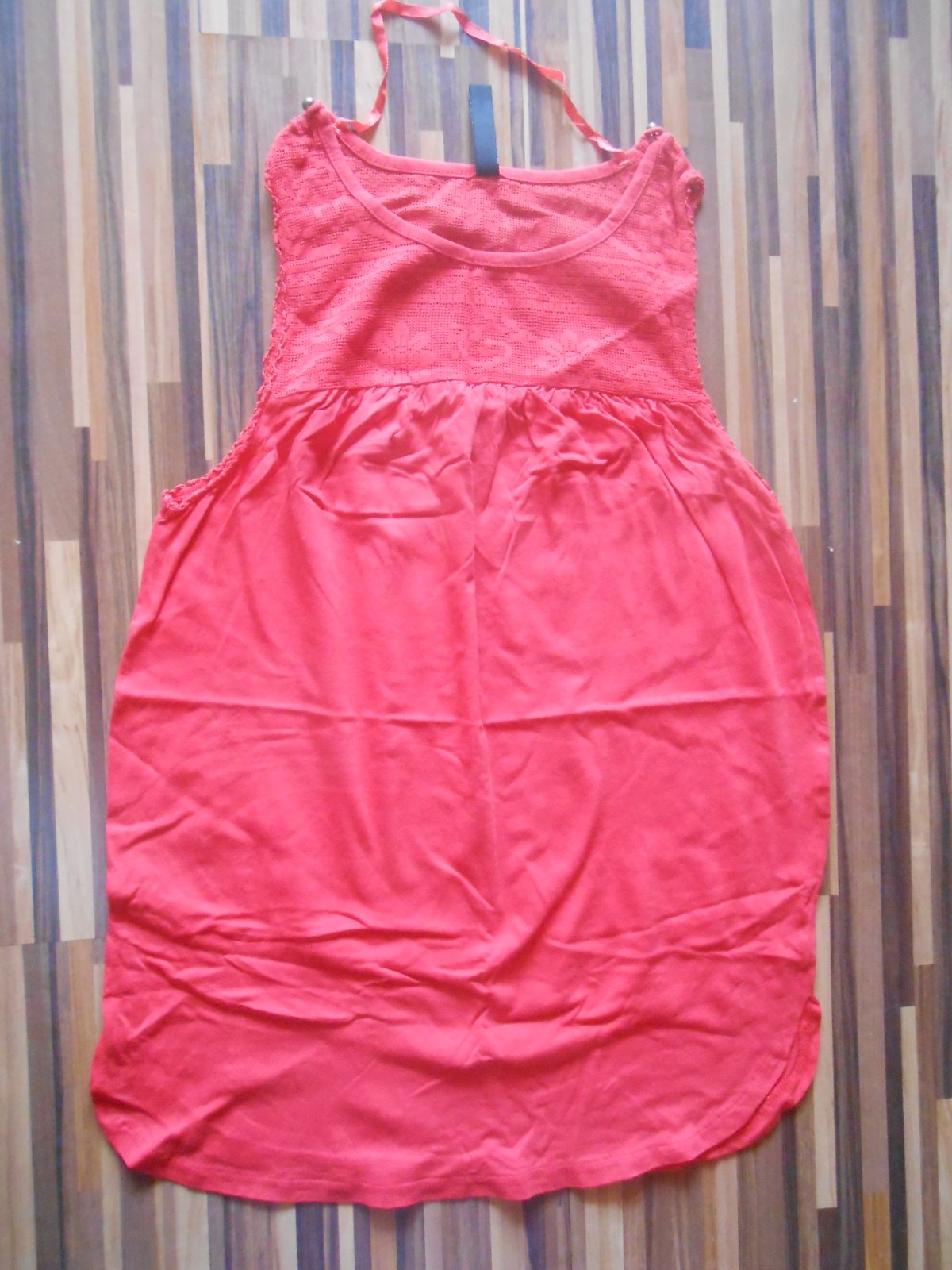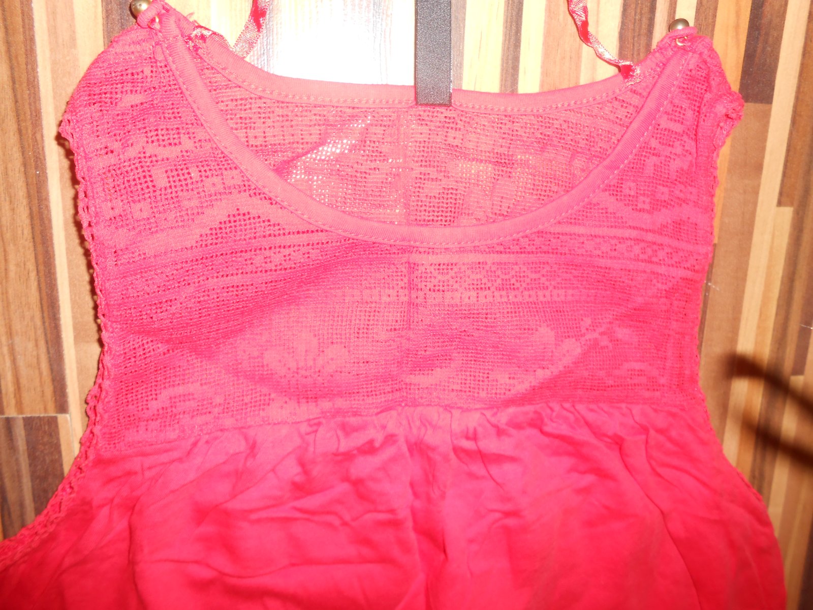 Tielko červenej farby, vrchná časť je z krajky, veľkosť S, 100% bavlna, výborný stav, bez dier, fľakov, žmolkov, šírka pod pazuchami 44 cm x 2, dĺžka 64 cm, cena + poštovné, na dobierku neposielam, platba vopred na účet. (N)