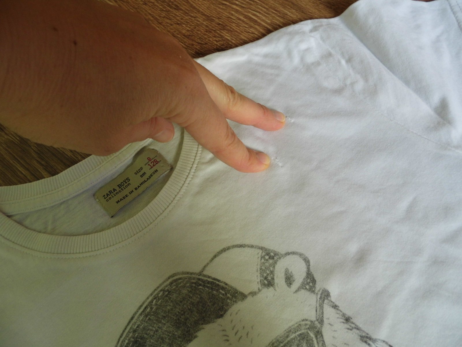 Chybičku krásy má len biele tričko s medveďom/bobrom - 2 dierky, no je to zašité. (viď foto)