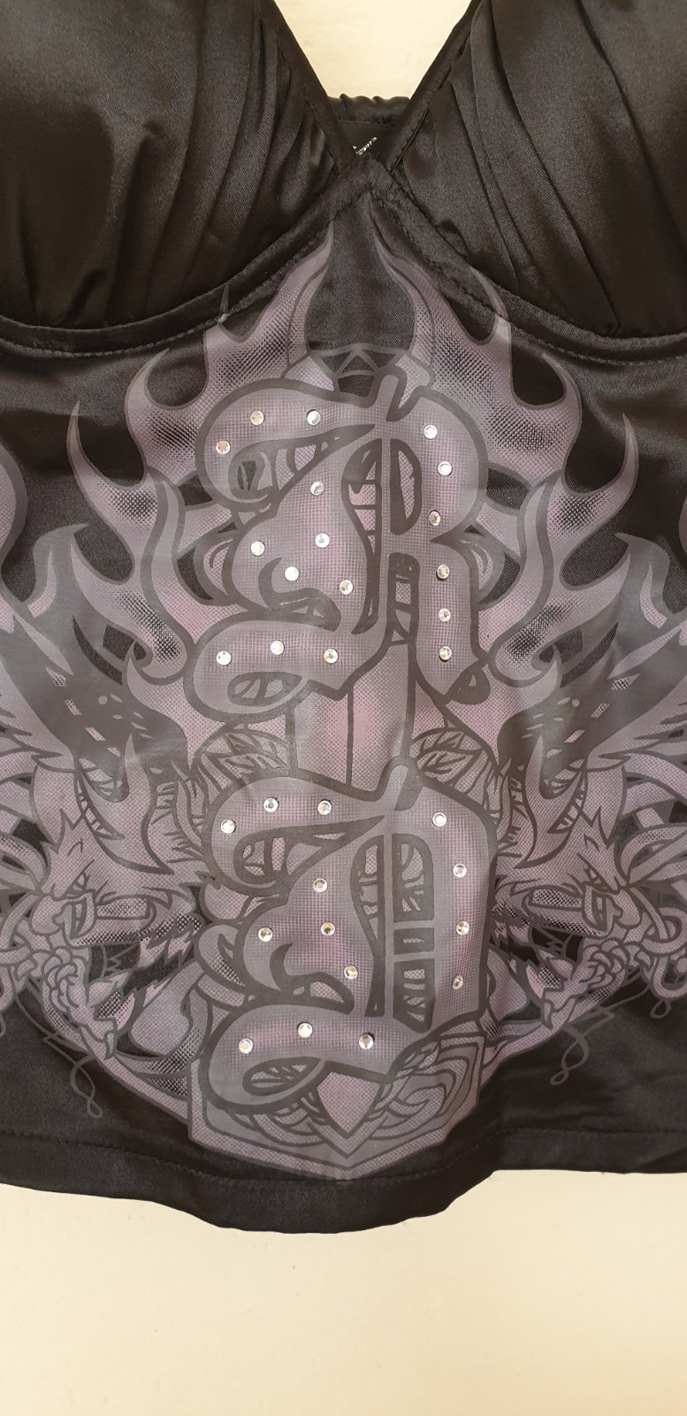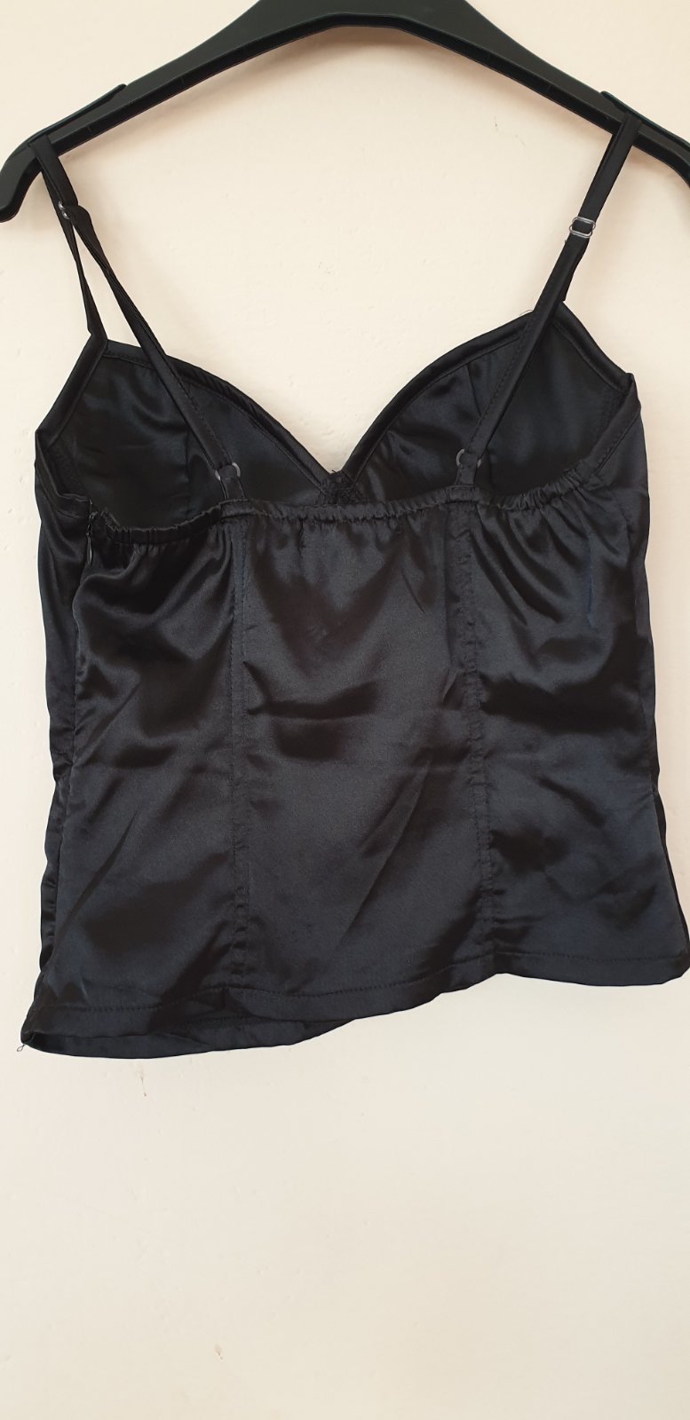 Nádherný saténový sexy čierny korzetík s kamienkami značky REDIAL. Je nádherný k rifliam. Mne je už malý a k môjmu veku sa už nehodí. ;-D je naozaj krásny pre odvážne dámy. Podprsenka je pevná a trošku vystužená. Dĺžka od pazuchy dole 31cm. Ramienka sú regulovateĺné. Šírka pod pazuchami 35x2cm. Vzadu je gumička.