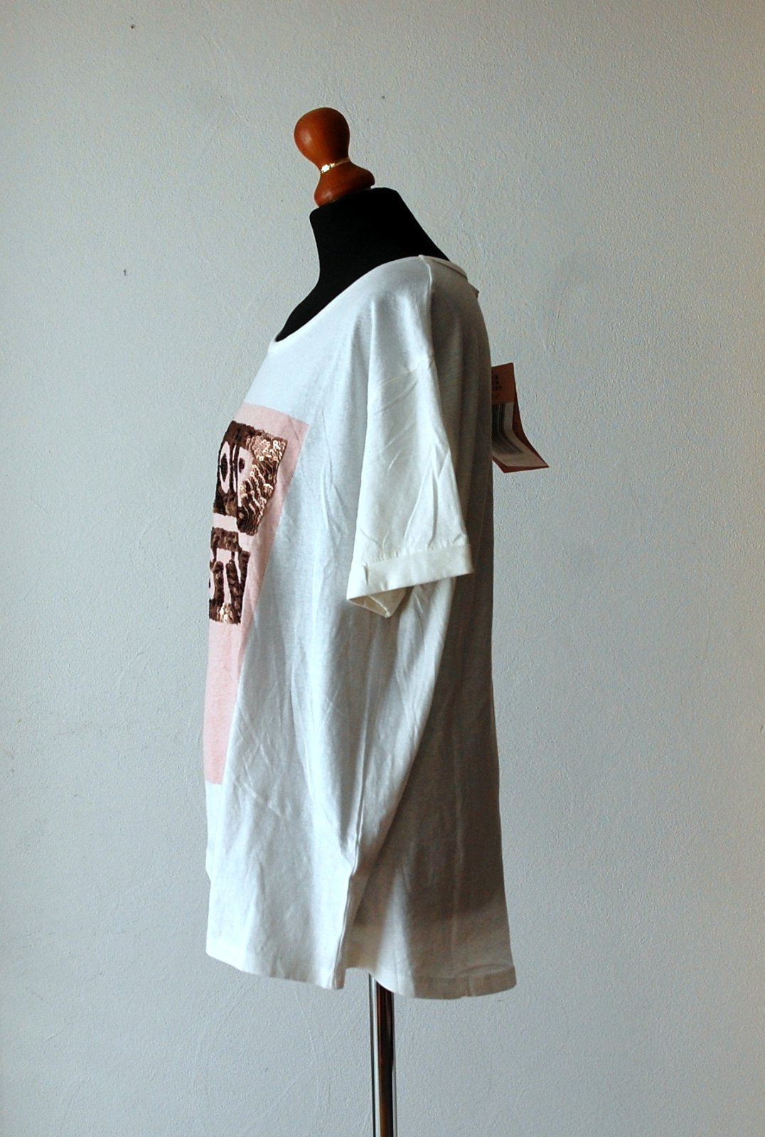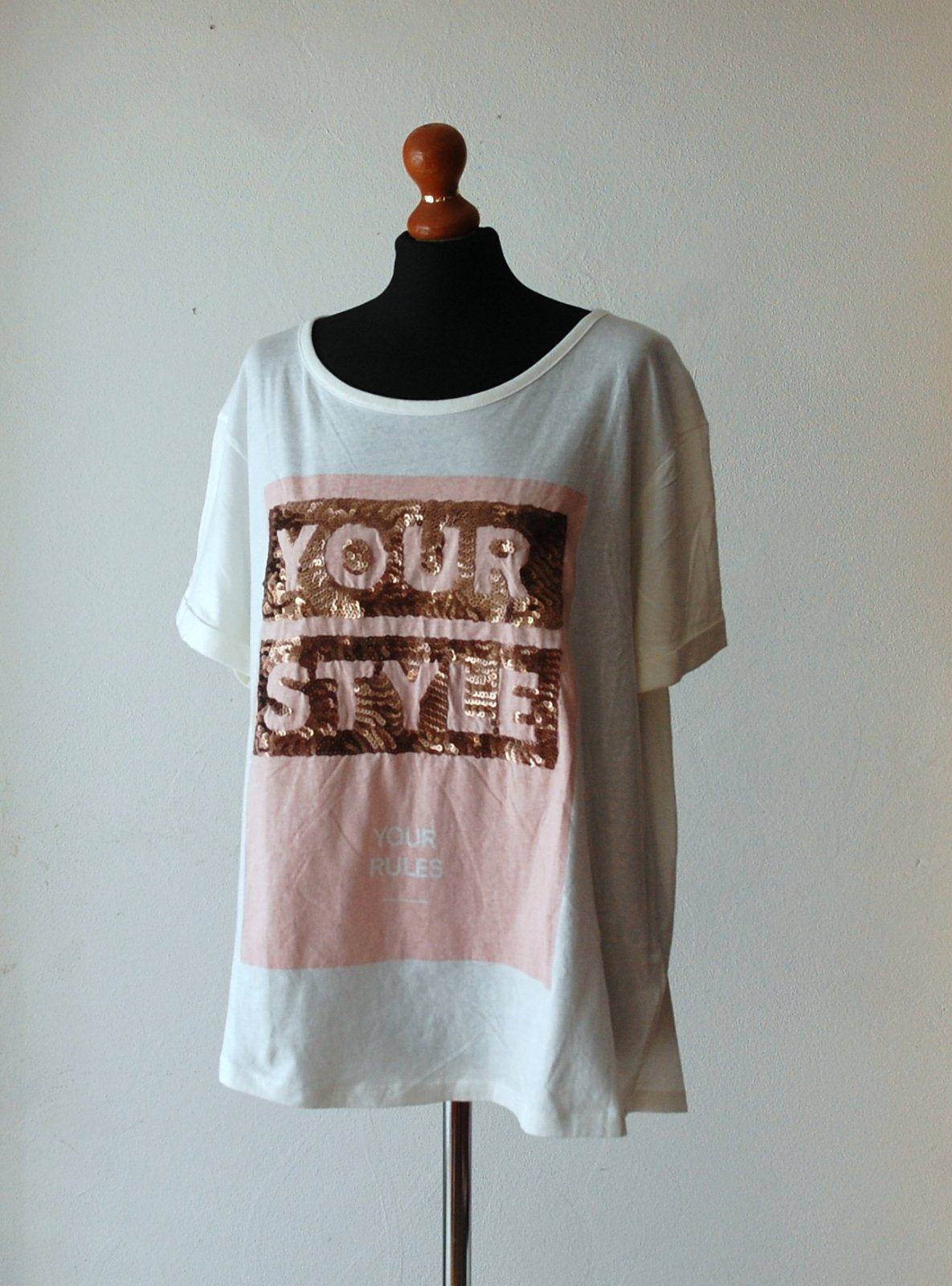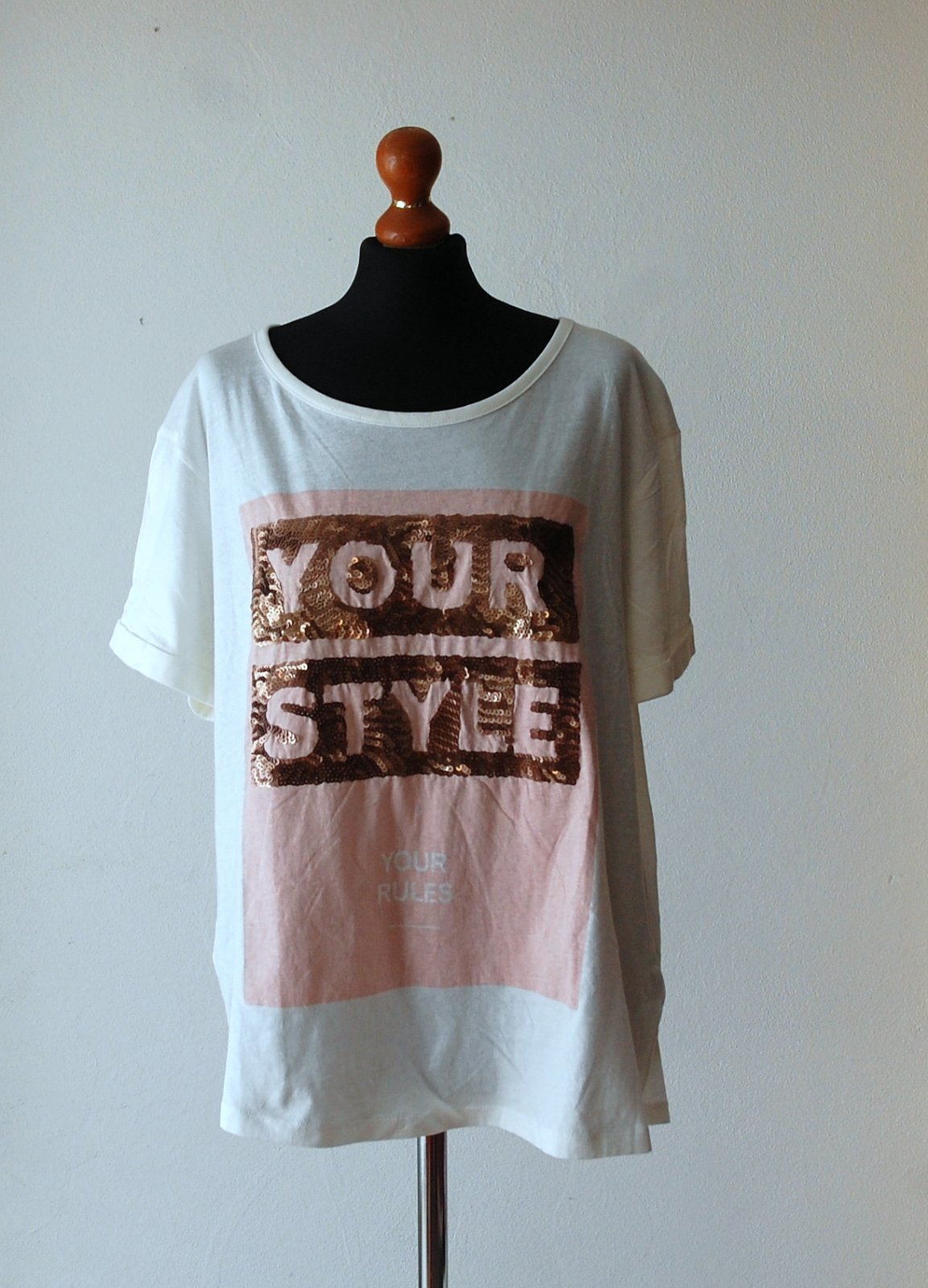 Predám trendy dámske tričko v žiarivo bielej farbe, ktoré zaujme na prvý pohľad. Prednú stranu zdobí výrazná aplikácia v staroružovom obdĺžniku s nápisom „YOUR STYLE“ vytvoreným z lesklých zlatých flitrov. Pod ním je jemný biely nápis „Your Rules“.