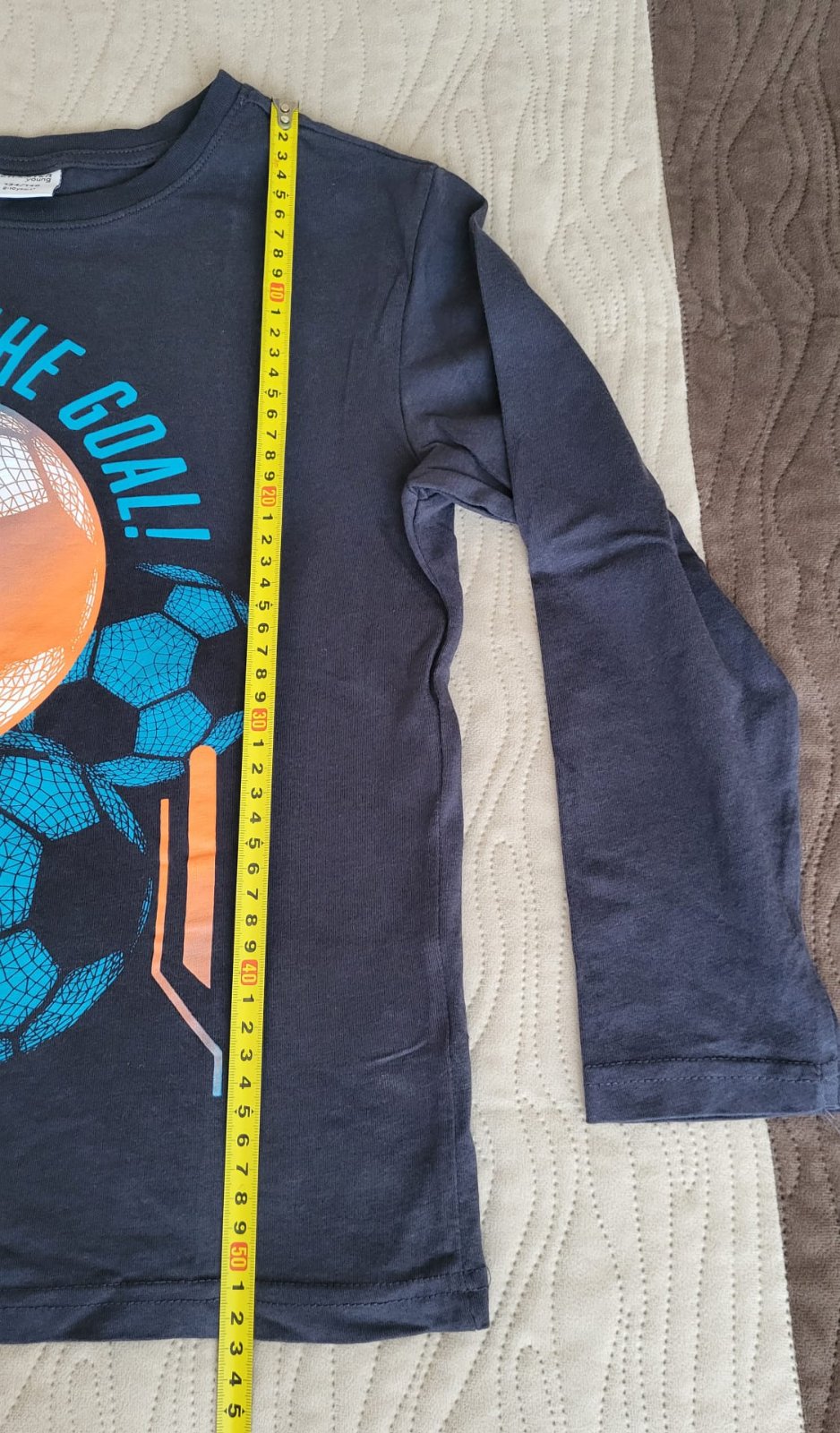 Chlapčenské šedé tričko s dlhým rukávom s nápisom vpredu. Značka Chapter Young. Veľkosť 134/140 (na 8-10 rokov). Dĺžka 50 cm. Šírka pod pazuchami 39 cm. Dĺžka rukáva od ramena 54 cm.