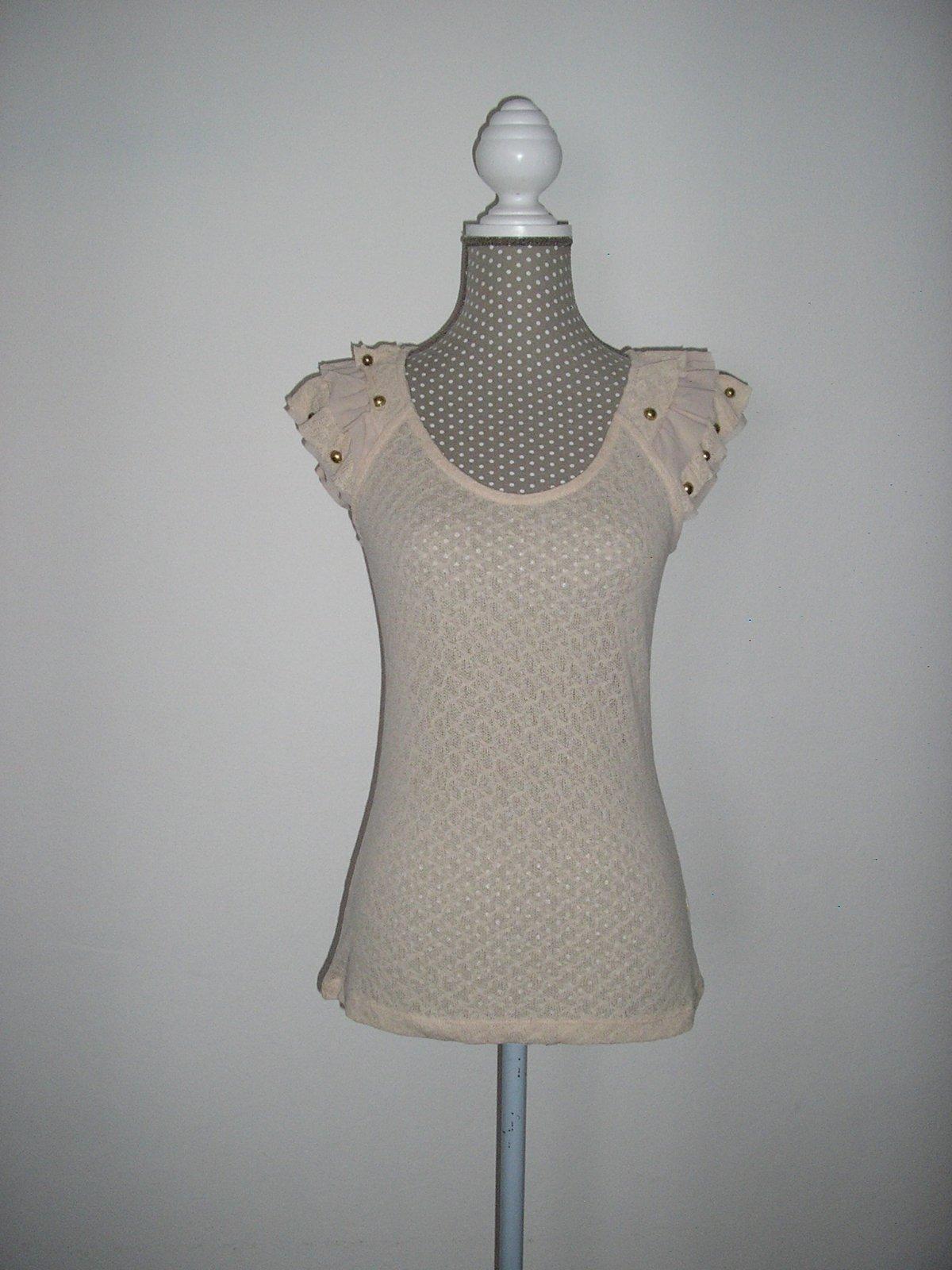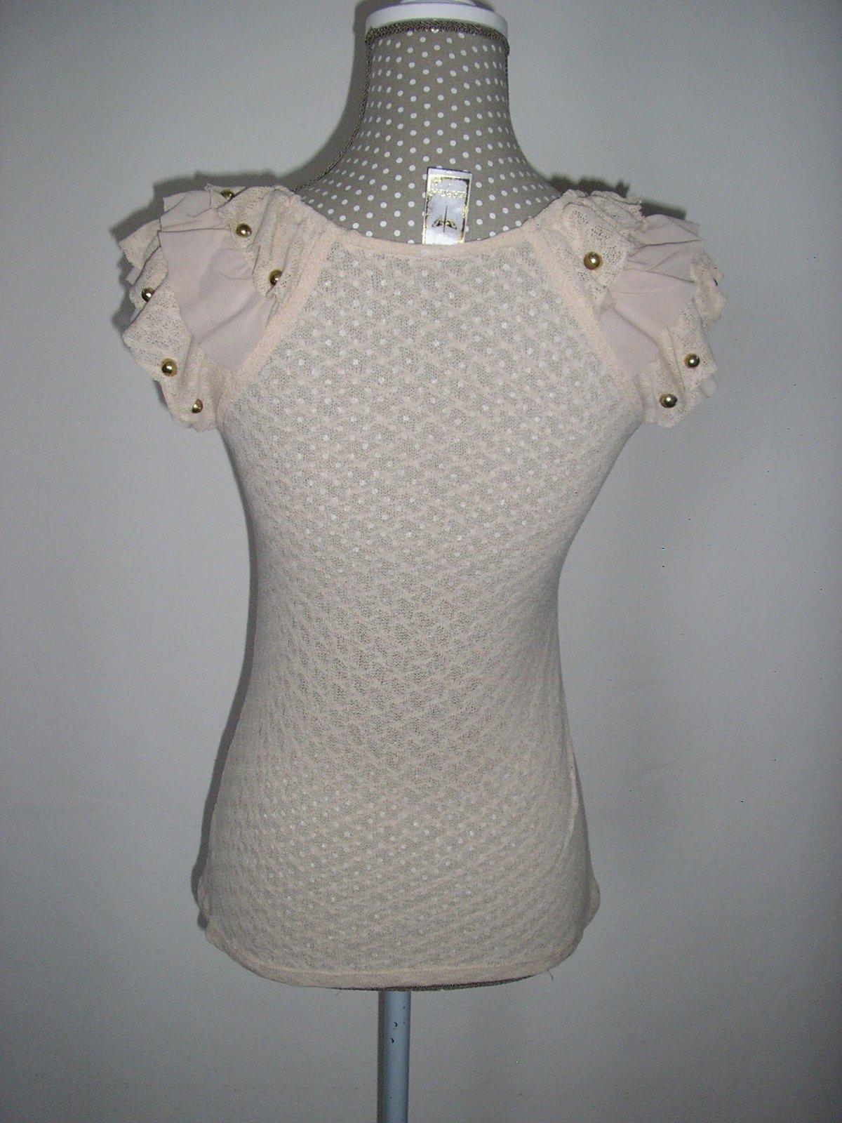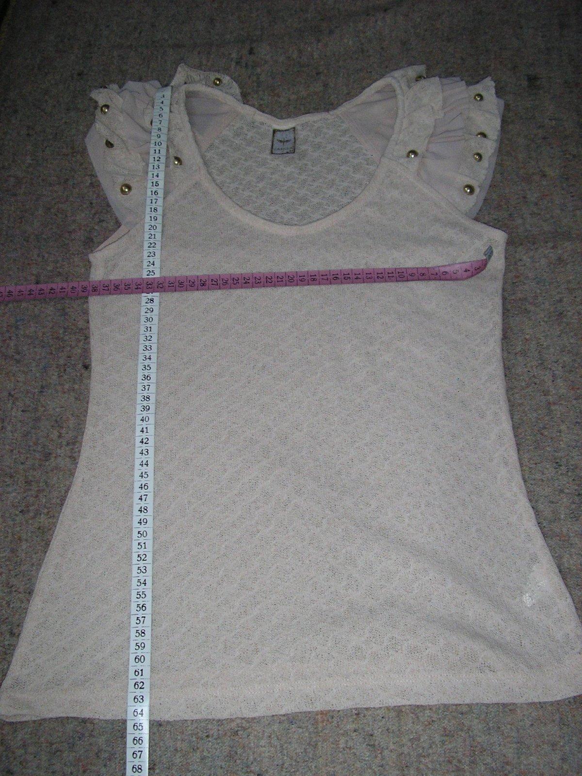 Jemná broskyňová farba, okrúhly výstrih, kr. raglánové ruk. zdobené volánikmi. Mierne priesvitná látka. Elegantné , krásne tričko.