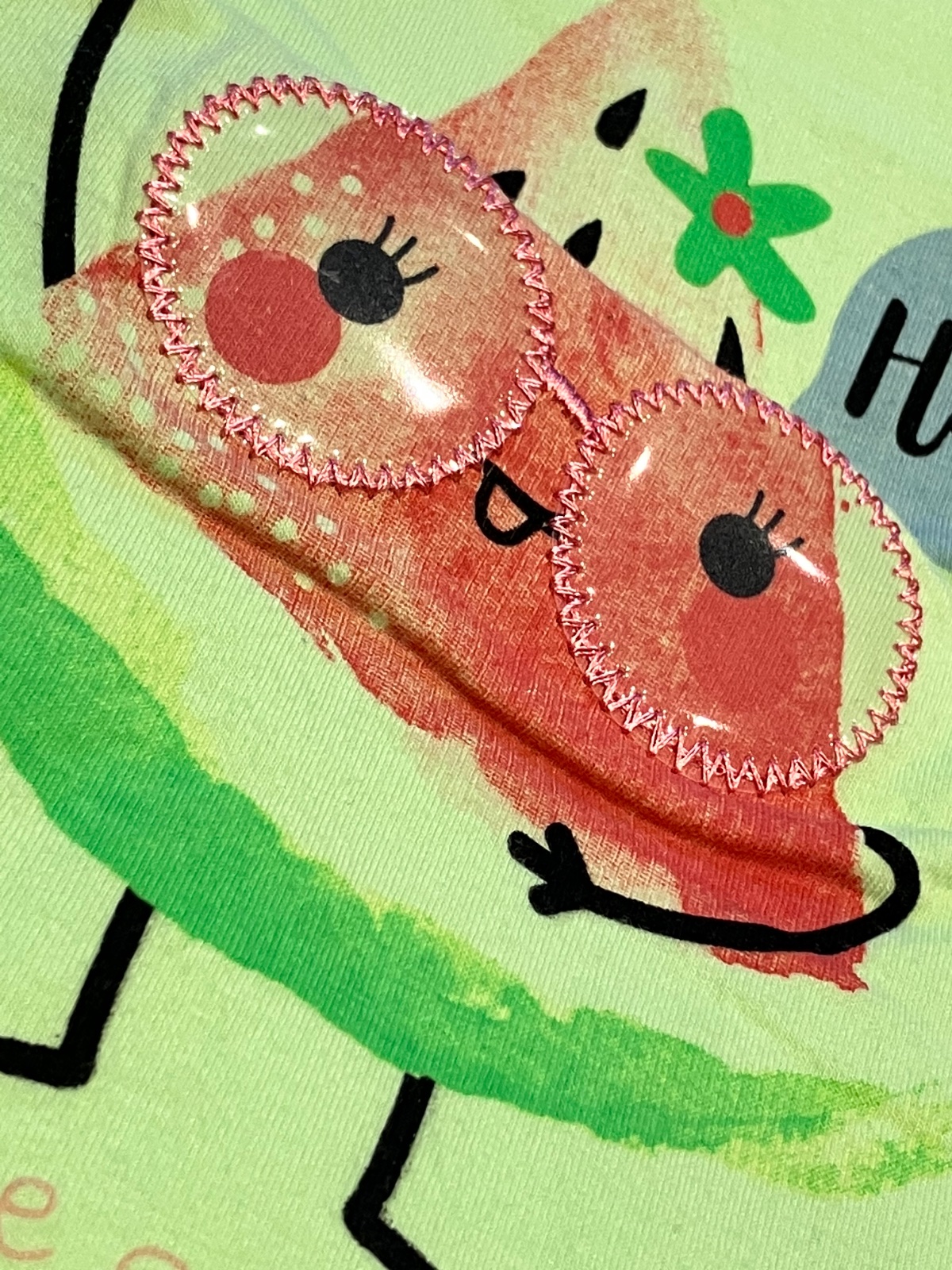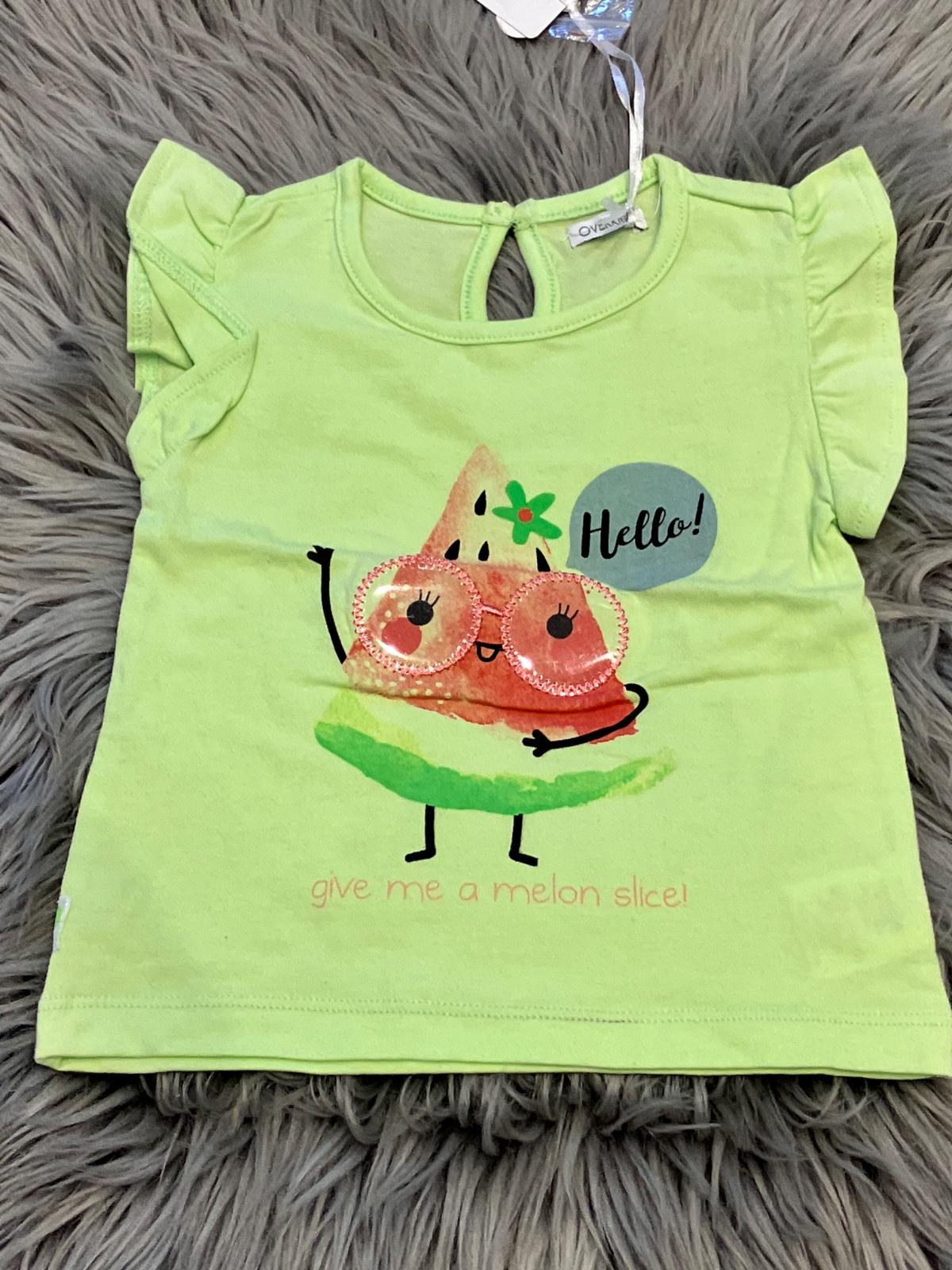 Dievčenské tričko s krátkym rukávom a potlačou melóna a nápisom Hello. Vzor okoliare 3D. Okrúhly výstrih. Elastické. Zapínanie vzadu na jeden gombík. Volánikový rukáv. Pre 6-9 mes. Materiál 95%bavlna 5%elastan.
