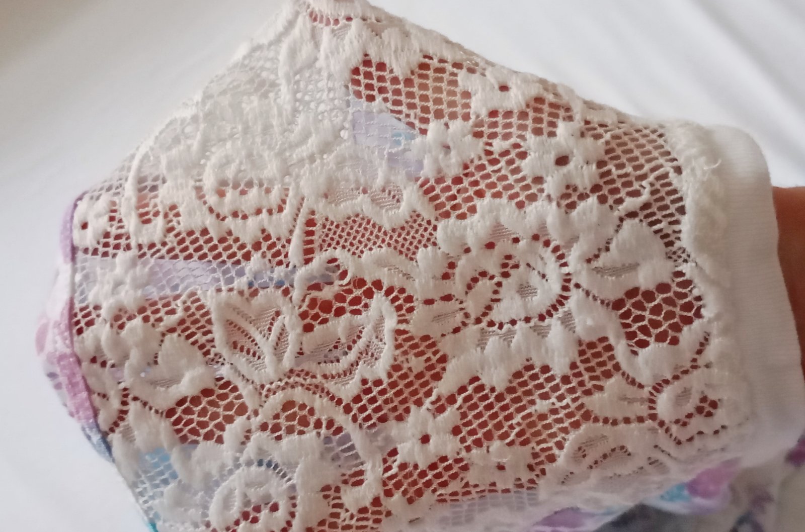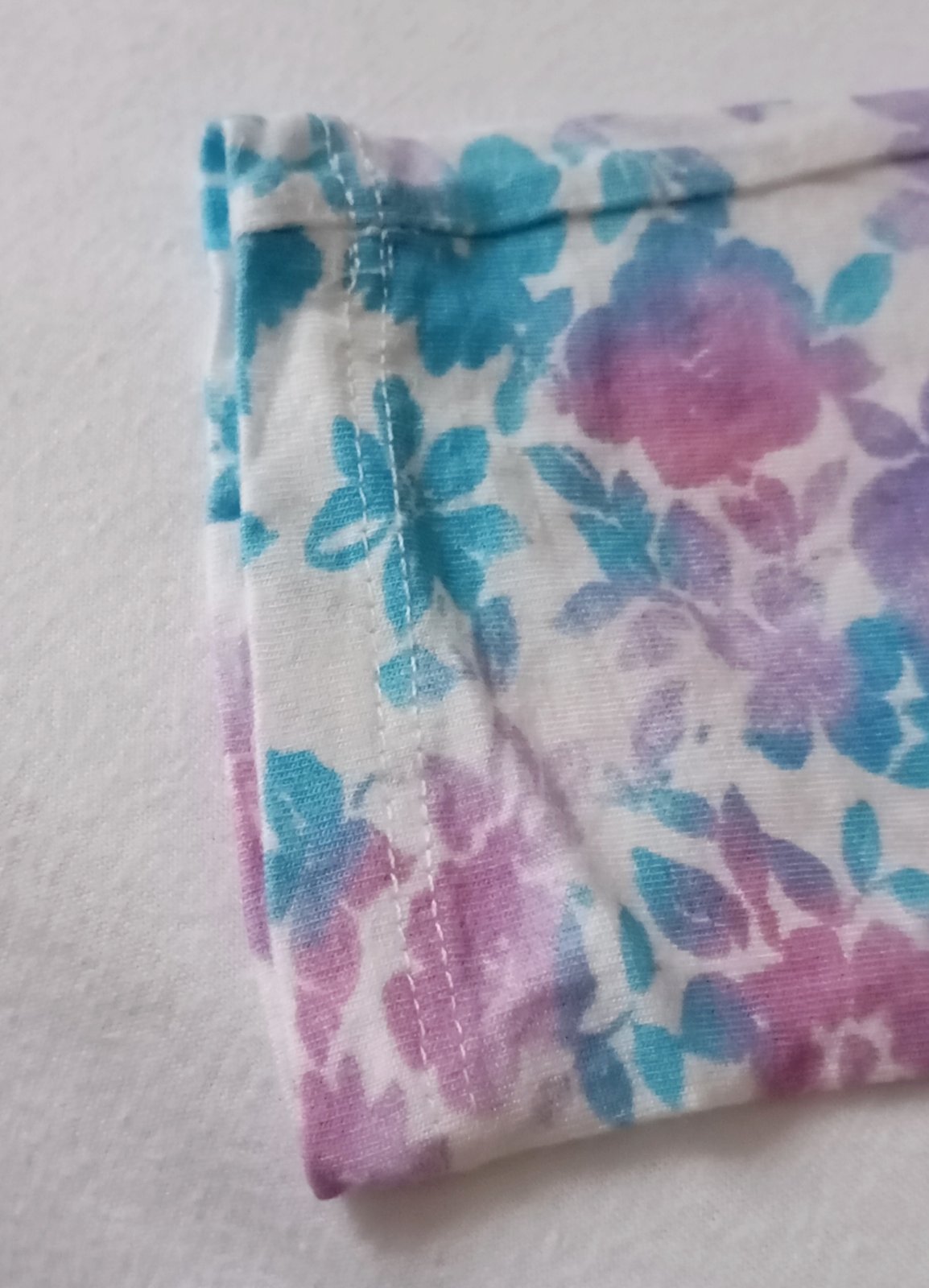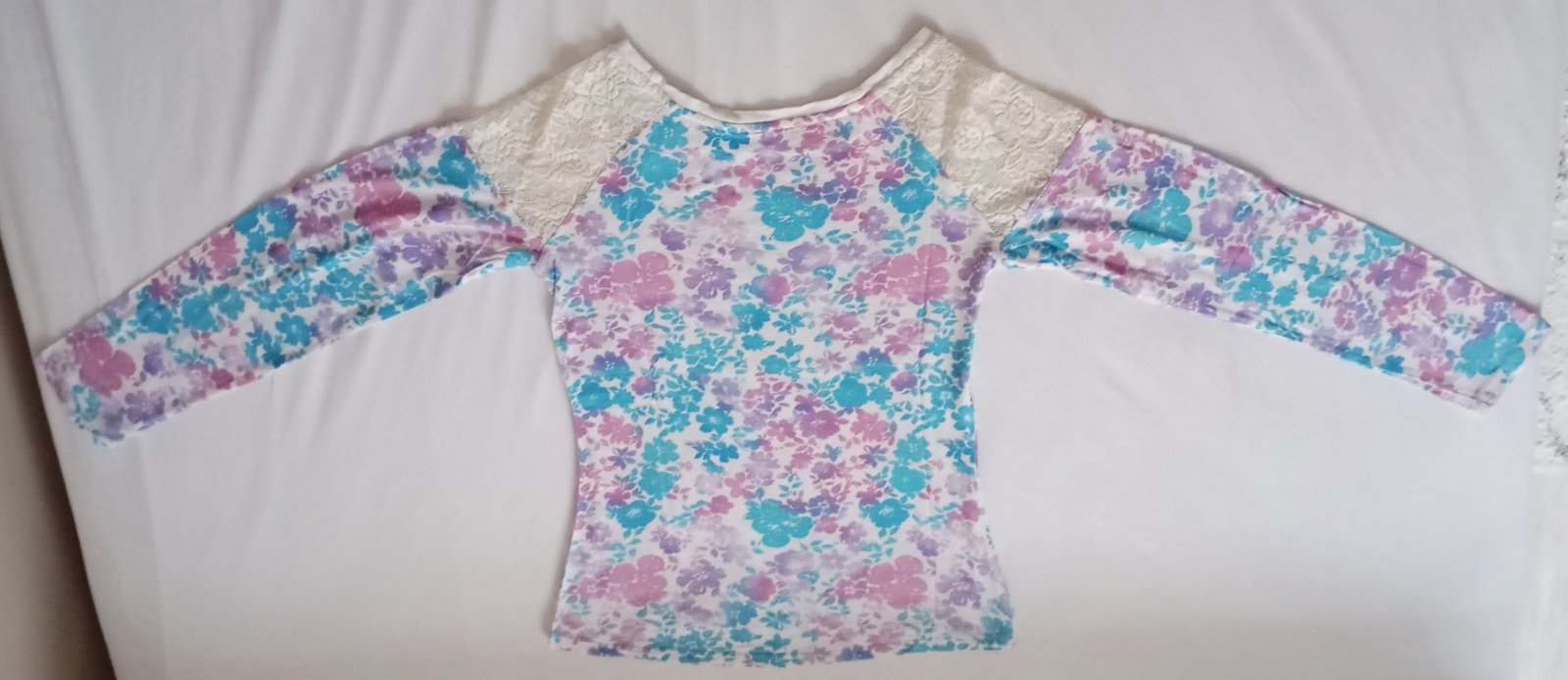 Roztomilé tričko s dlhým rukávom s čiastočne priehľadnou bielou čipkou na pleciach. Základnou farbou je biela (alebo veľmi svetlá takmer-biela s krémovým nádychom), kvietkovaný vzor je v rôznych odtieňoch svetlomodrej, fialovej a ružovej.