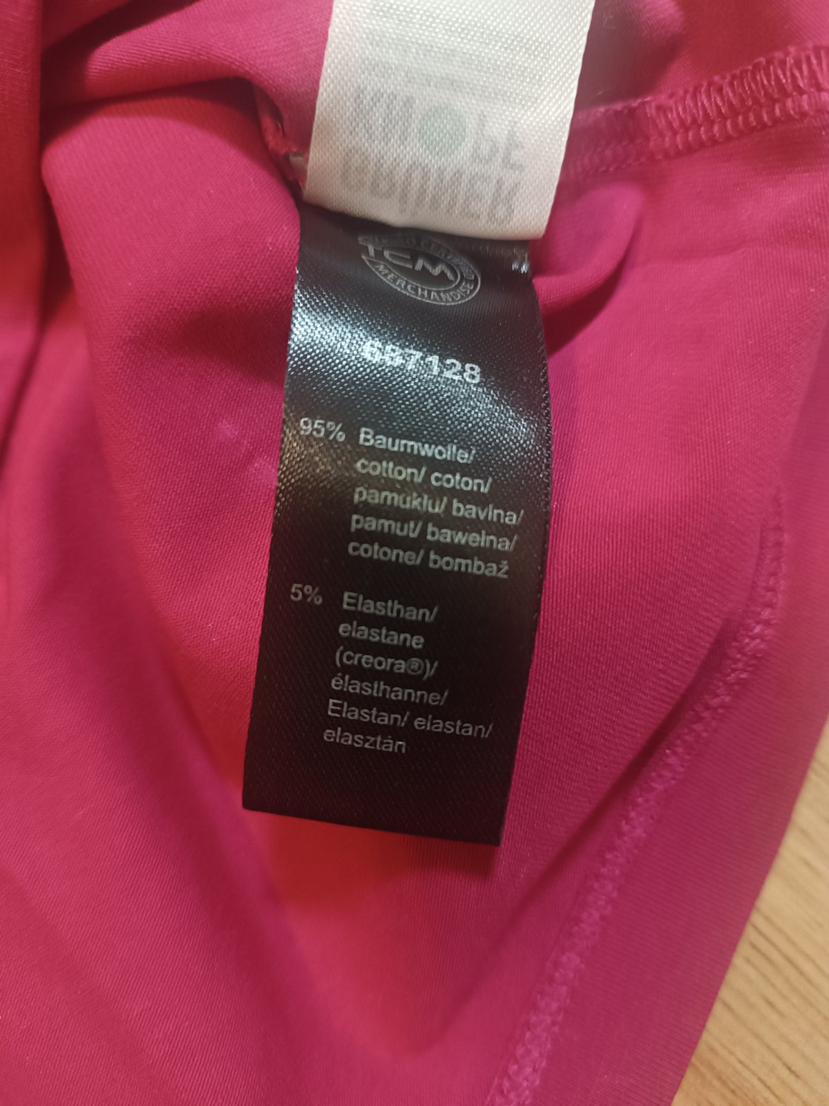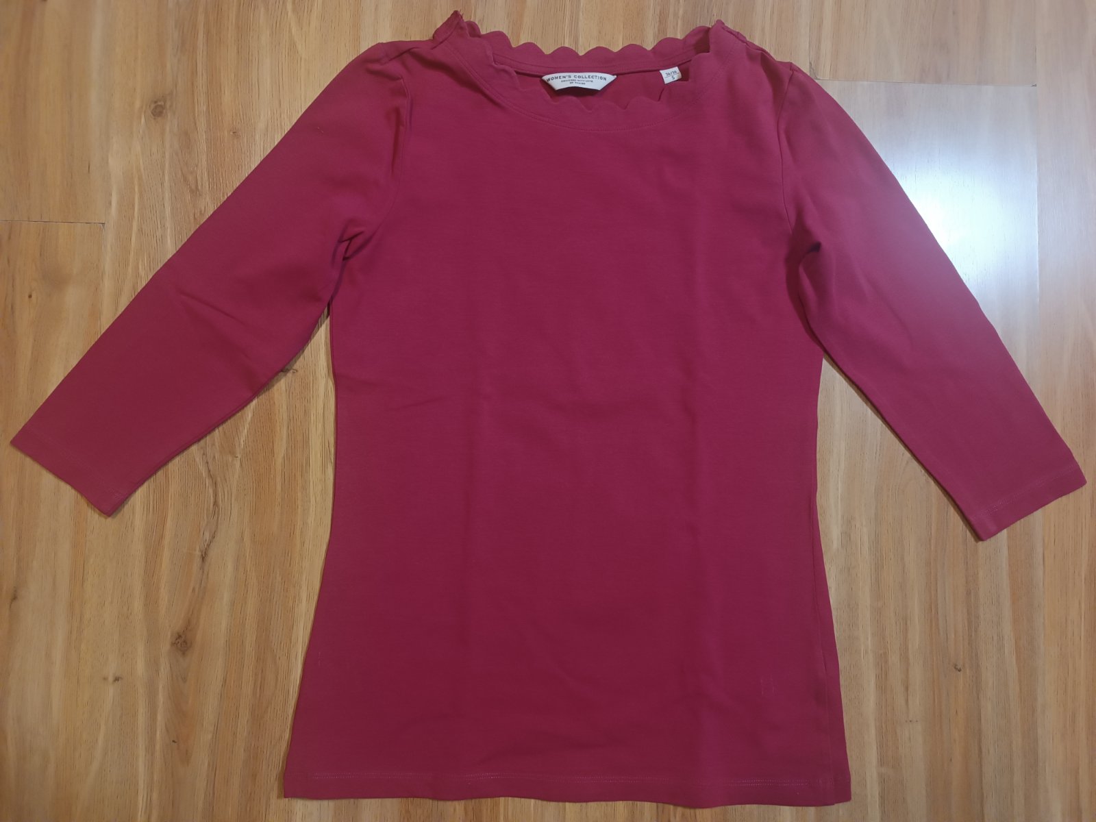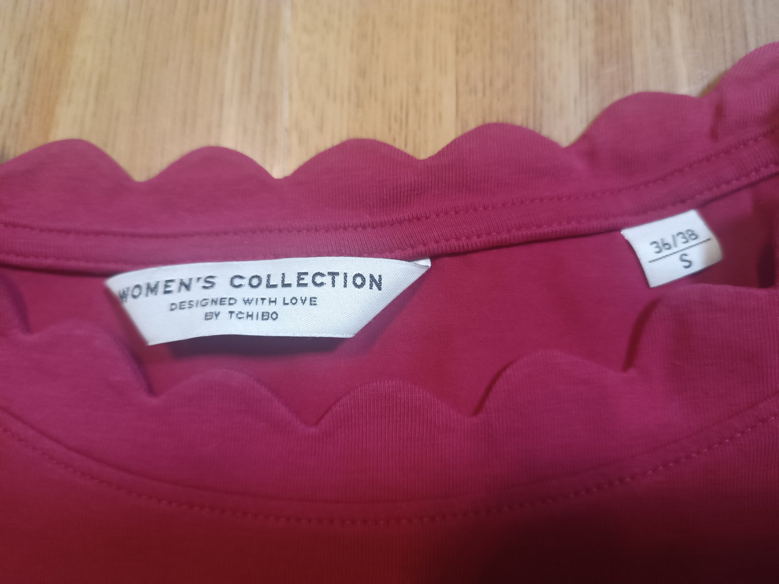 Tričko s vlnkami okolo výstrihu, zn. Tchibo, 3/4 rukáv, veľ. 36/38 - S, malinová farba. Celková dĺžka 61.5cm, šírka pod pazuchami 42cm, rukáv 44cm. Výborný stav, raz oblečené.