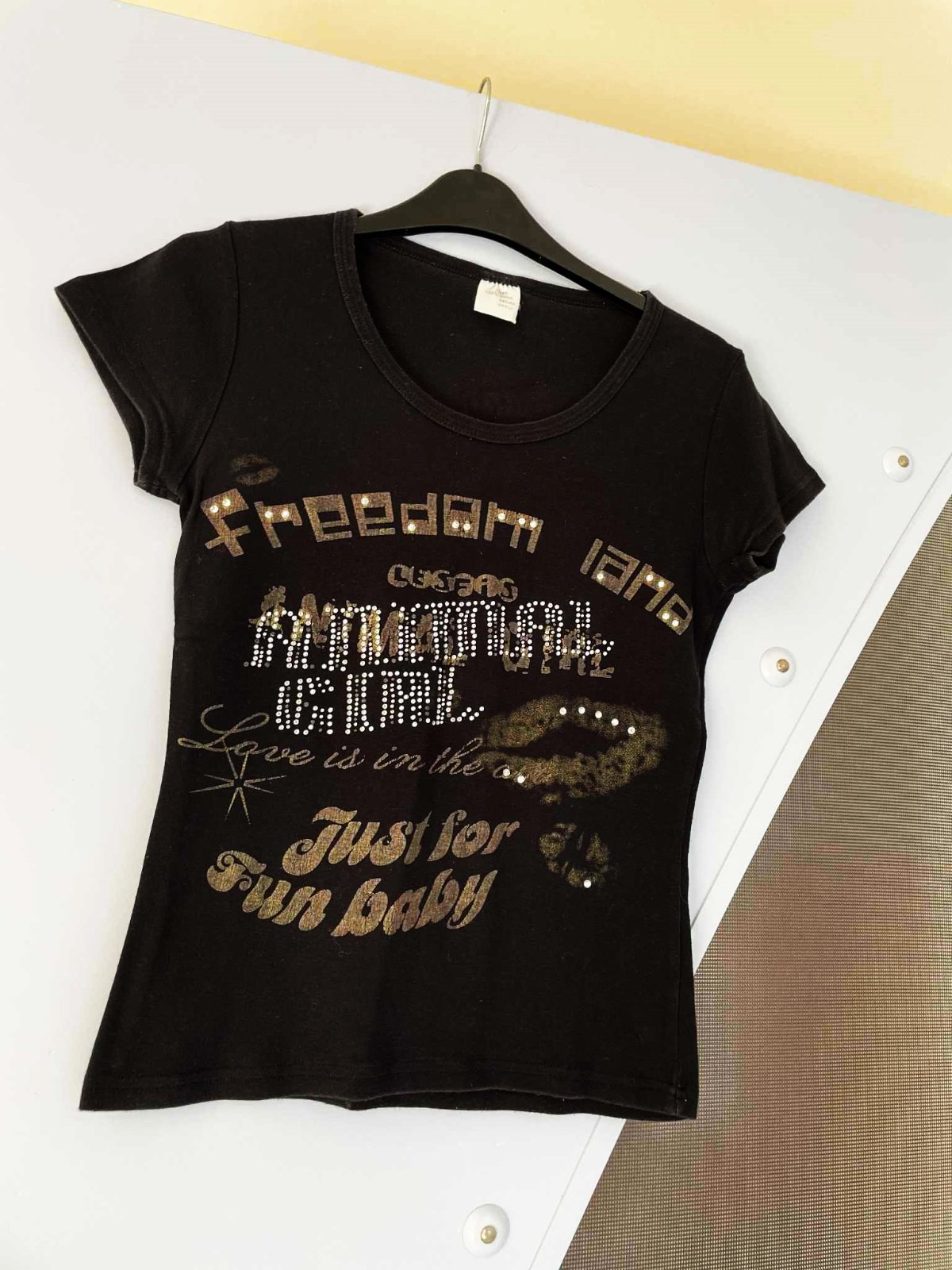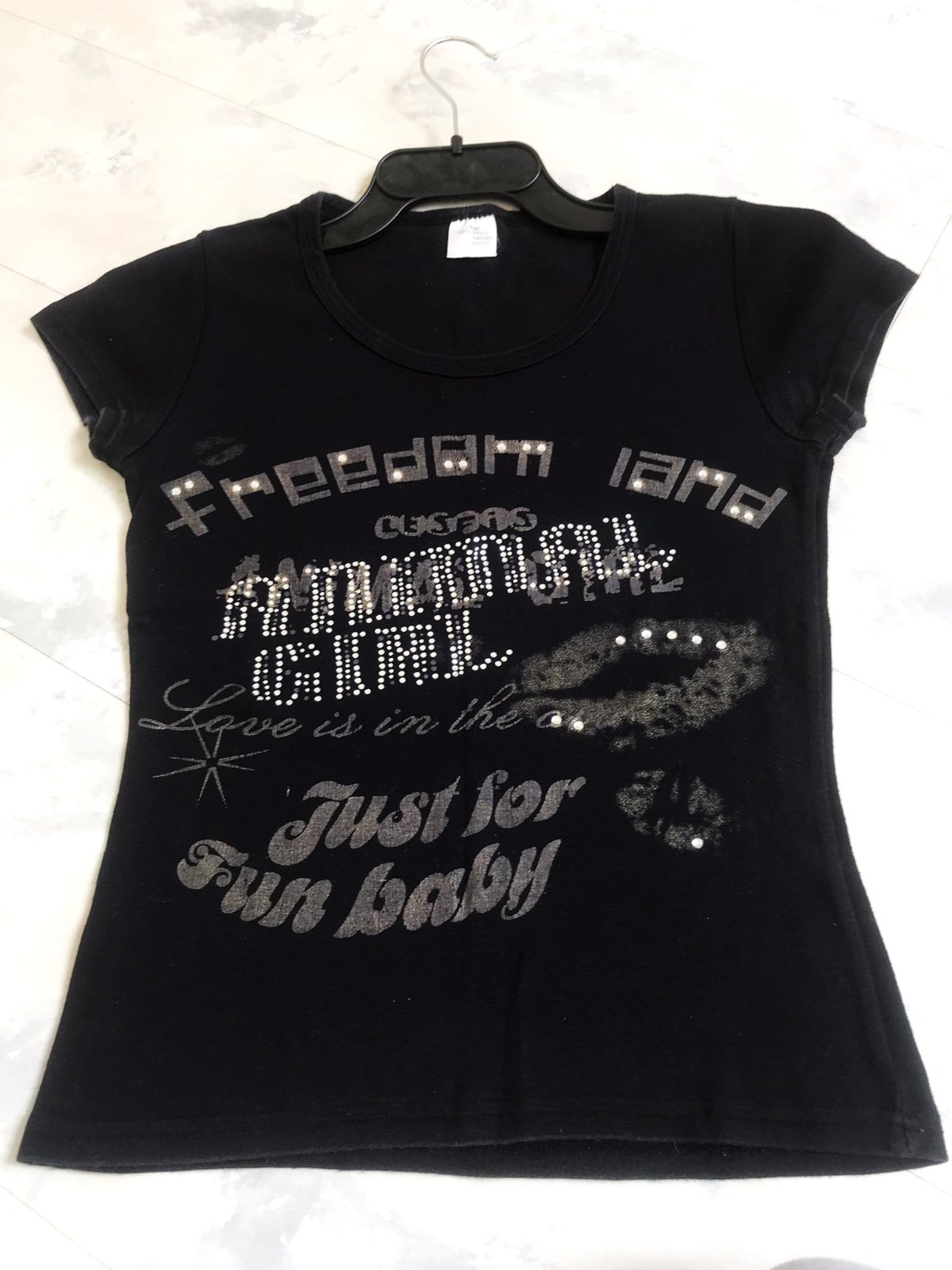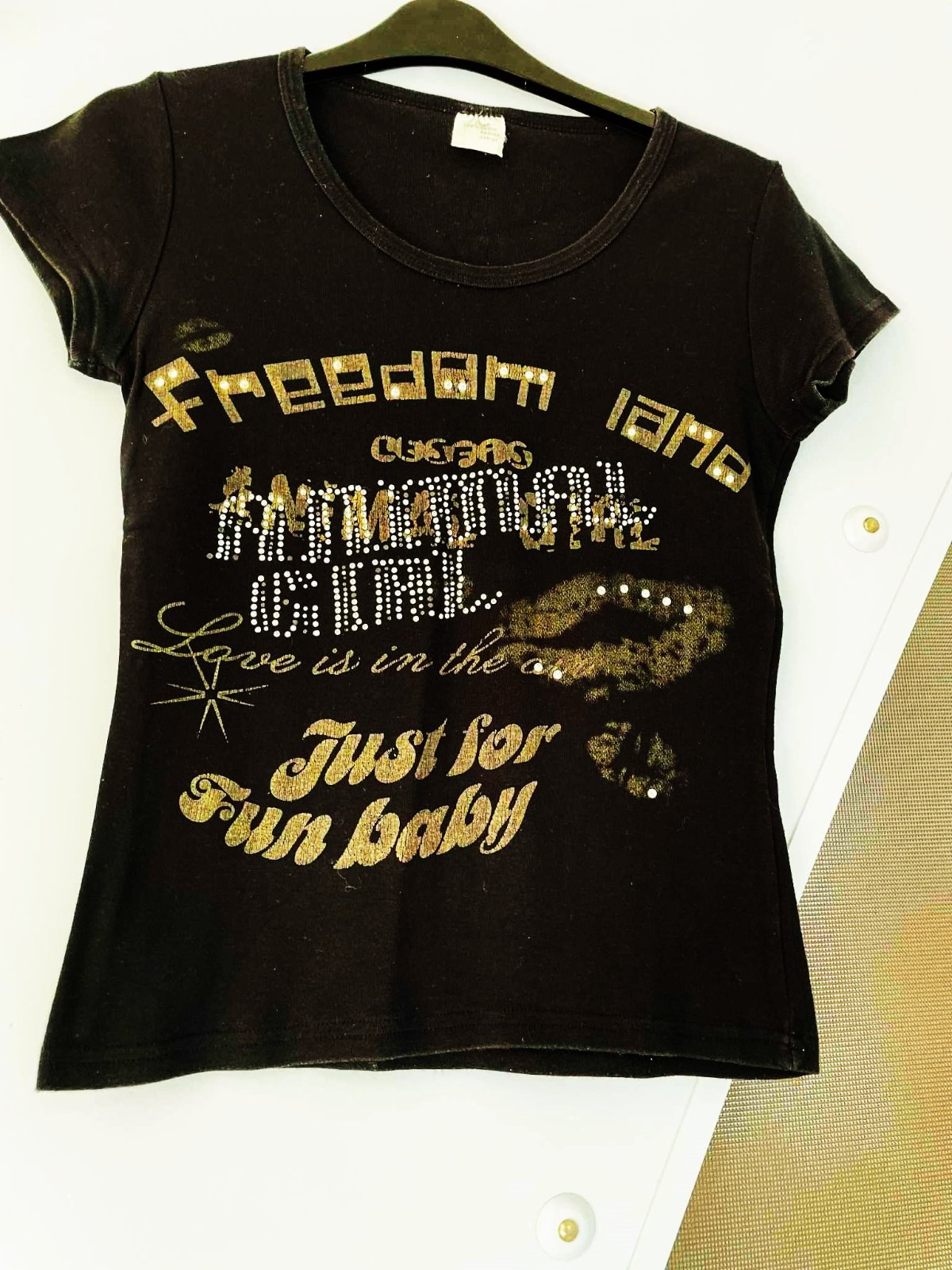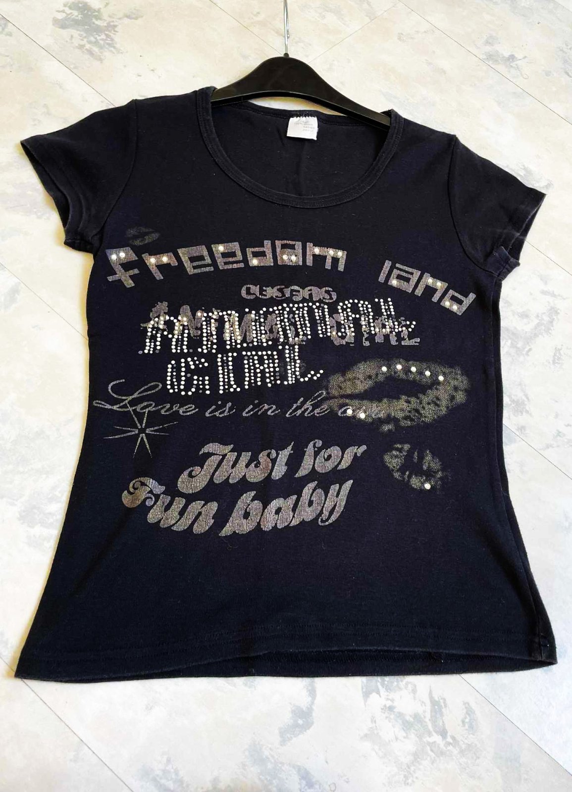 zaujímavé tričko,hrubšie,pevnejšie,100% bavlna,vybíjané - s trblietavými kamienkami vpredu,dlžka = 64 cm,šírka = 50 x 2 cm,dlžka = 65 cm,šírka = 42/43 x 2 cm,veľkosť 38/40