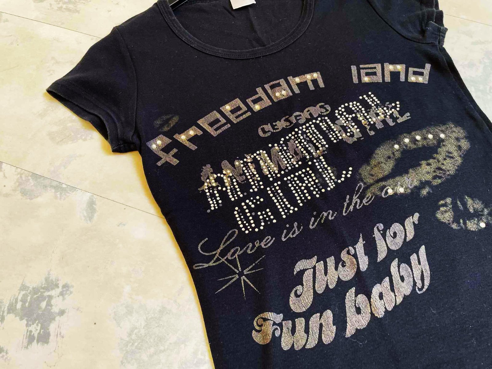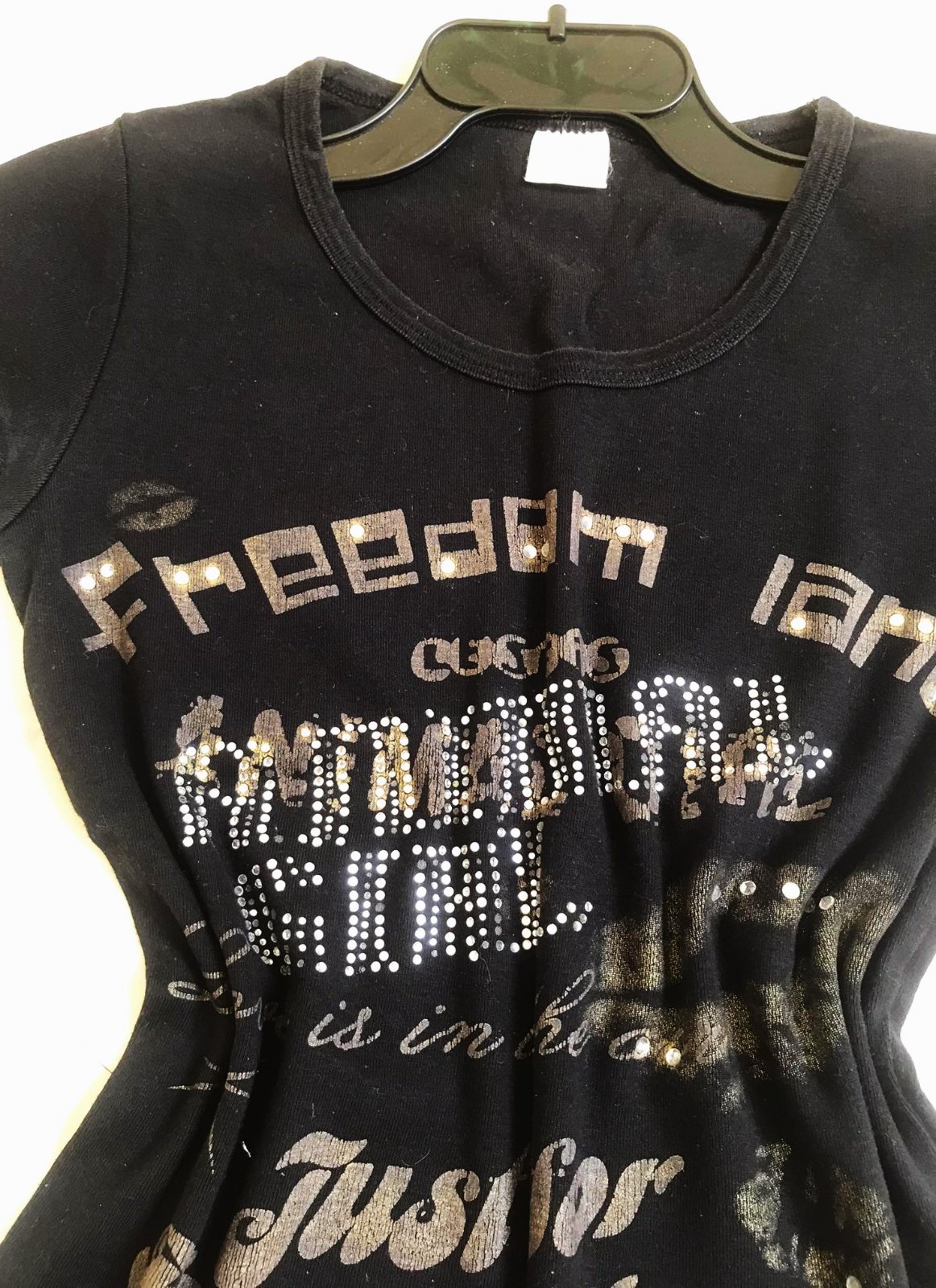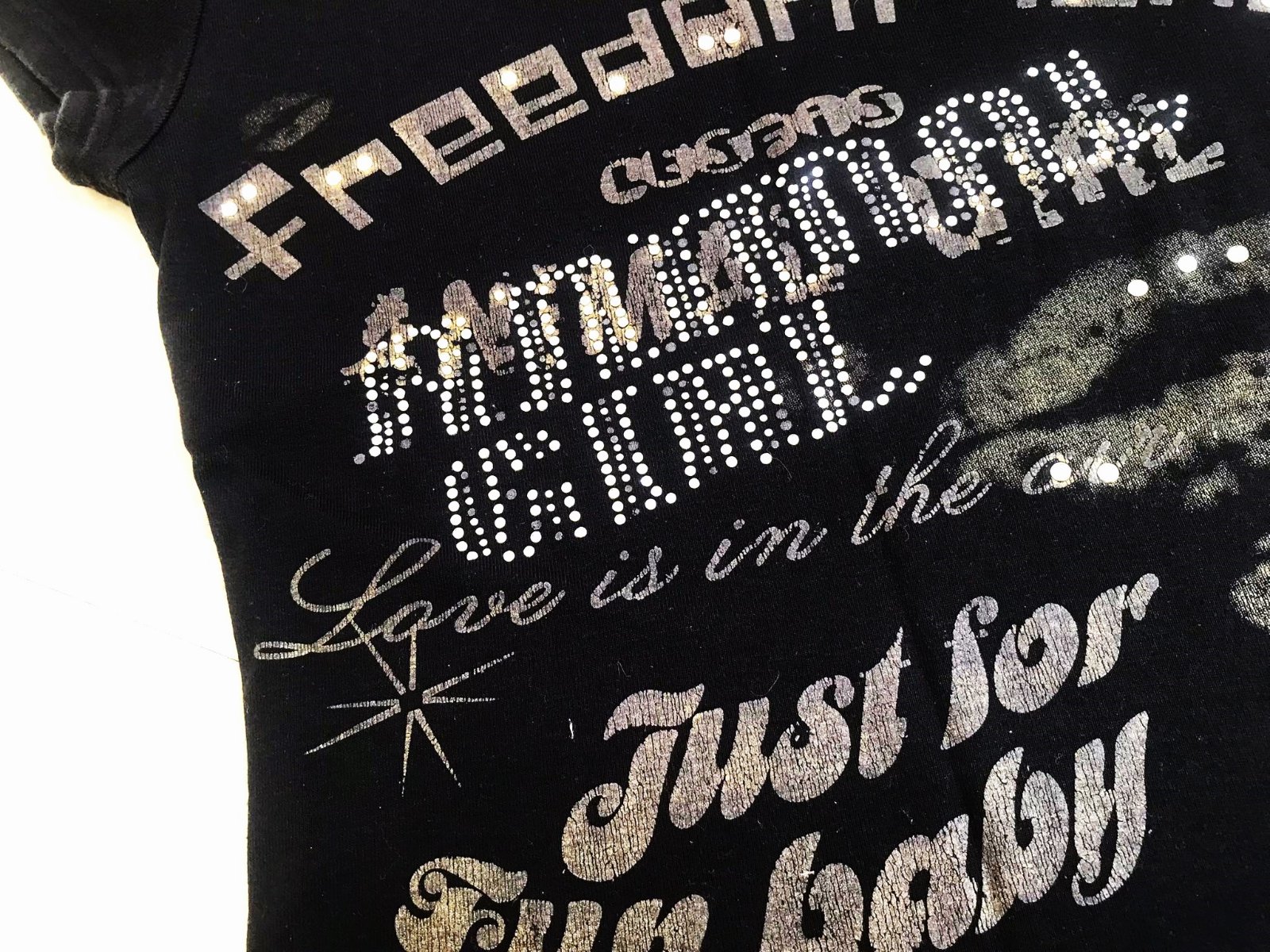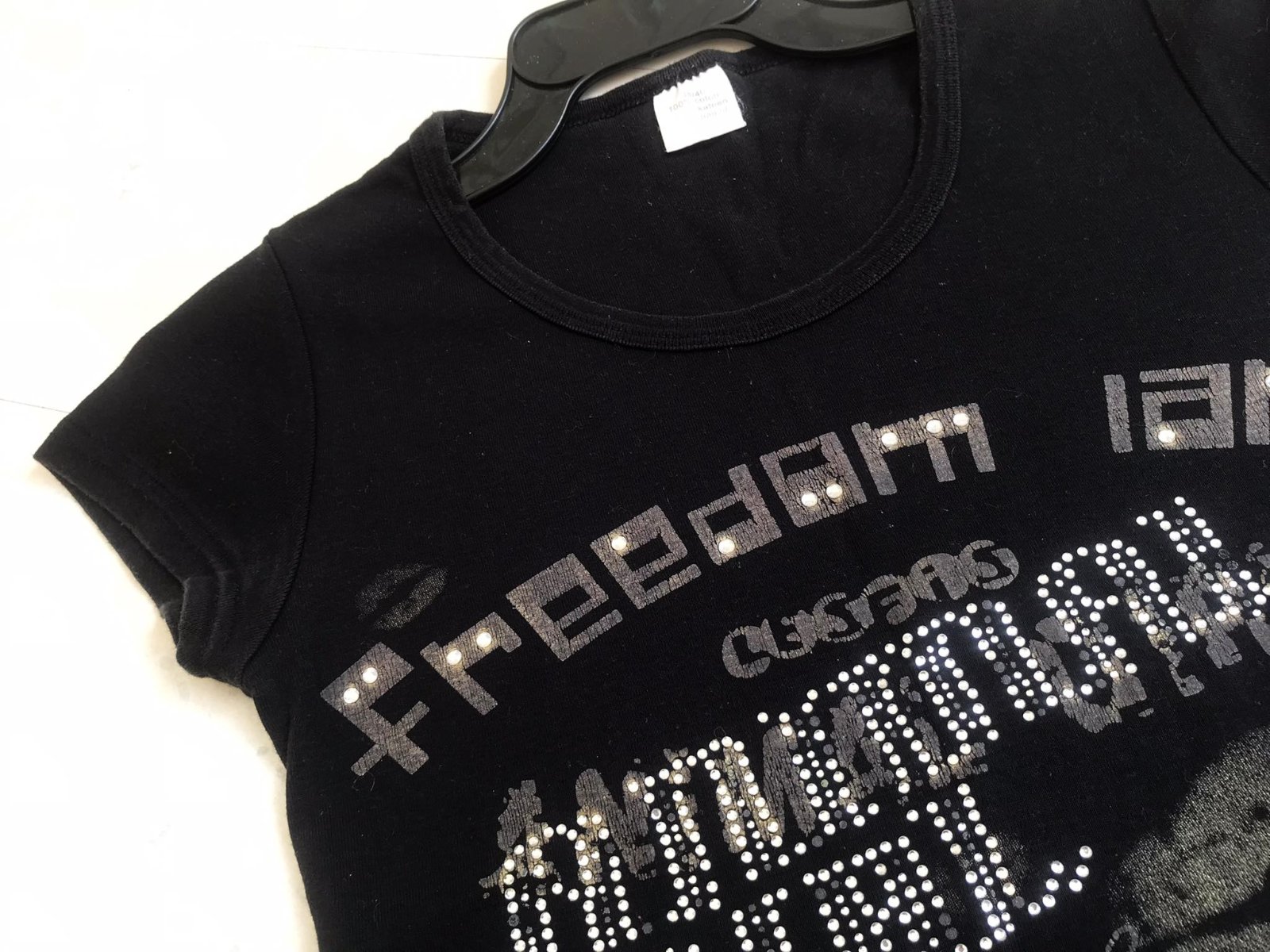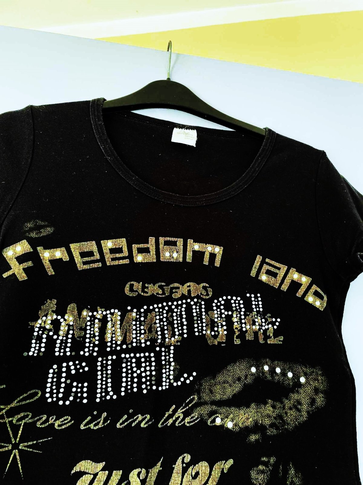 zaujímavé tričko,hrubšie,pevnejšie,100% bavlna,vybíjané - s trblietavými kamienkami vpredu,dlžka = 64 cm,šírka = 50 x 2 cm,dlžka = 65 cm,šírka = 42/43 x 2 cm,veľkosť 38/40