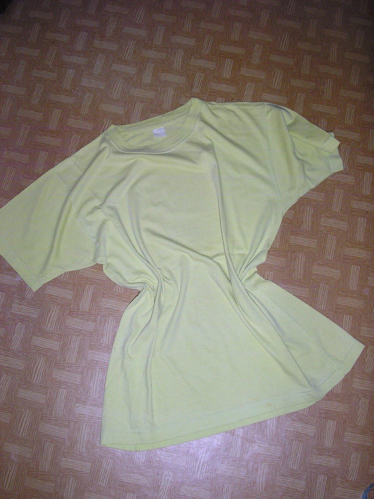 Farba: zeleno-žltá. Okrúhly výstrih, krátke ruk., rovný dolný okraj. Zachovalý kus. Na fotke, kde sú 2 ks, to je ozajstná zel.-žl. farba.