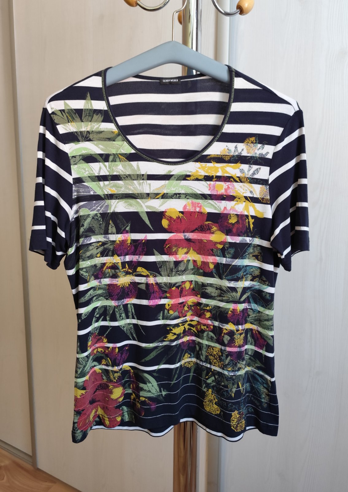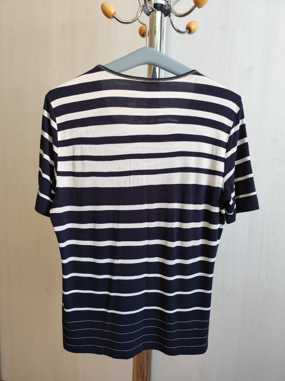 Nosené dámske elastické tričko v dobrom stave. Cez prsia 2 x 52 cm, povolí o 2 x 7 cm. Dĺžka 69 cm. Oblečie aj XL (obtiahnuté).