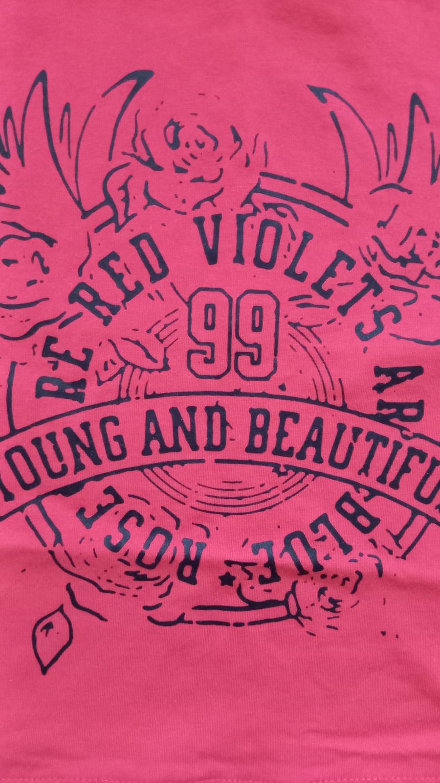 Tričko malinovej farby v kombinácii s madeirou na rukávoch a vrecku, bez poškodený. Párkrát oblečené.