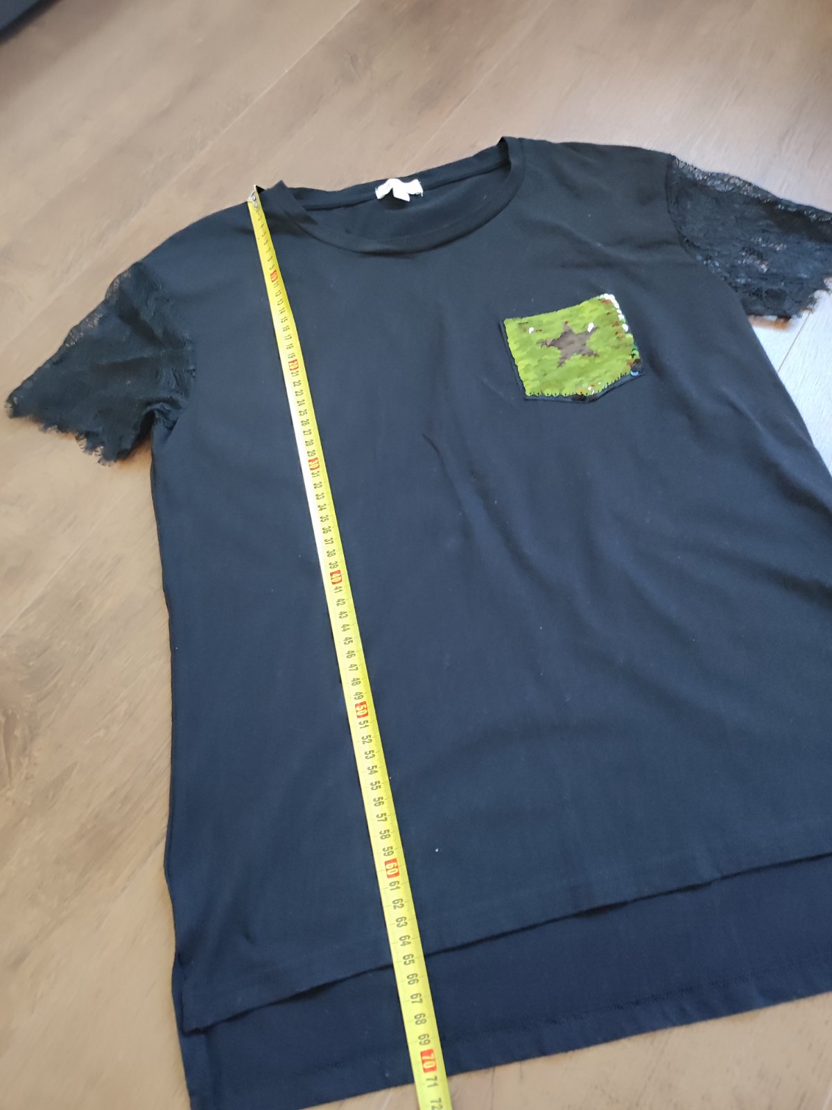 Suprové sexi tričko čiernej farby s trblietavým nápisom a na bokoch stiahnuté. Kvalitný elastický materiál. P.c. 21€ ROZMERY: S: š cez prsia = 2x38cm, pás = 2x32cm, d = 66cm.....L: š cez prsia = 2x...