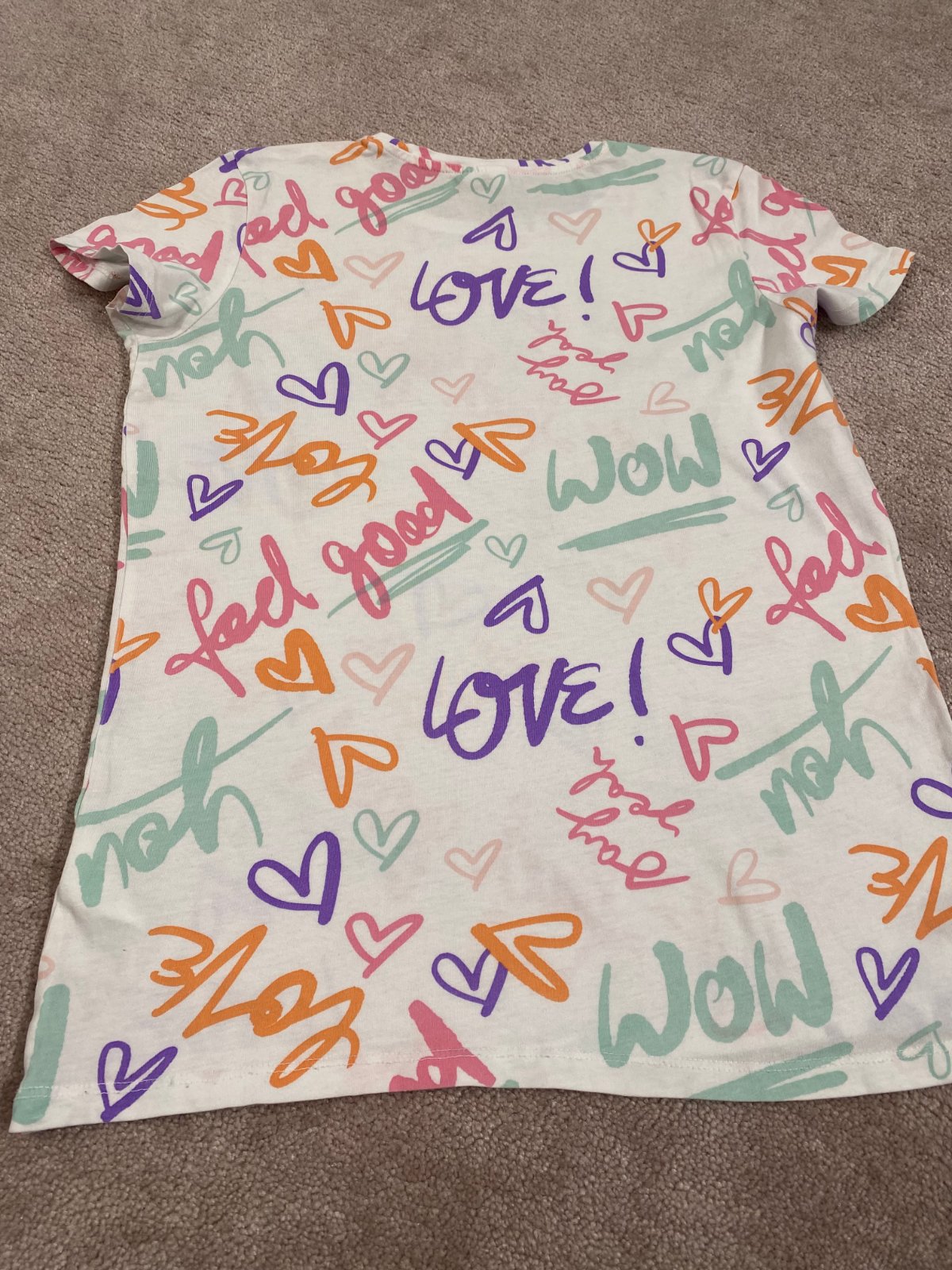 Biele tričko s jemnými farebnými popismi. Dĺžka je 58 cm, šírka je 43 cm. Tričko je v úplnom poriadku