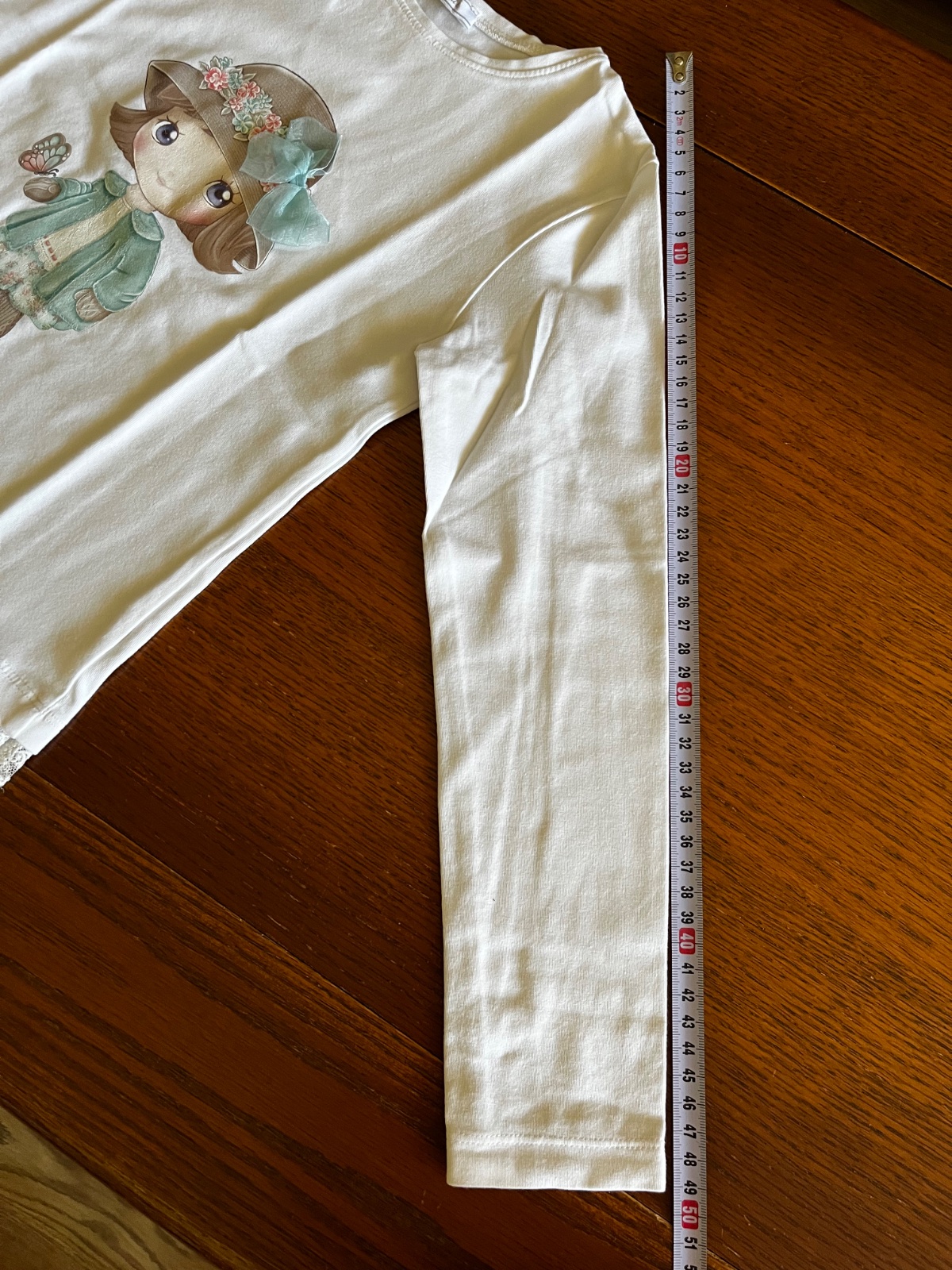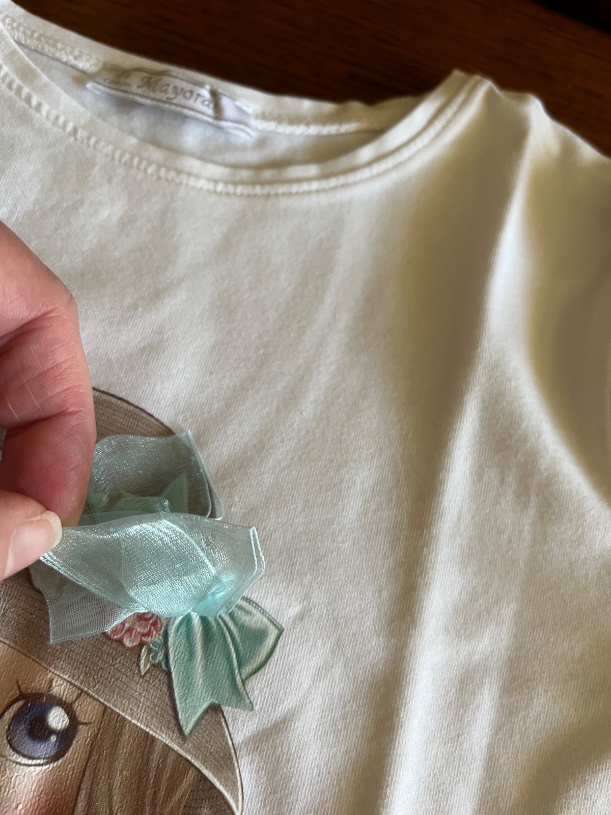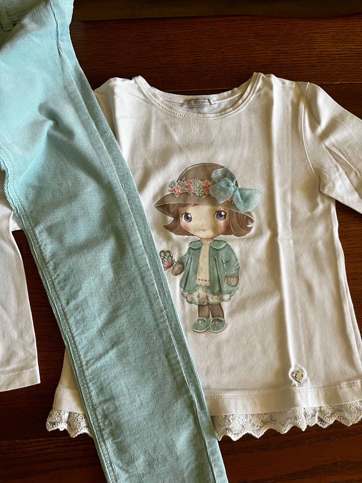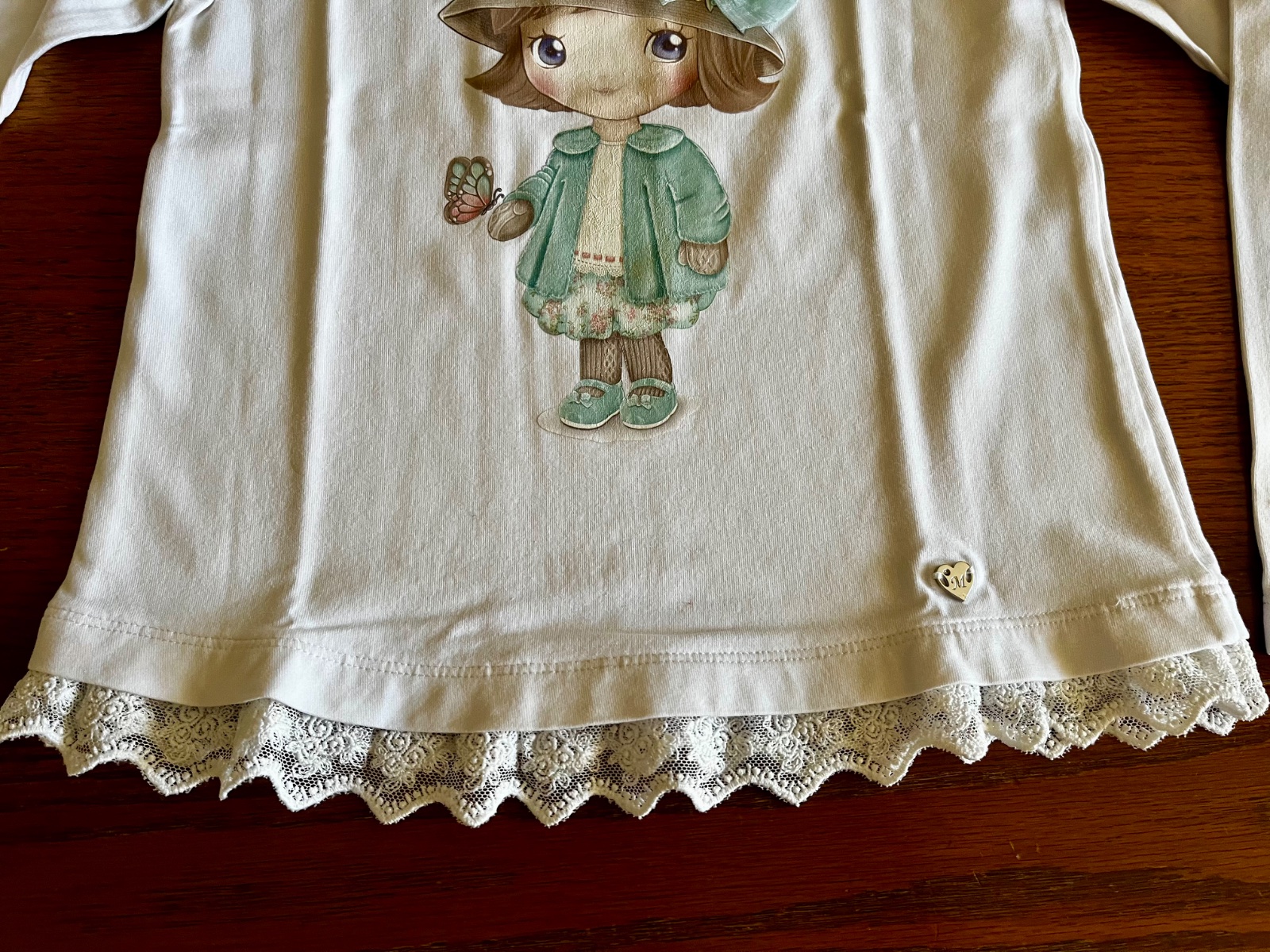 Naspodku kovová platnička Mayoral a ozdobná čipka.