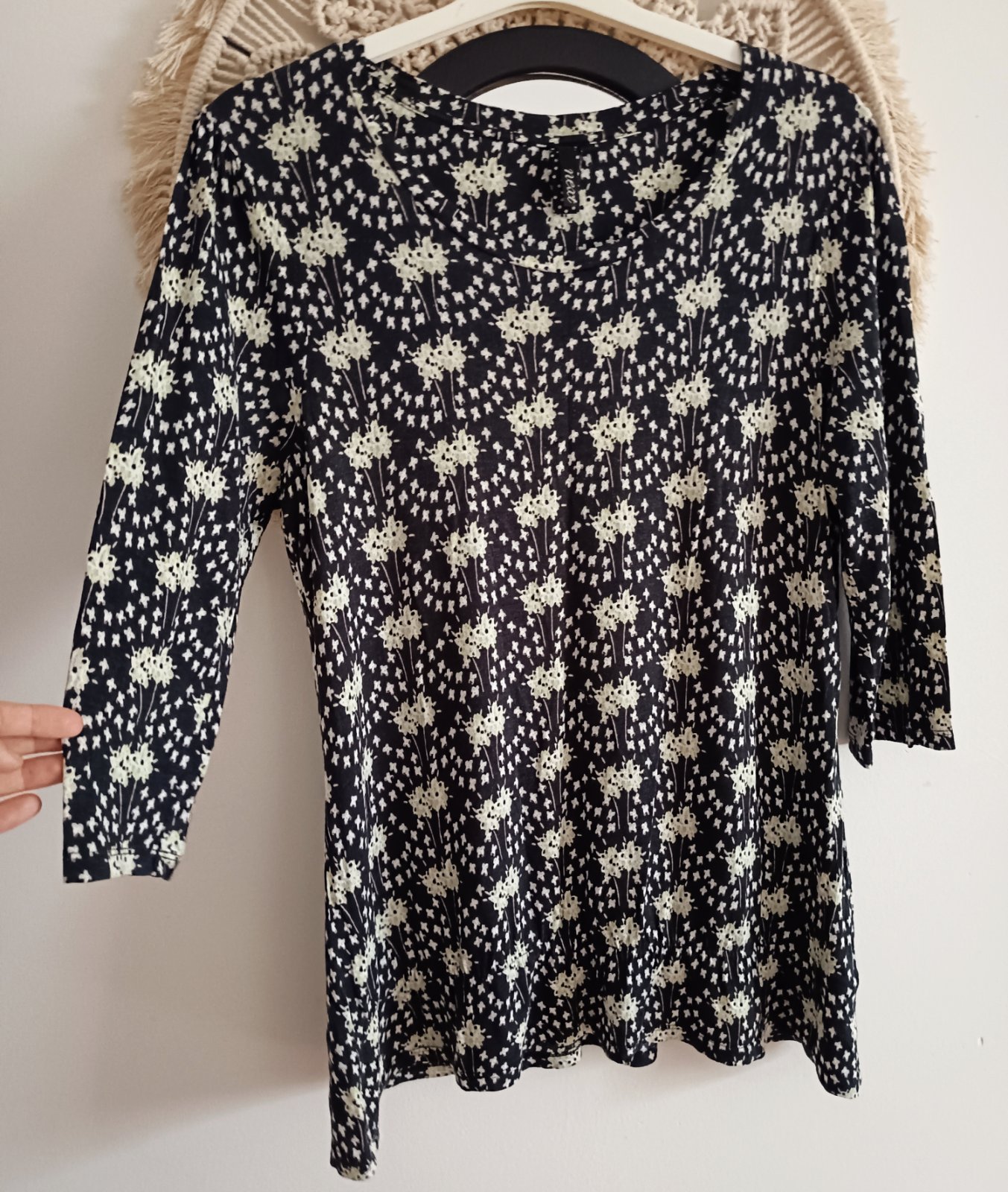 Predám bodkované dámske tričko. Je veľmi pohodlné, z príjemného nekrčivého materiálu. Rukáv 3/4. Farba čierna, biela. Veľkosť 44/46.