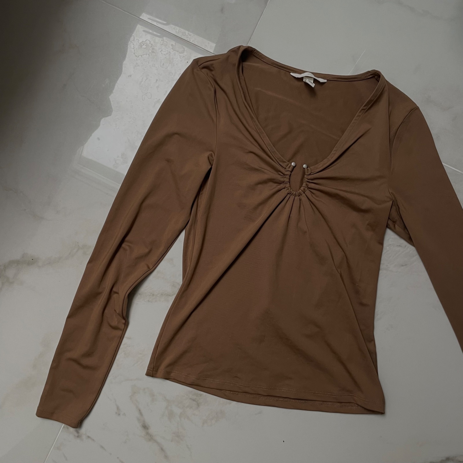 Elegantný hnedý top od značky H&M v nadčasovom strihu, ktorý krásne zvýrazní dekolt. Jemné riasenie v oblasti výstrihu s kovovými detailmi dodáva ženský a sofistikovaný vzhľad. Príjemný, elastický materiál sa pekne prispôsobí postave a pohodlne sa nosí počas celého dňa.