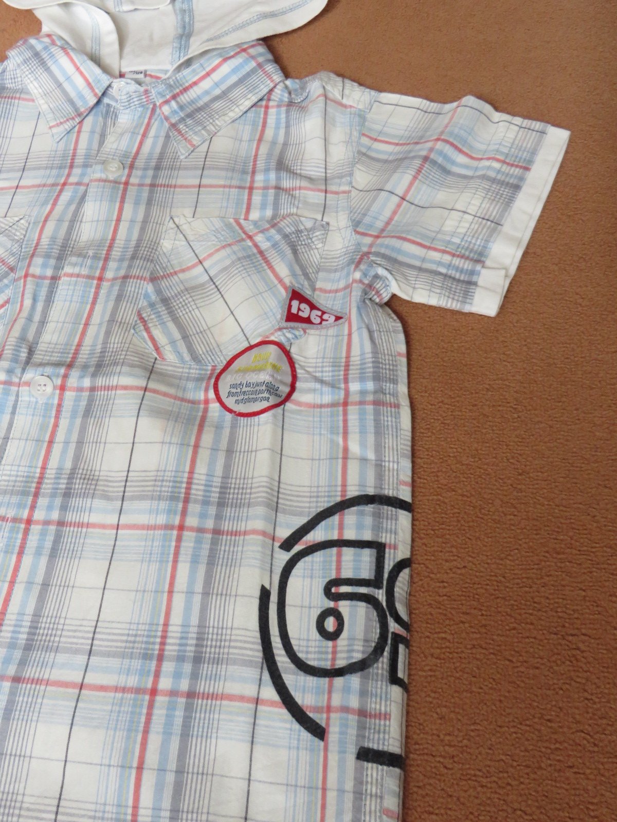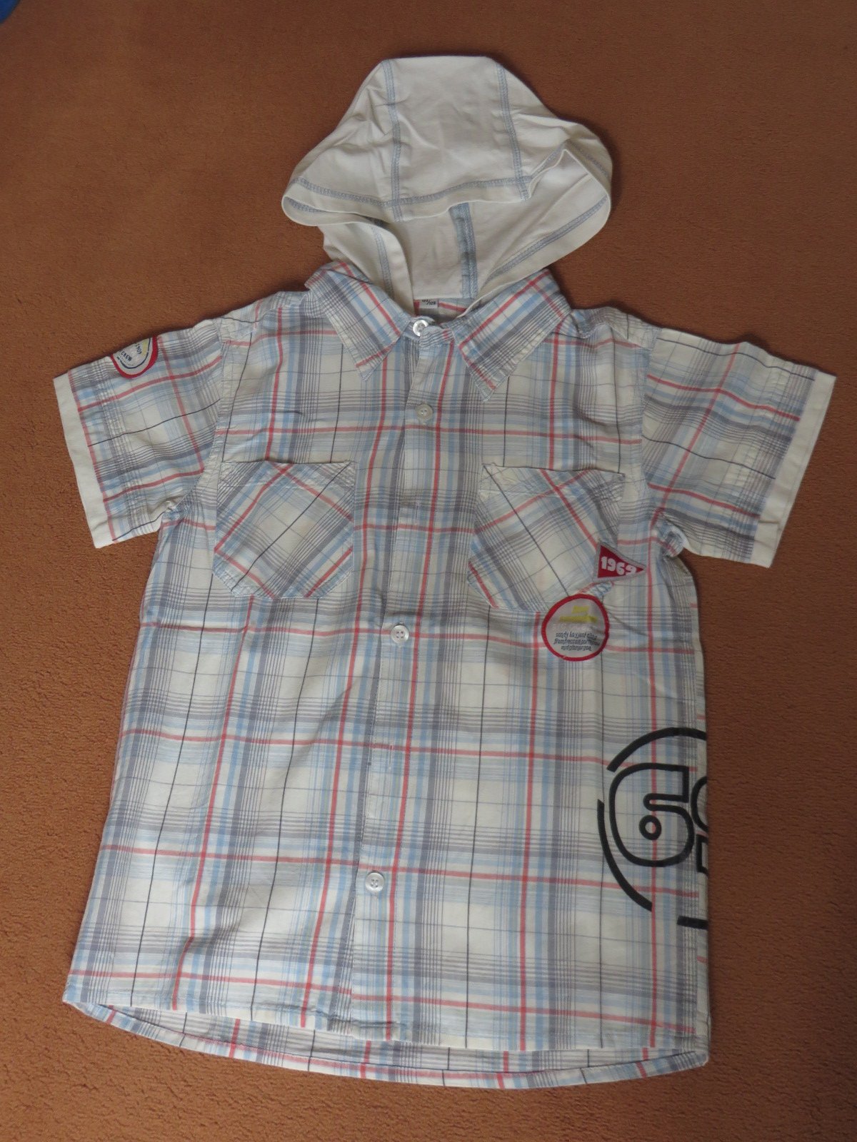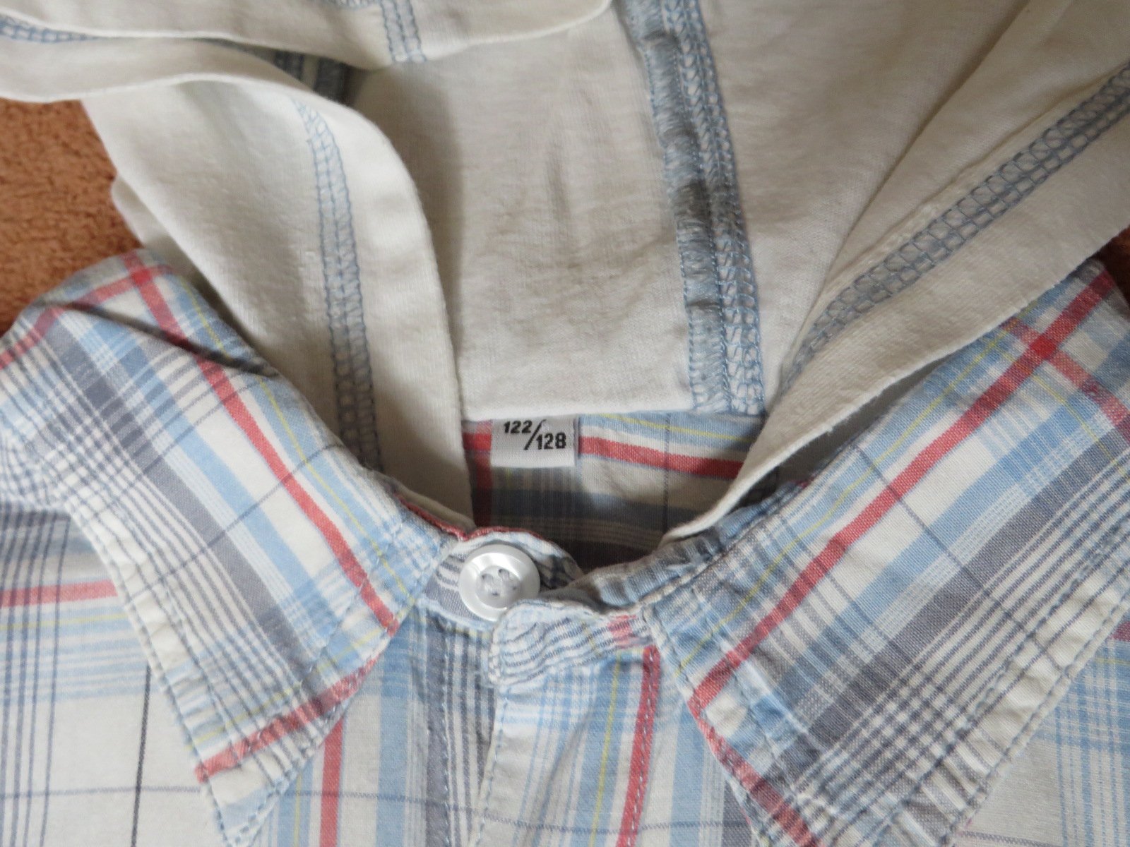 1/ bielo modrá košeľa - veľ. 122/128 s kapucňou - cena 2,70€