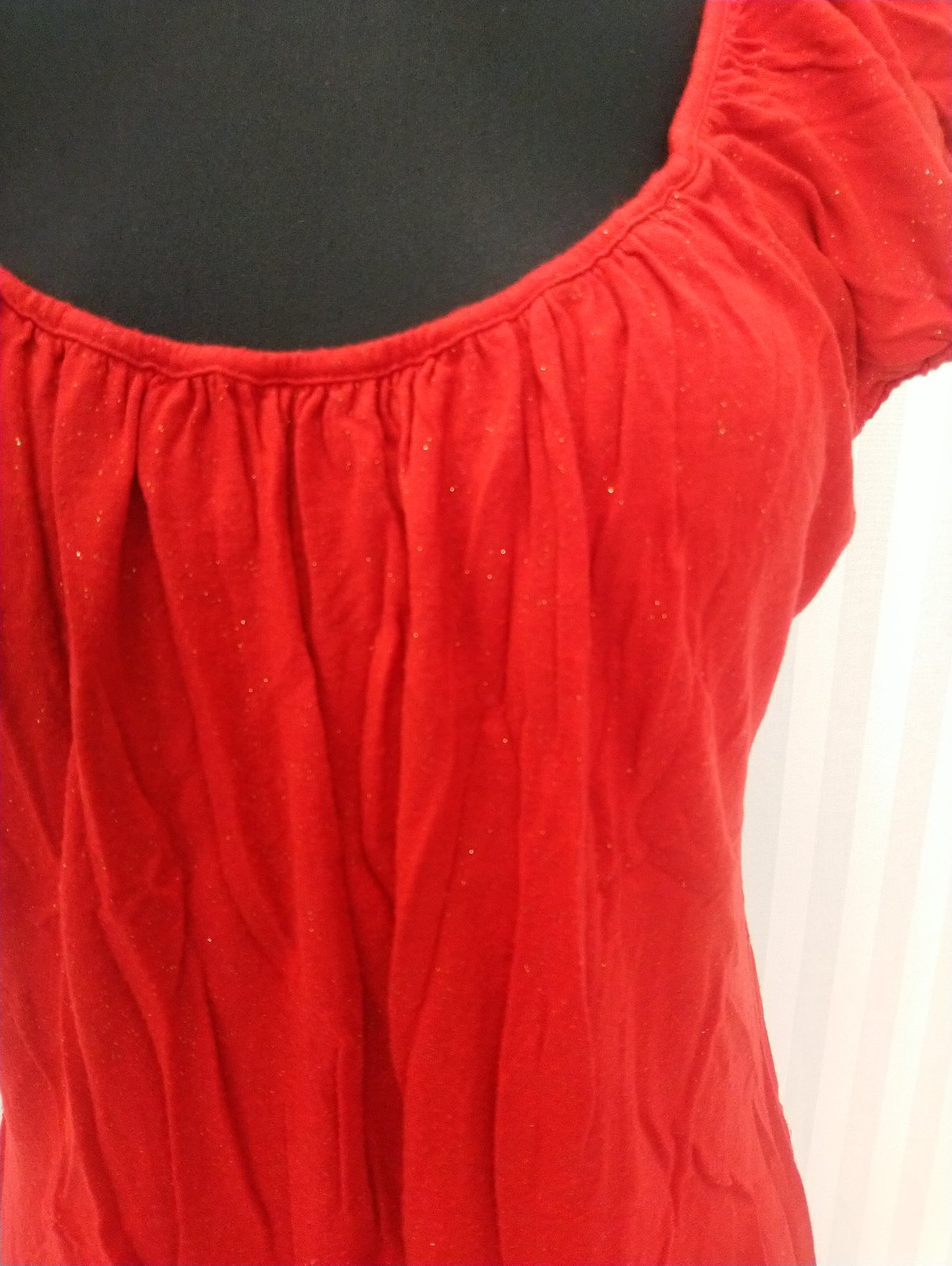 dámsky červený top so zlatým leskom, výstrih a rukávy nariasené do gumičiek,