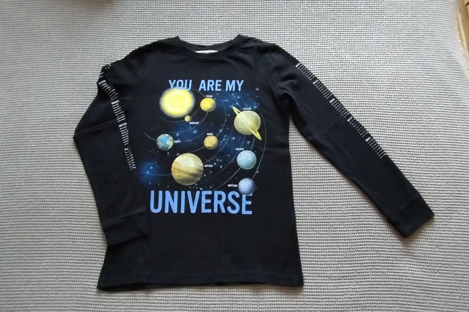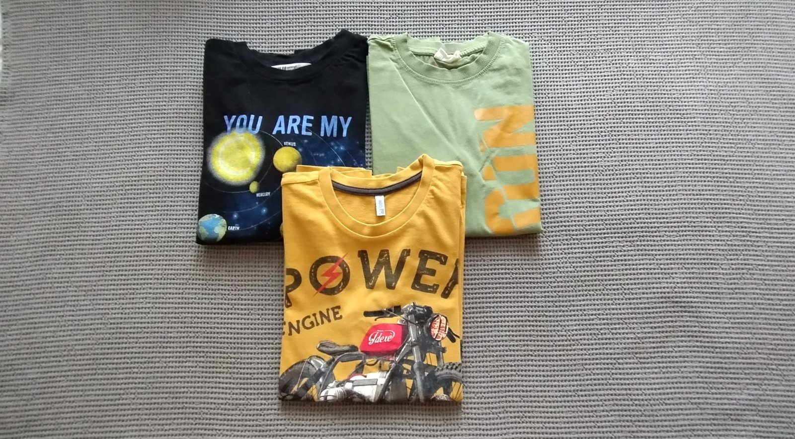 3 x bavlnené tričká v super stave, dvojčíslo 134/140. Čierne slnenčná sústava zn. HM, zelené zn. Reserved, žlto-okrové zn. Rebel.